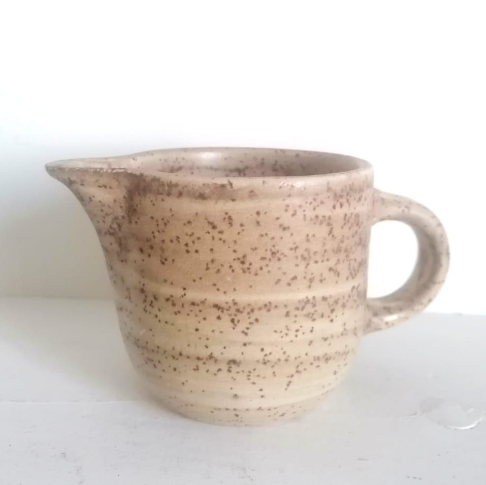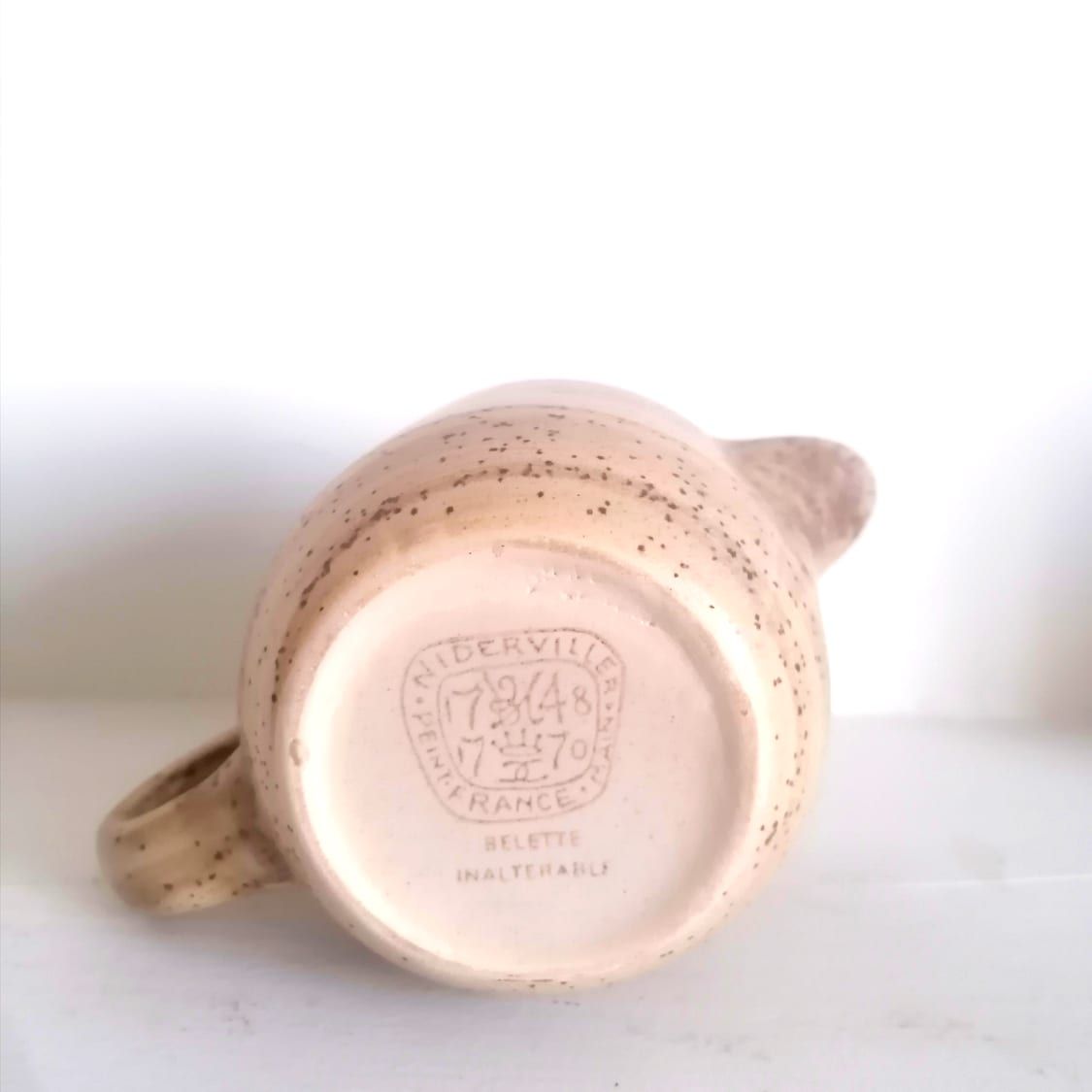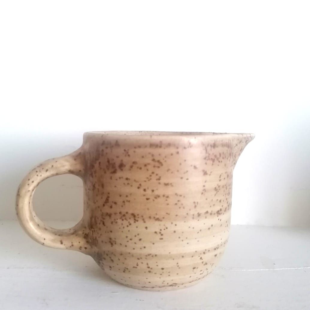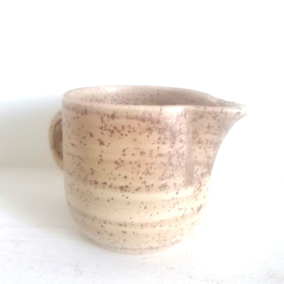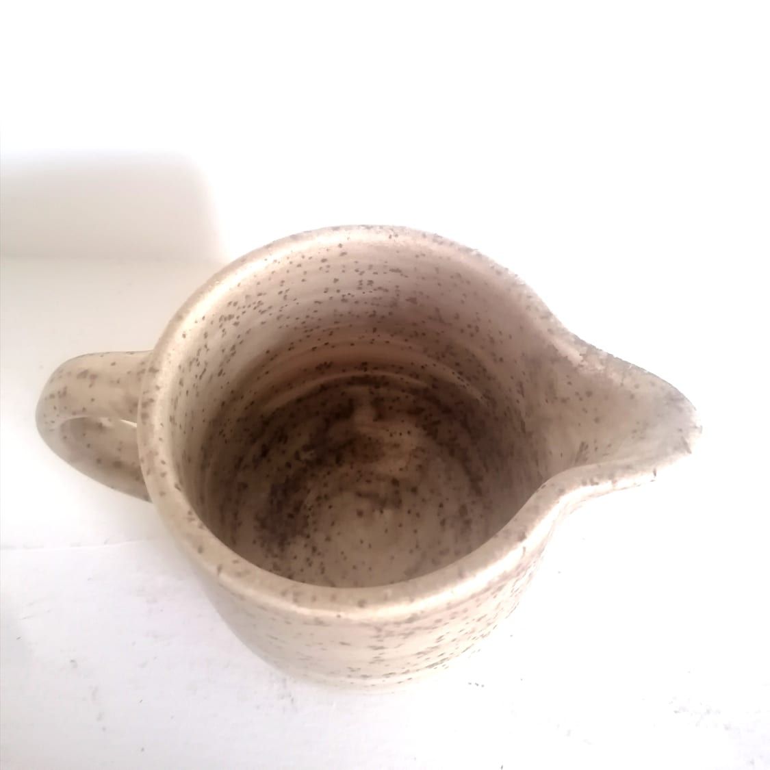 Faïencerie Nidervillers, France (Lorraine), petit pichet ou pot à lait en grès moucheté. Email de couleur beige, anse latérale et bec verseur. Travail des années 1950 / 1960