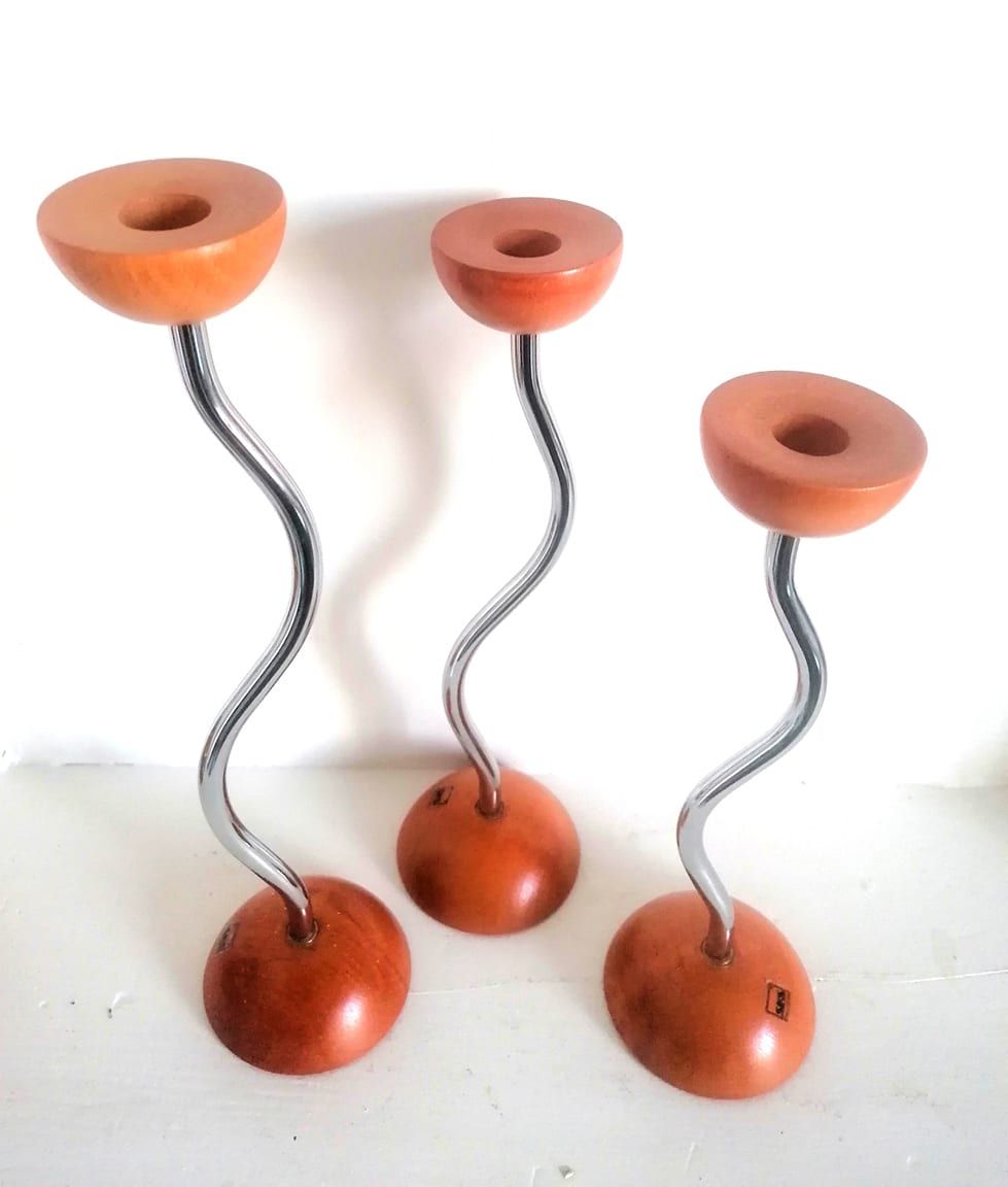 Lot de trois bougeoirs en bois et métal argenté. Socles et bobèches ronds de forme conique, en buis. Les trois socles portent leur étiquette d'origine : SKS made in Germany, pour la manufacture de l'ancienne Allemagne de l'ouest.