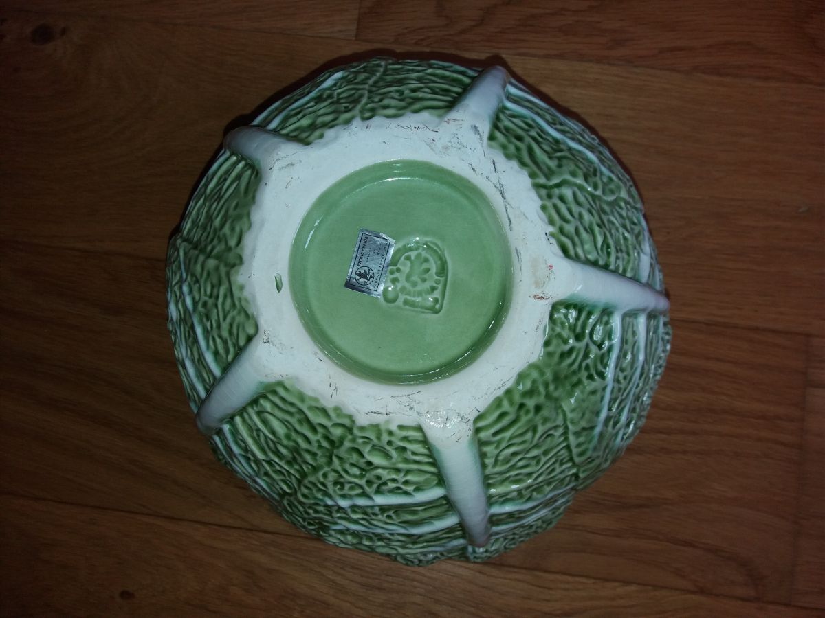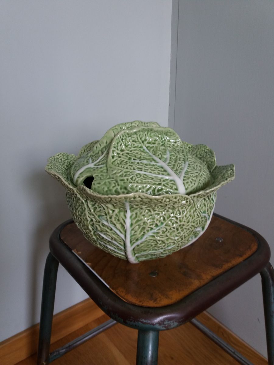 Très jolie soupière en forme de chou, de couleurs vert tendre et blanc, avec de beaux détails en relief très réalistes : les nervures, la texture des feuilles. Elle doit dater des années 70 ou 80. Elle a été fabriquée au portugal dans la célèbre faïencerie bordallo pinheiro créée en 1884 et qui existe toujours ! Dessous, on peut voir l'estampille de la faïencerie et même encore une petite étiquette pour la vente en france. Le couvercle comporte une « encoche » permettant de laisser la louche à l'intérieur tout en fermant le couvercle. Cette soupière est en plutôt bon état extérieur: quelques petites égrenures dont la seule visible se trouve sur le pourtour intérieur du contenant (invisible avec le couvercle donc), les quelques autres, situées sur le pourtour extérieur, sont invisibles, détectables uniquement au toucher. L'intérieur présente des signes d'utilisation: vernis estompé au fond, émaillage craquelé et des taches, certaines incrustées dans les craquelures de l'émaillage. Elle mesure 27 cm de diamètre environ pour une hauteur, couvercle compris, de 19 cm. Elle pèse 1, 8 kg.