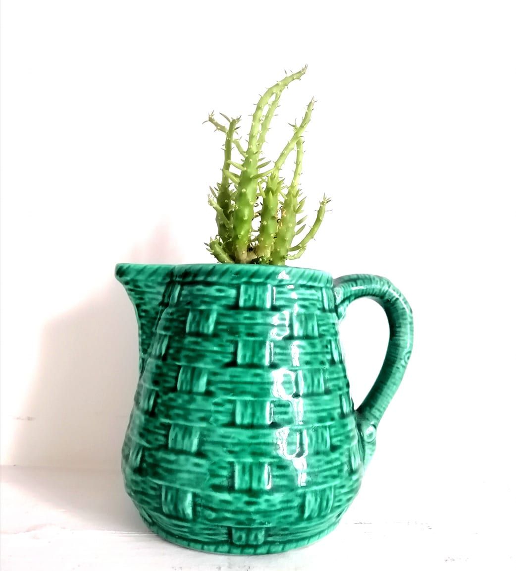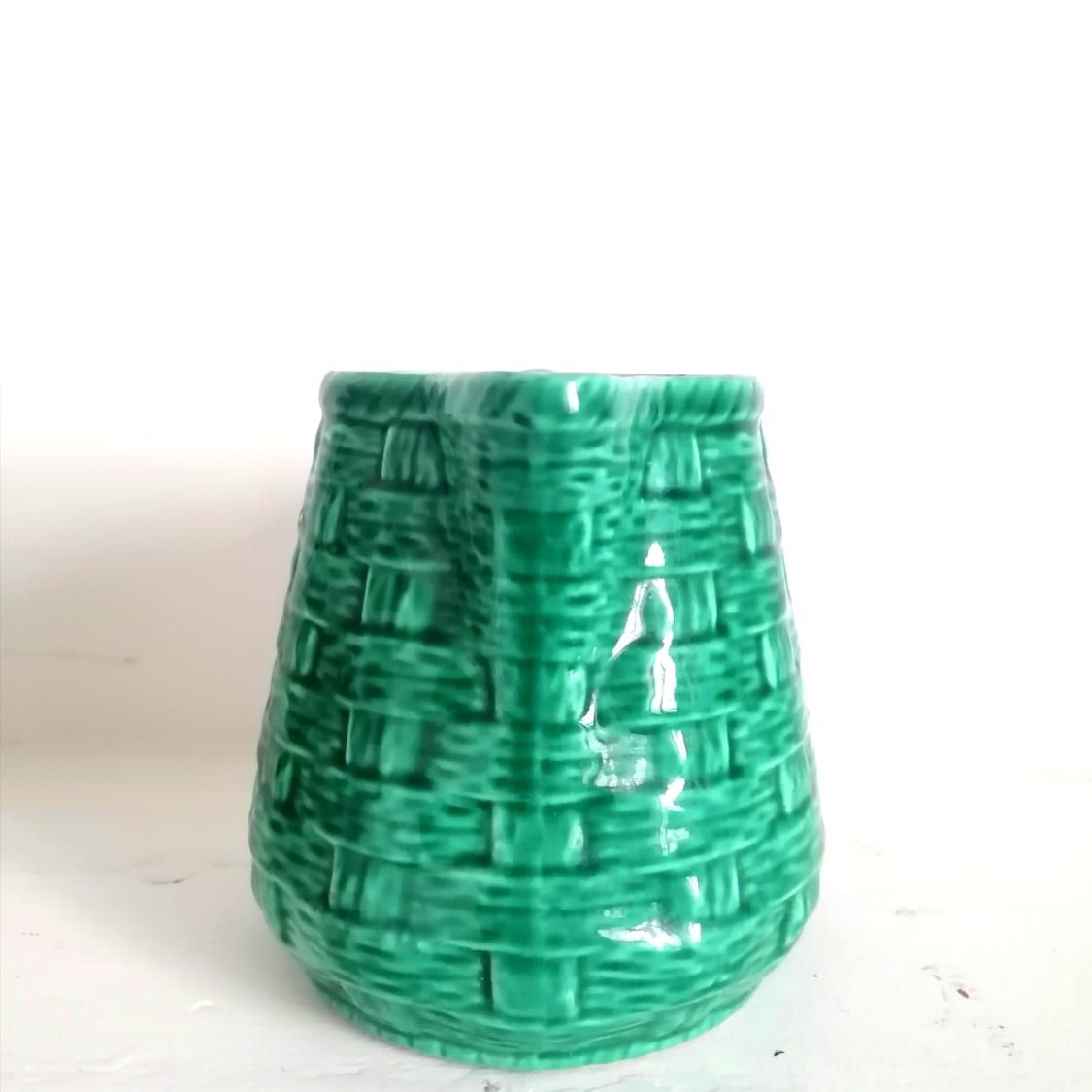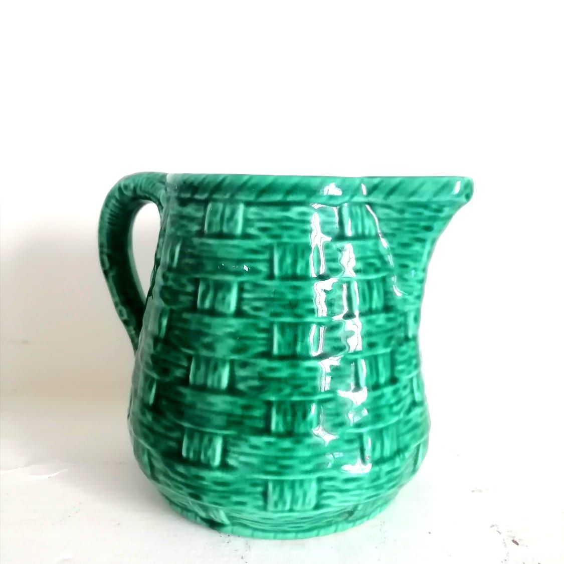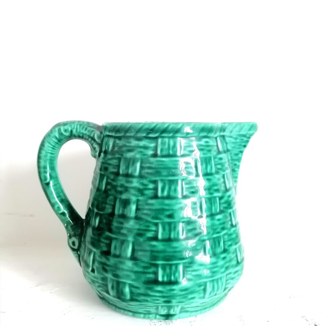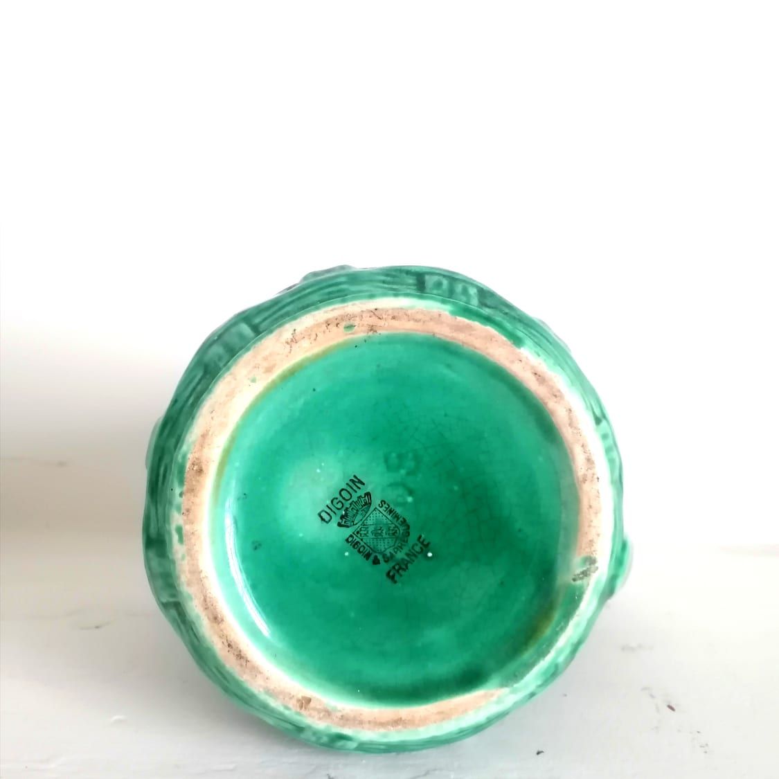 Pichet en barbotine émaillée vert, manufacture Digoin Sarreguemines (marque au revers), décor de vannerie.