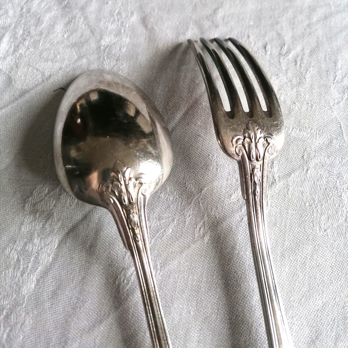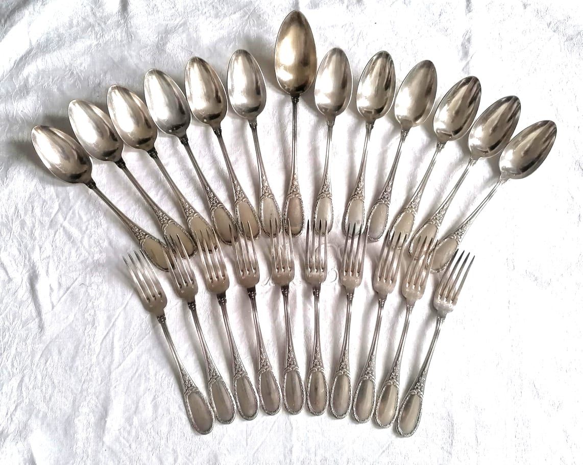 Ensemble de 23 pièces : une cuillère de service, 12 cuillères de tables et 10 fourchettes de table.