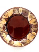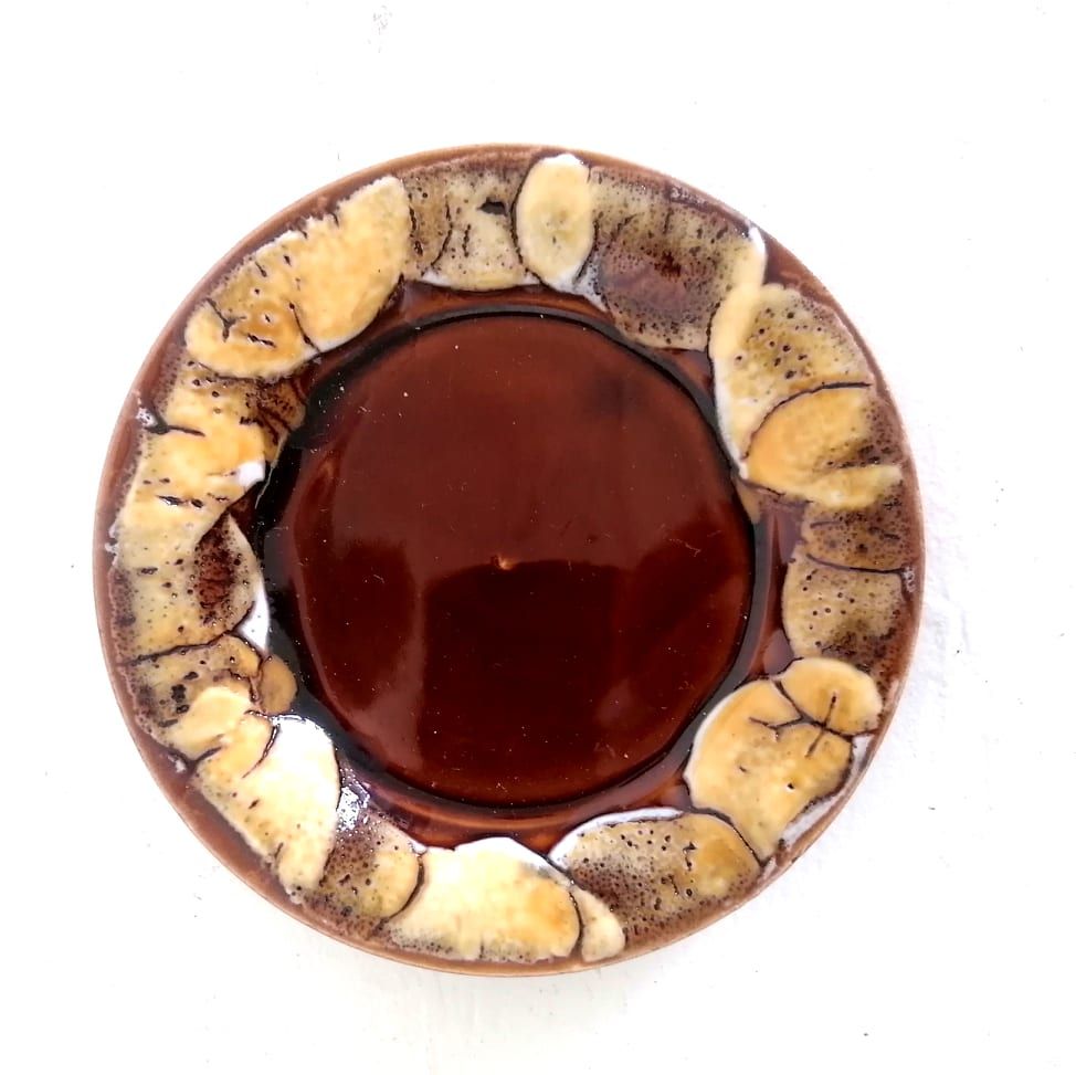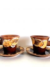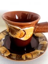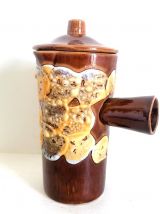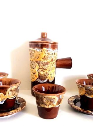 Service à café moderniste de style Vallauris. Céramique émaillée marron à décor fat lava (ou écume de mer) jaune et blanc en relief.