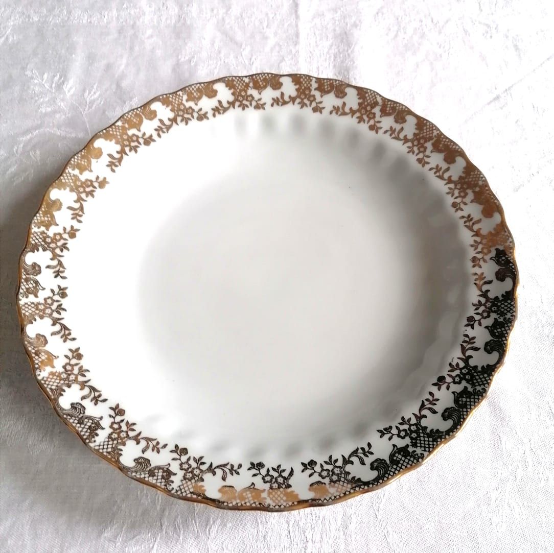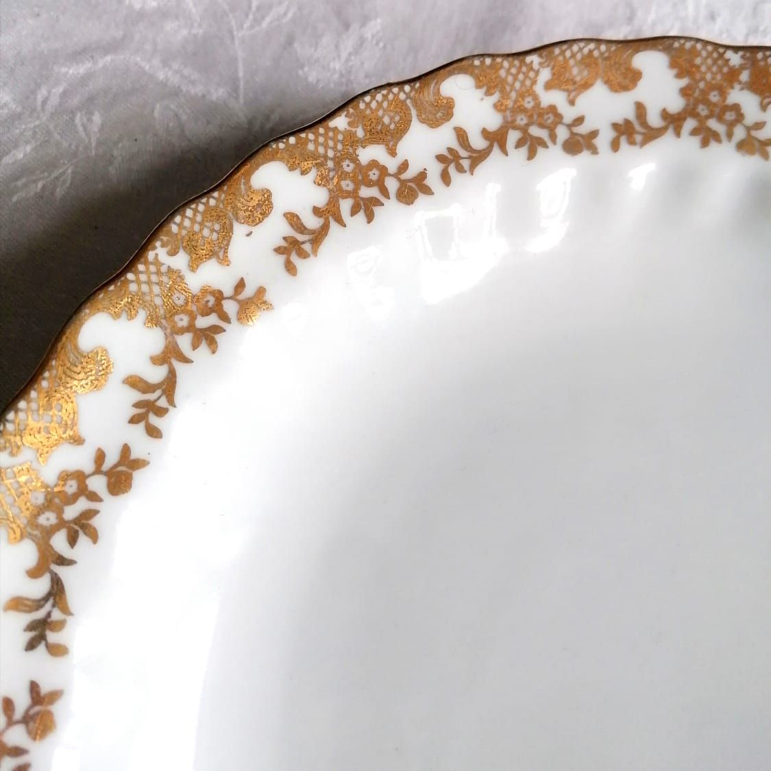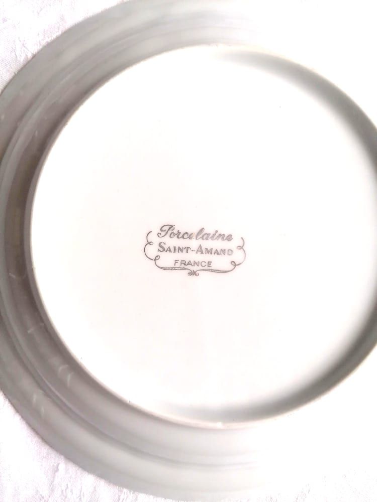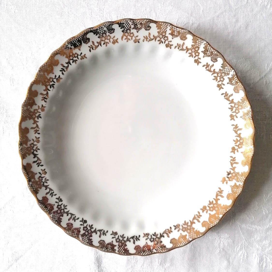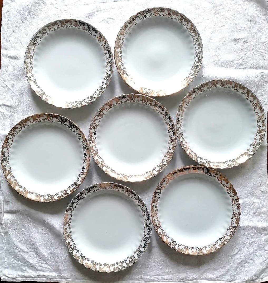 Lot de sept assiettes en porcelaine de Saint Amand blanche décorées à l'or. Modèle creux à contour gauffré, décor floral doré très raffiné.