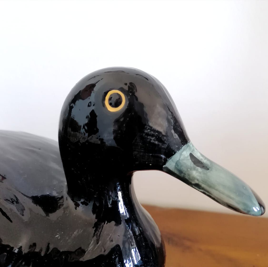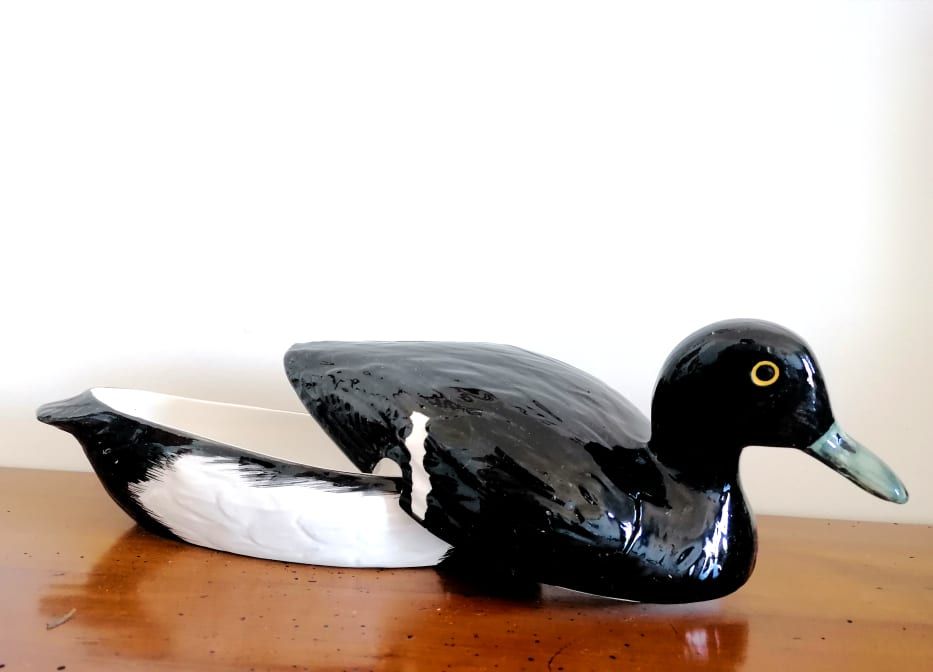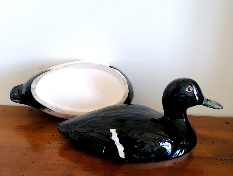 Terrine en porcelaine blanche zoomorphe, en forme de canard. Décor des plumes en noir et gris, yeux jaunes. Trous pour l'emplacement du couvert de service dans l'aile.