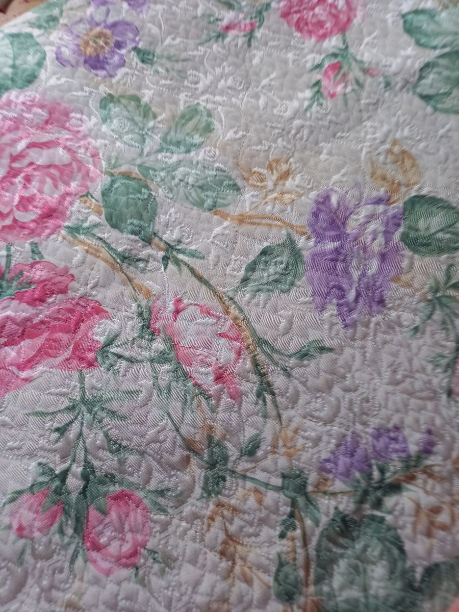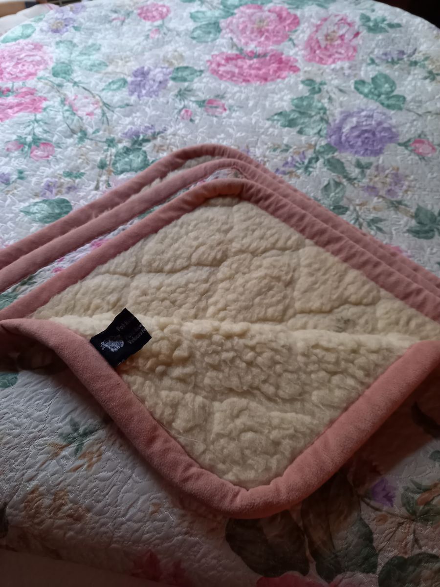 Grand plaid / couvre lit en satin ivoire broché double de pure laine de mouton et gansé de velours vieux rose