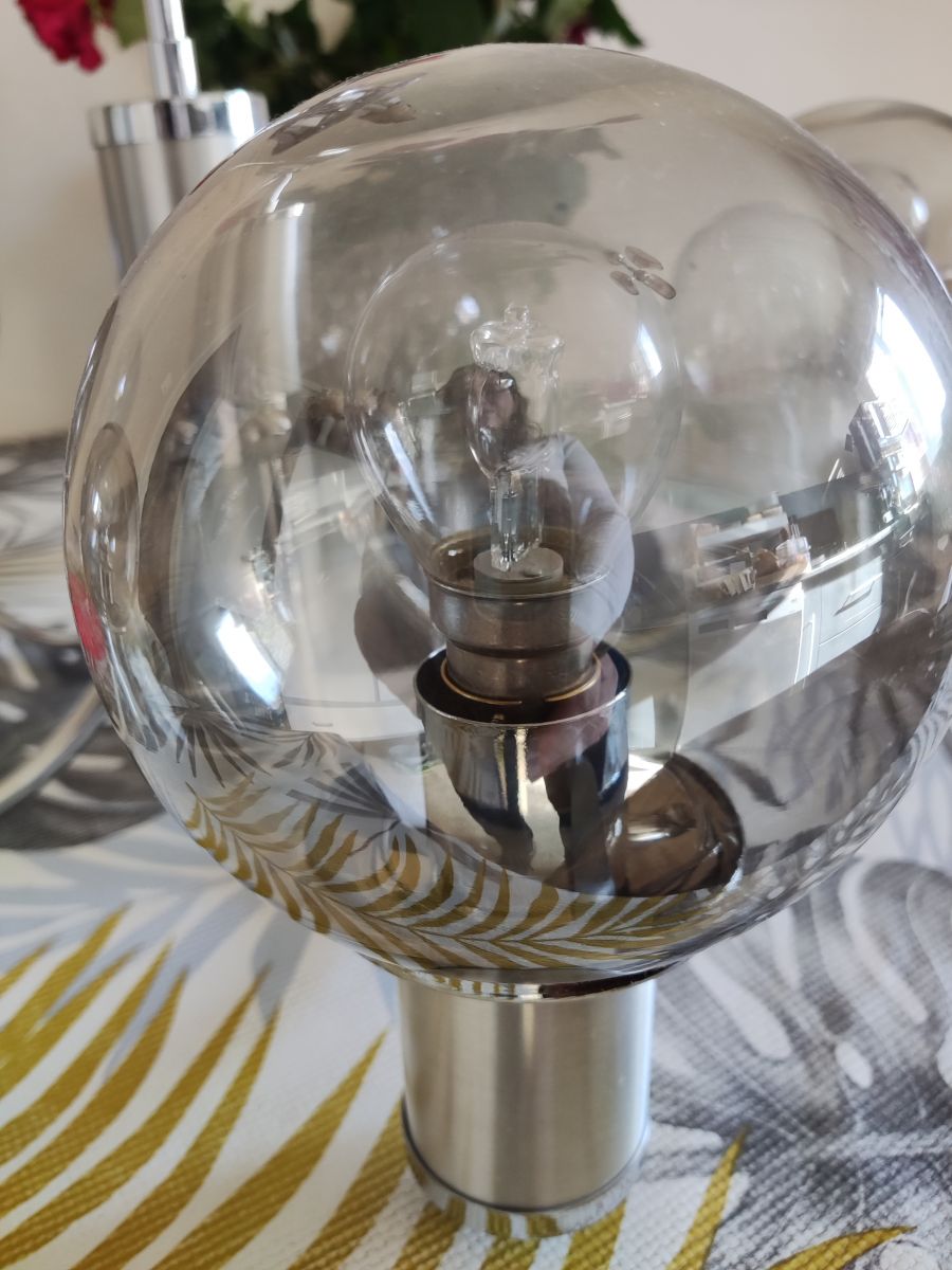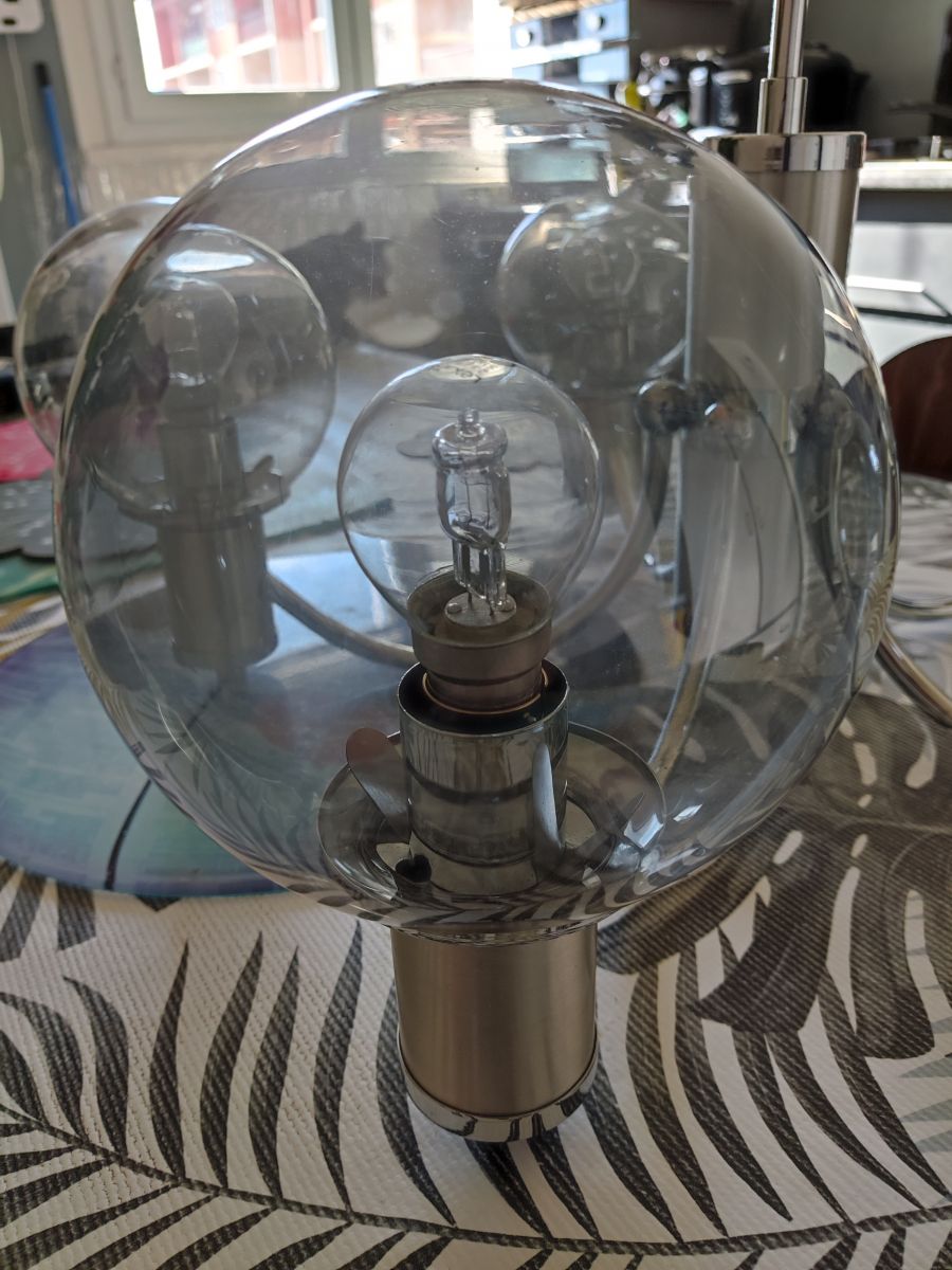 lustre 5 feux space age en métal chromé et globes en verre fumé