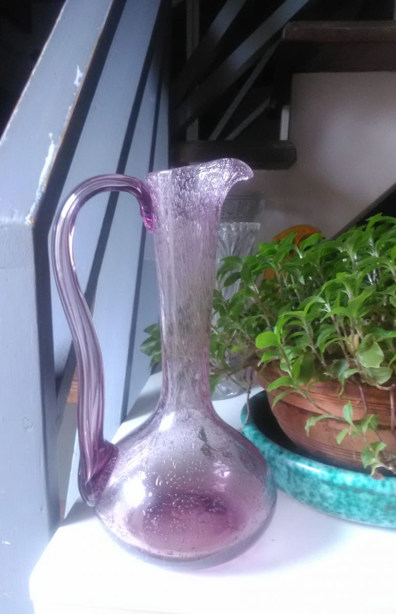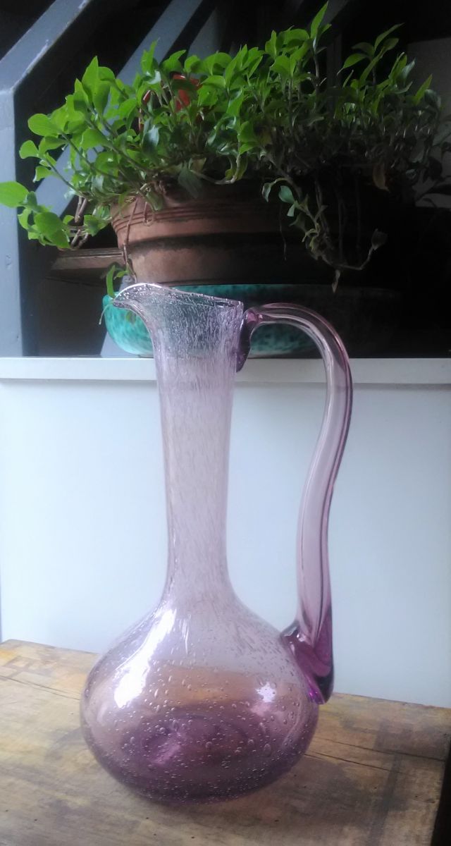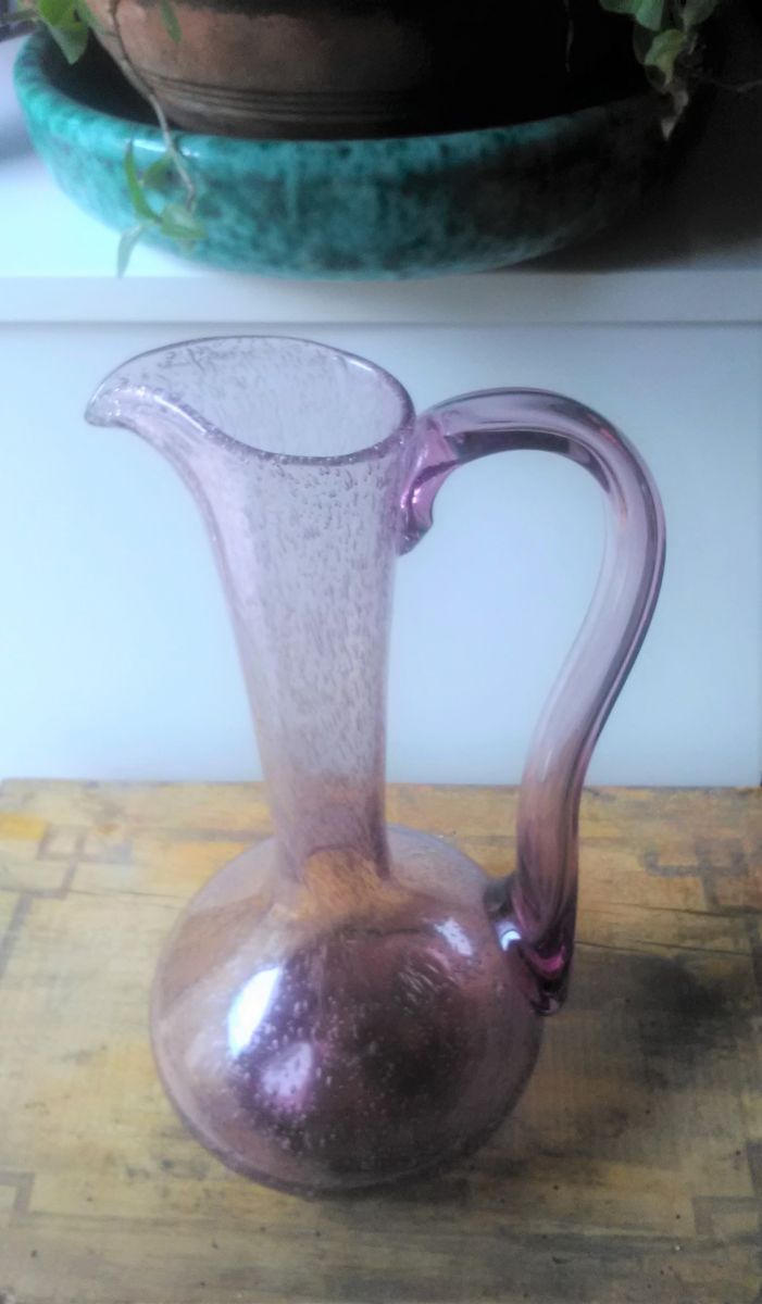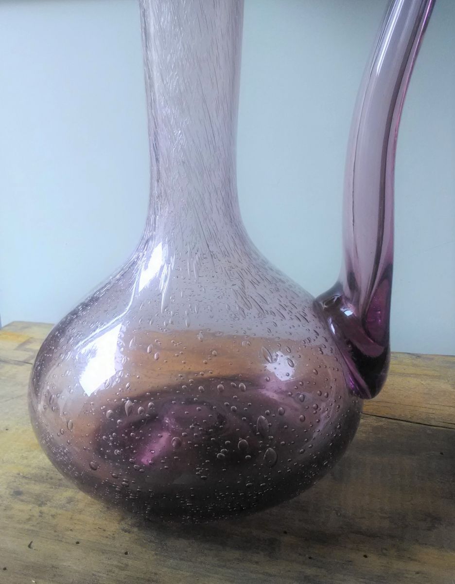 Jolie carafe en verre soufflé à la bouche rose (années 50)