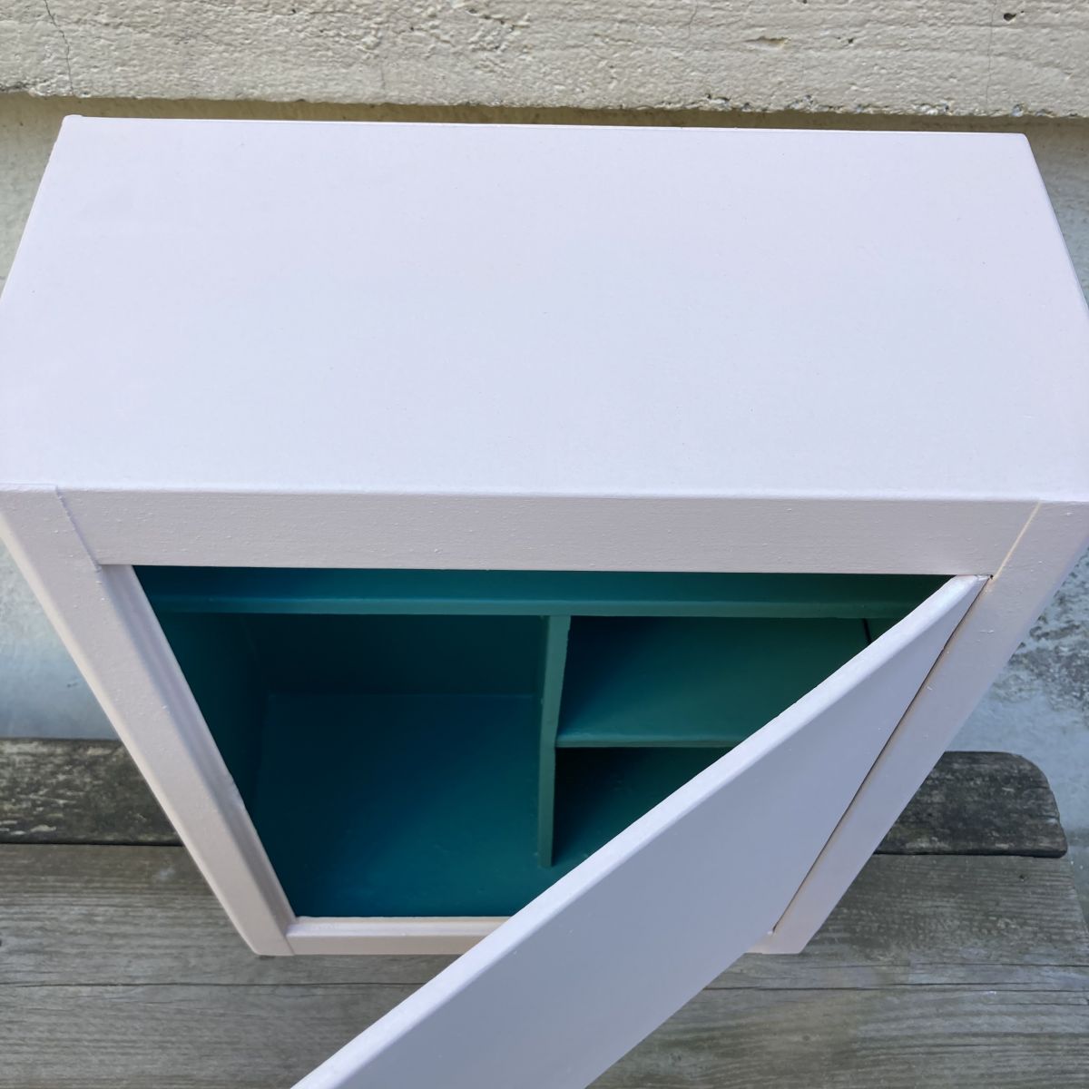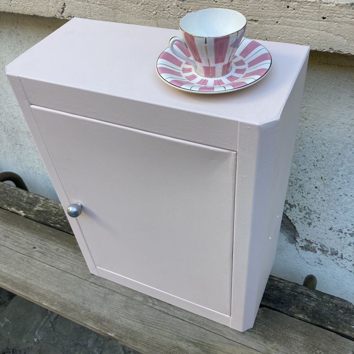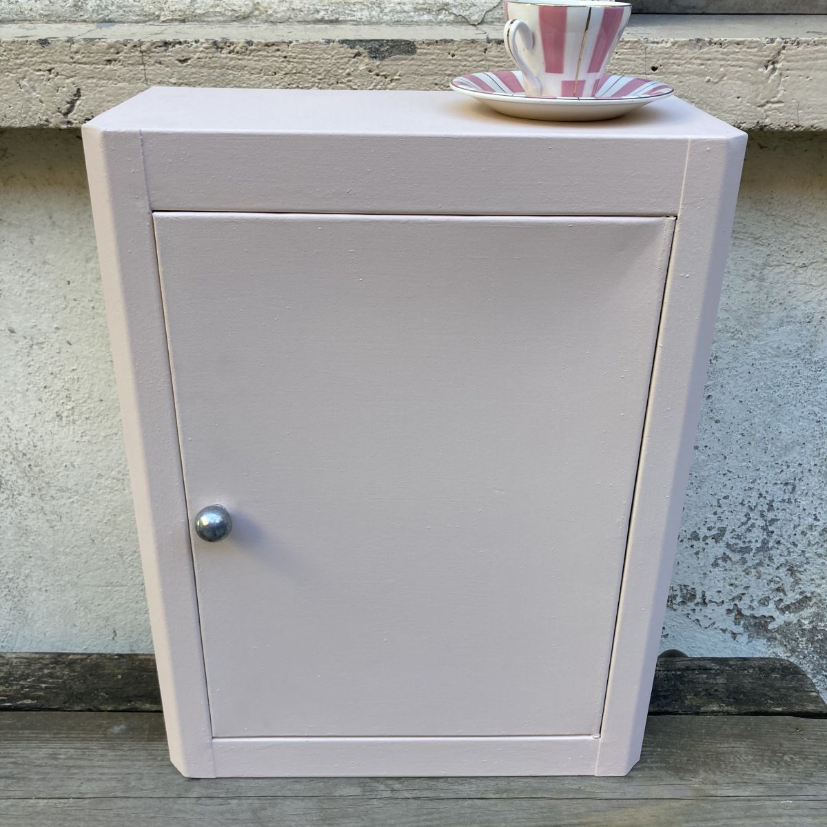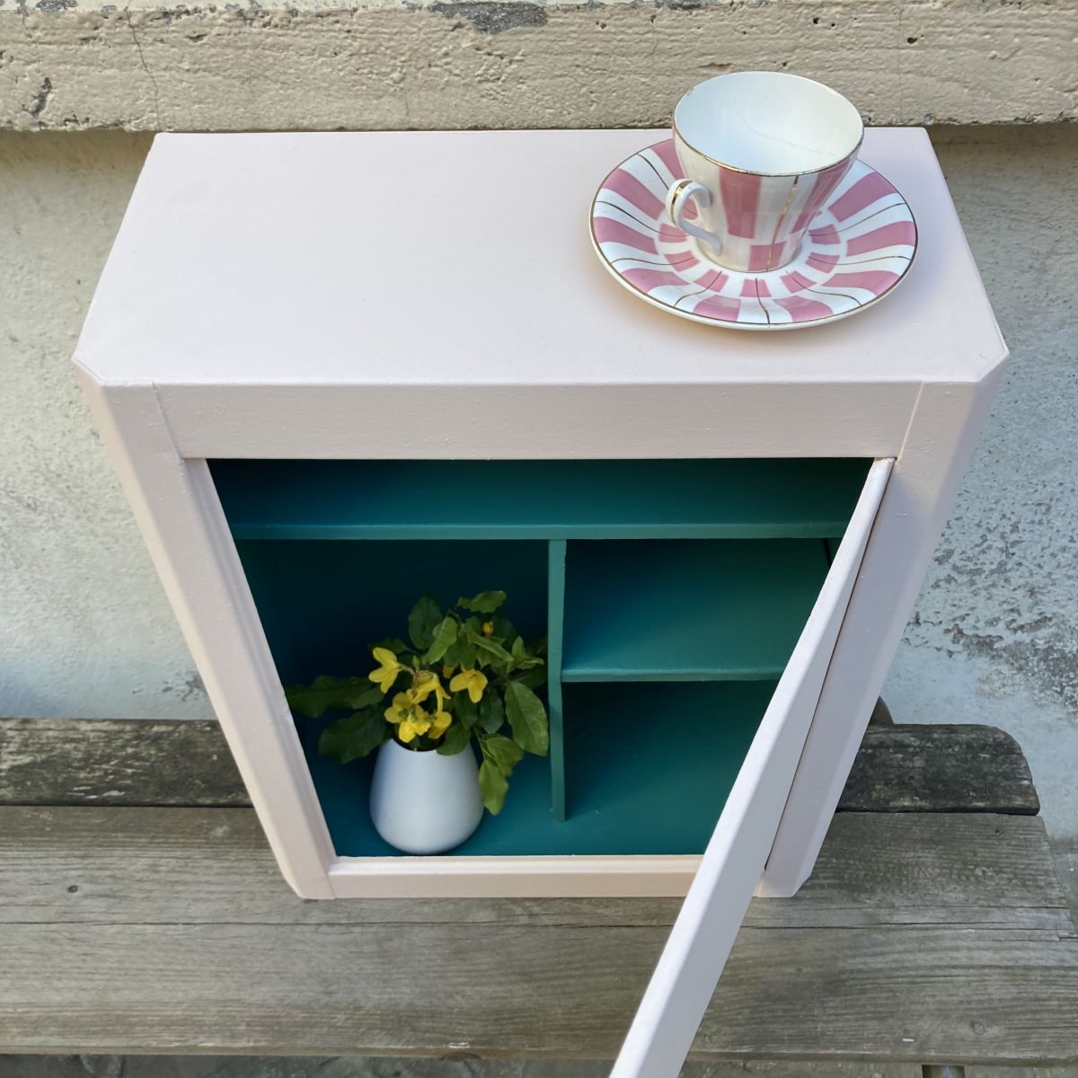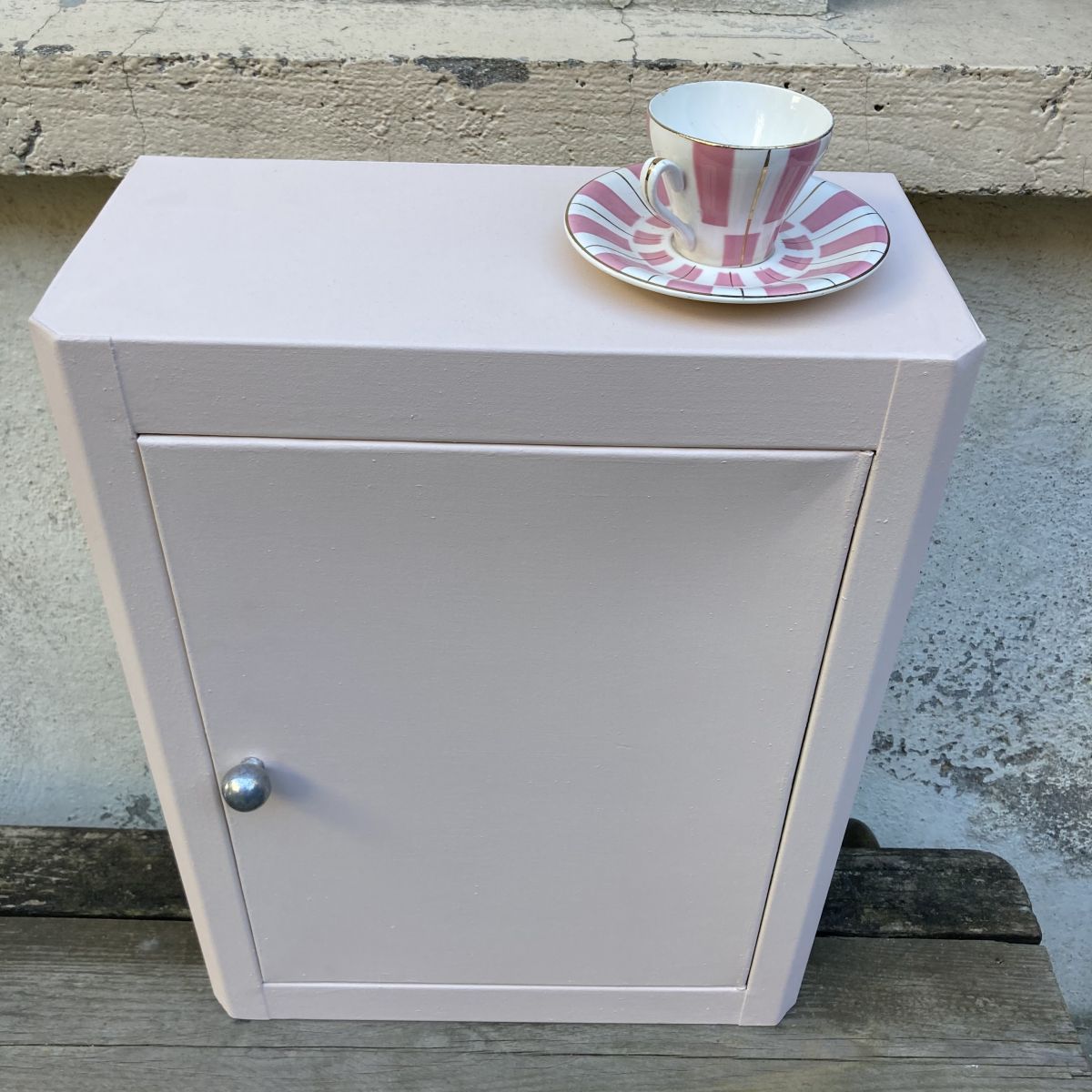 Armoire à pharmacie des années 60 en métal peinte en rose très pâle à l'extérieur et turquoise menthe à l'intérieur. Elle se compose d'une porte ornée d’une poignée boule ouvrant sur des petits rangements.