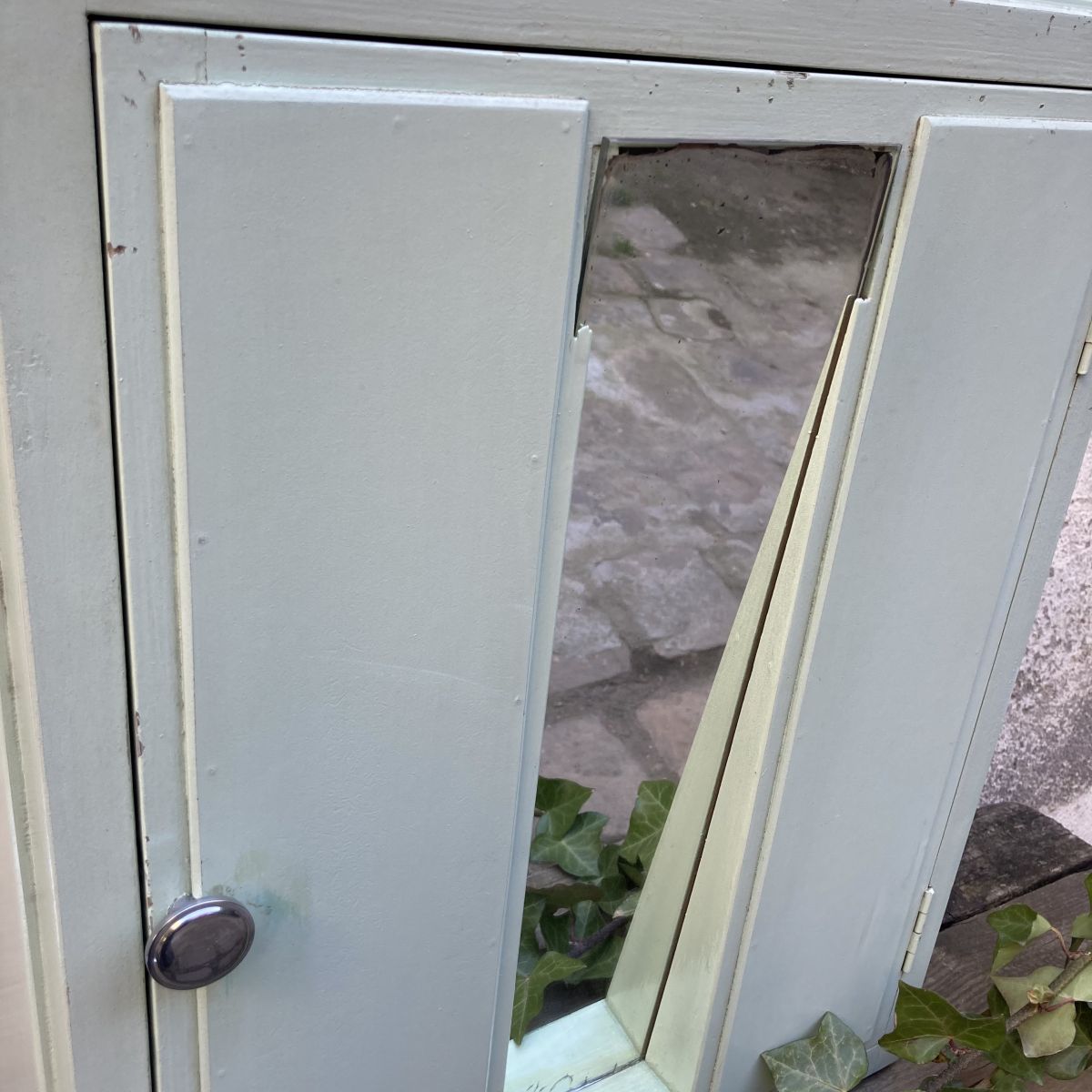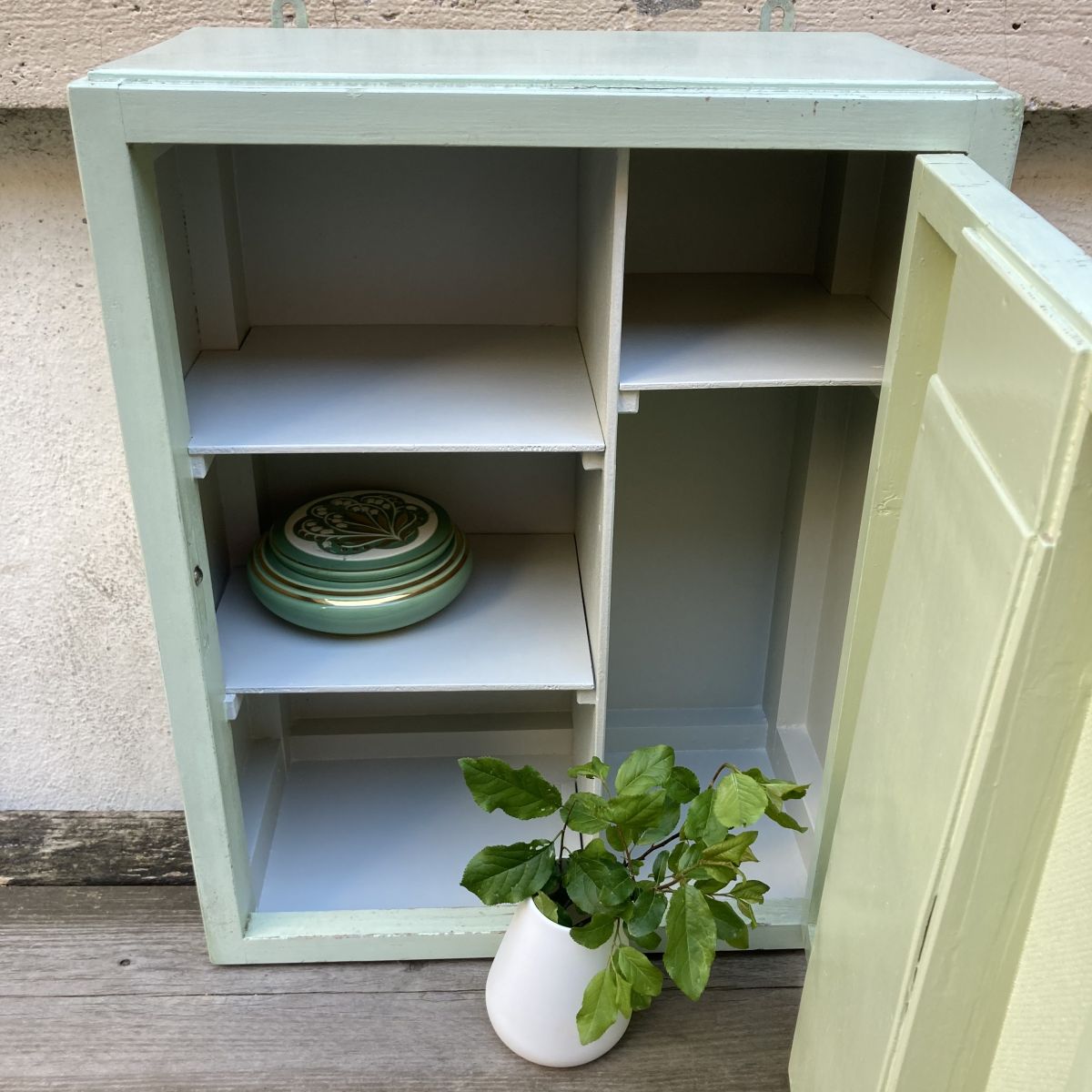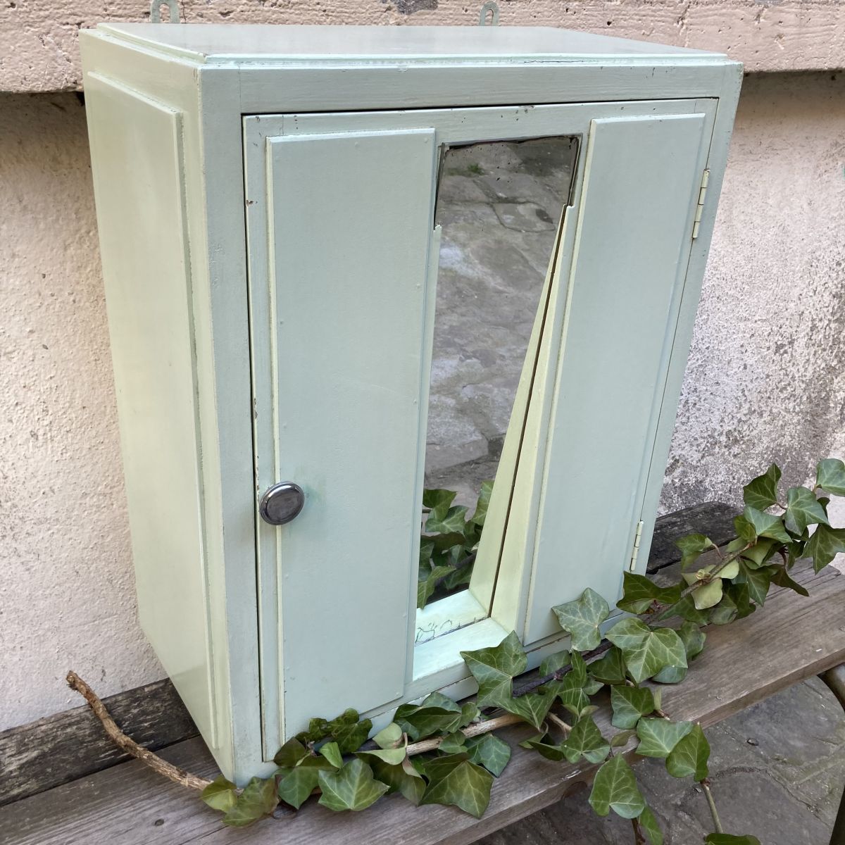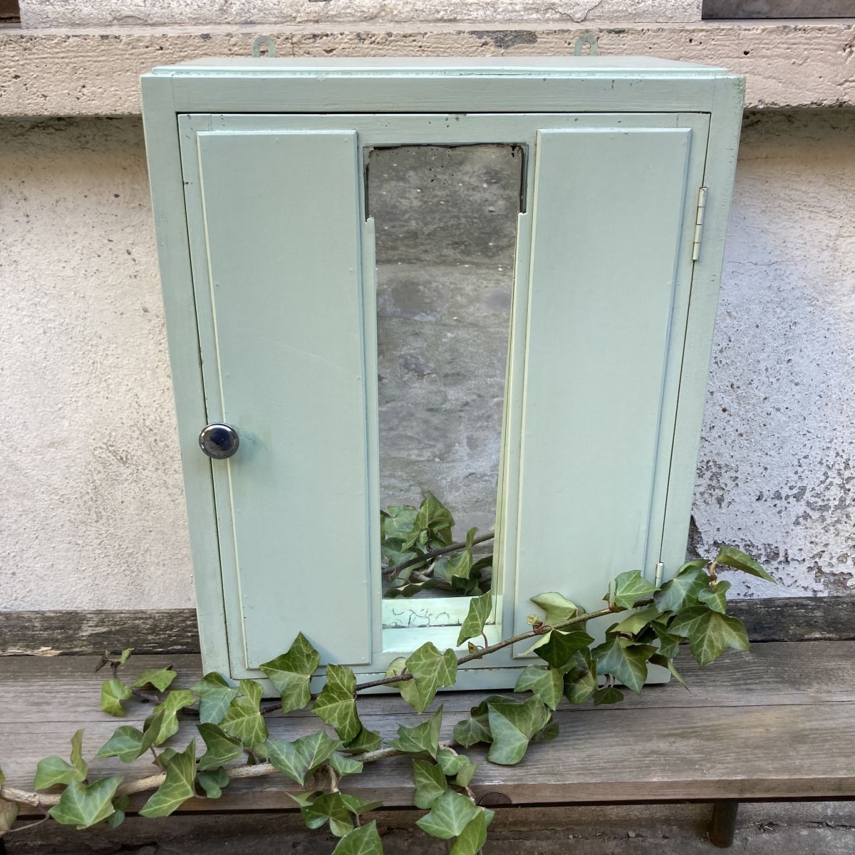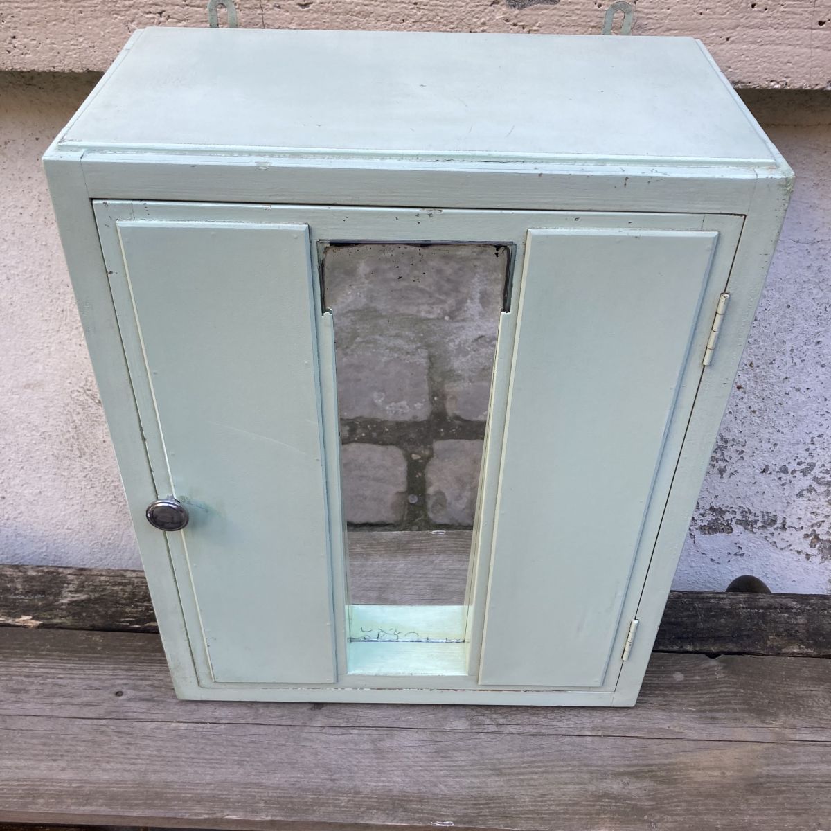 Armoire à pharmacie ancienne en bois dans sa patine d’origine.Joli vert tendre à l'extérieur et repeinte en gris très clair à l’intérieur.