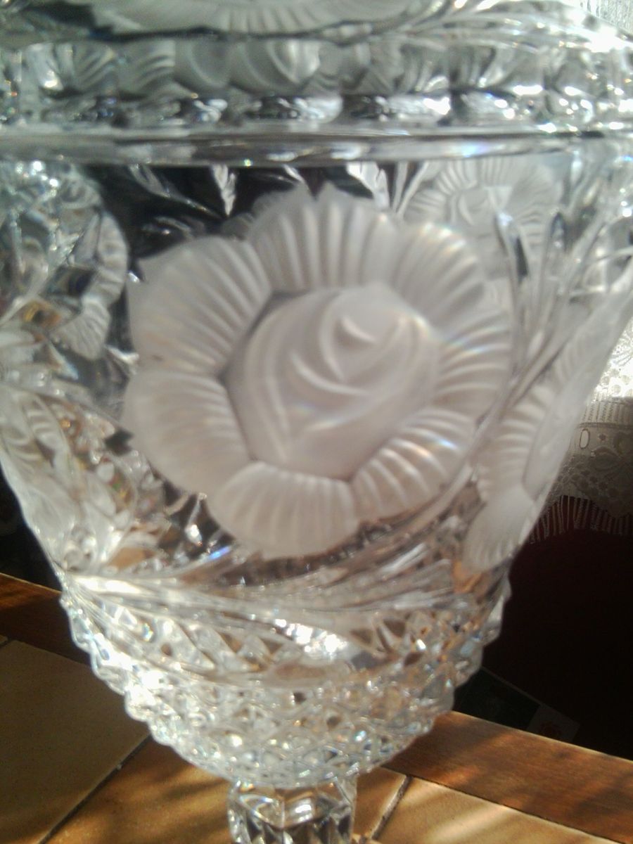 Magnifique drageoir en cristal de Paris taillé : le feuillage est en cristal limpide et les fleurs en cristal opalescent. La base du drageoir est taillé à forme de Pointes de diamant.