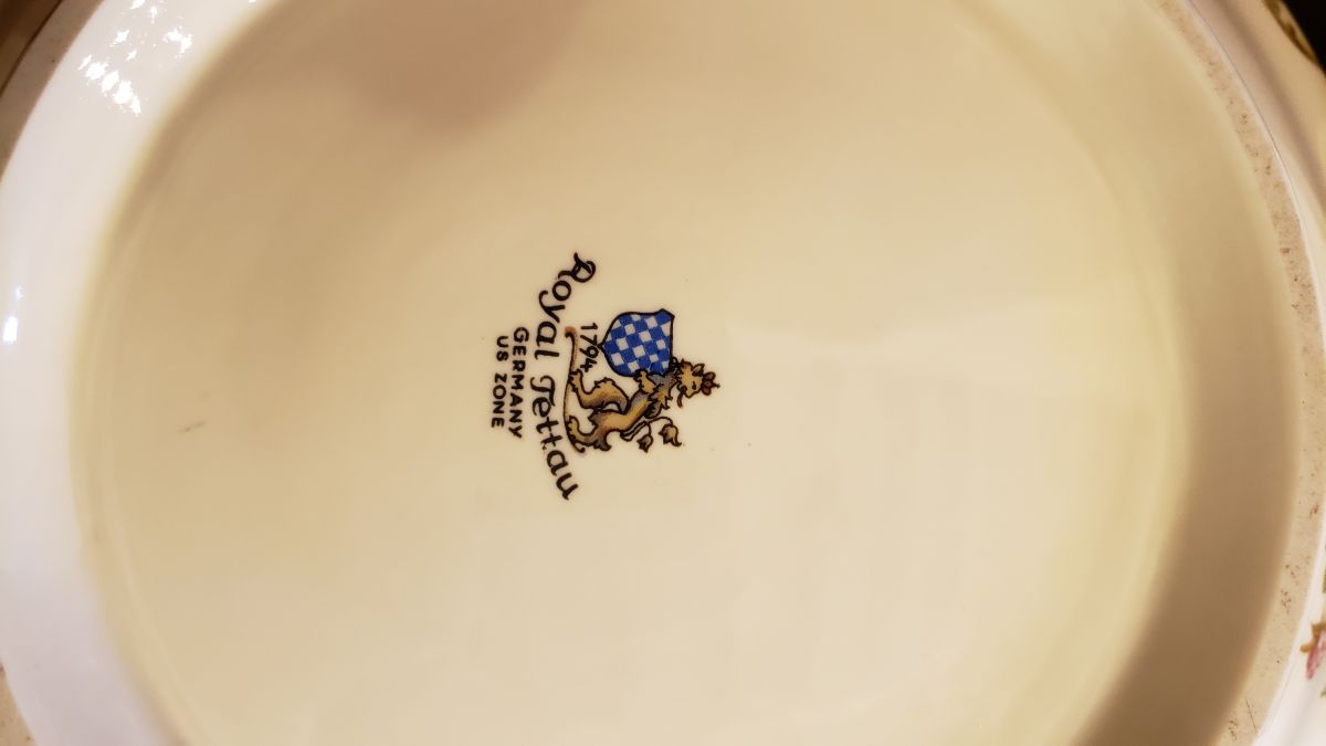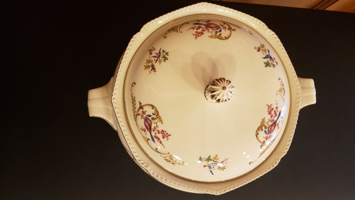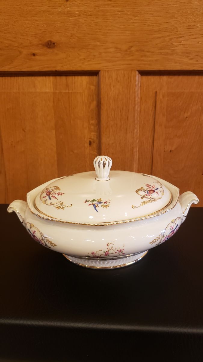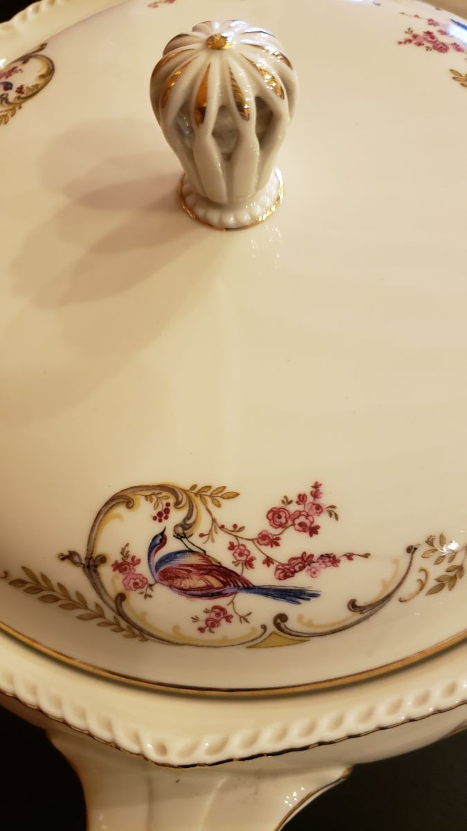 Soupière ROYAL TETTAU Bavaria Germany en porcelaine fine aux décors fins d'oiseaux et de dorure, chic et sobre.