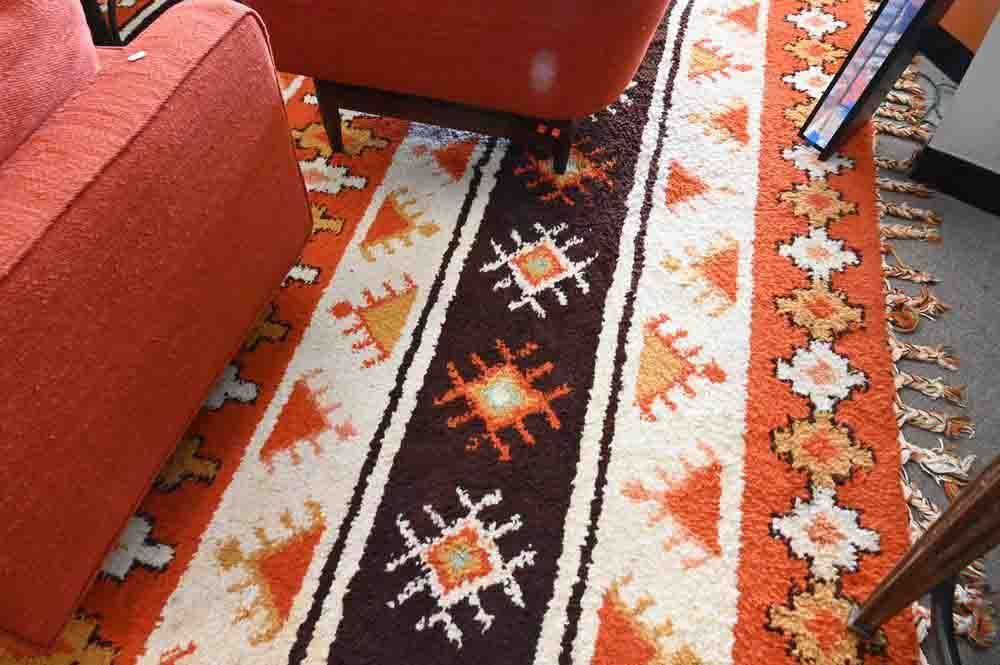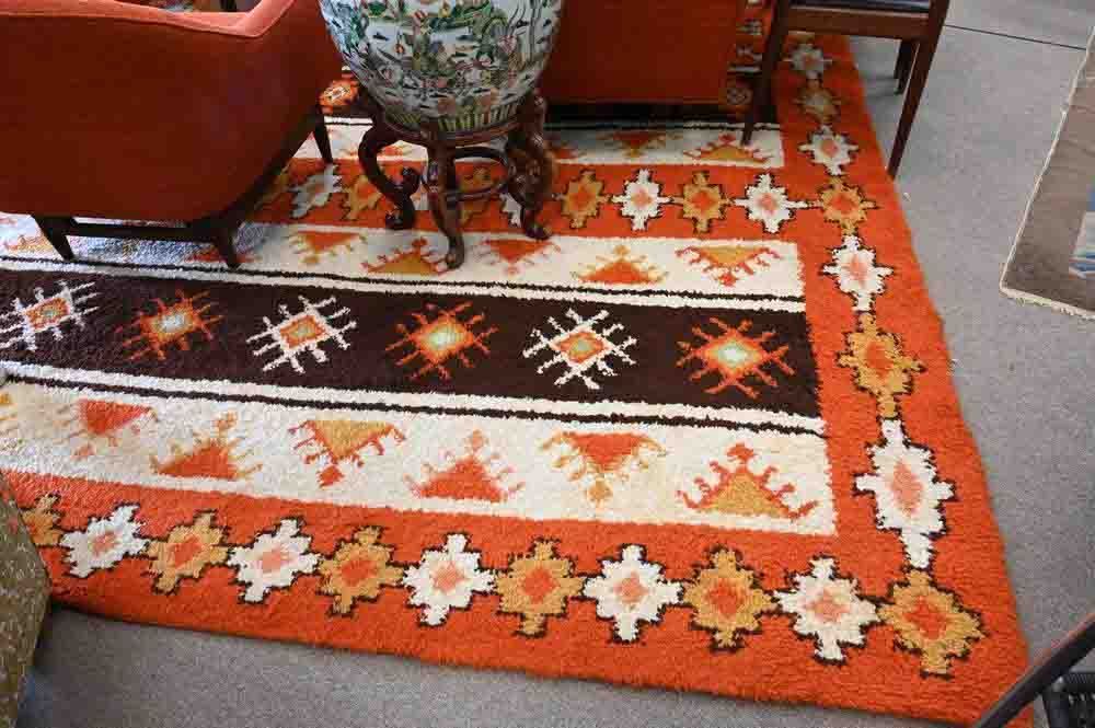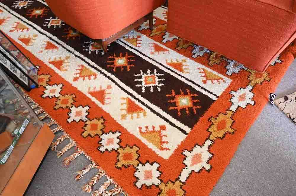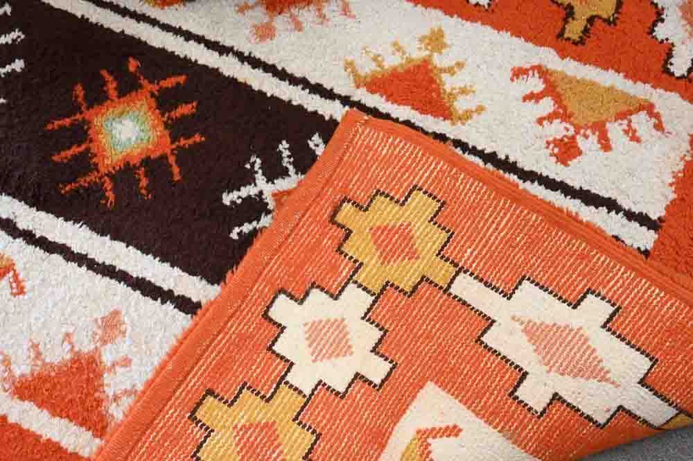 Vintage hand-woven Moroccan Berber rug from the end of 20th century. It is in original good condition. The rug is in bright shades of orange, white and chocolate brown in stripes.