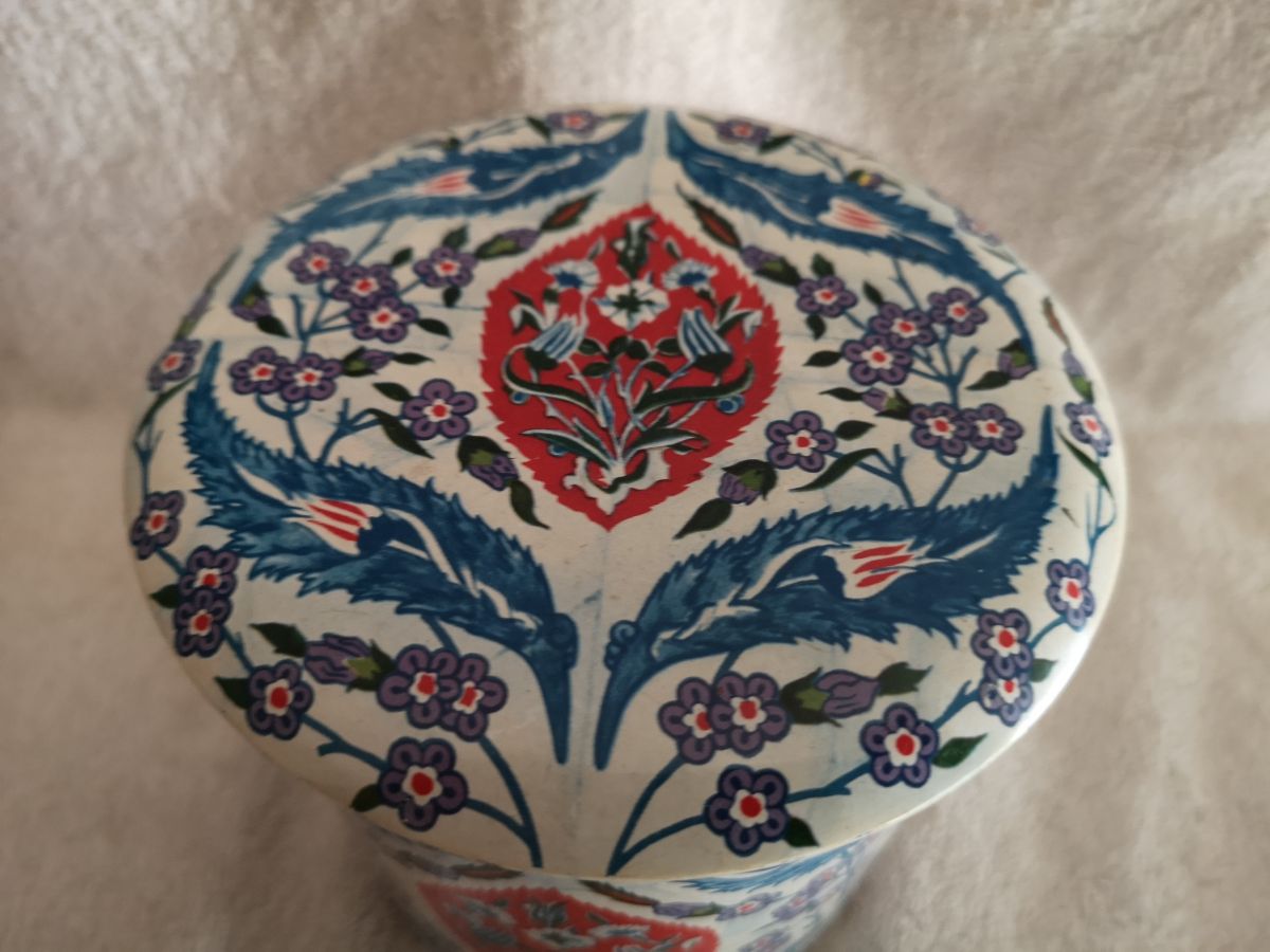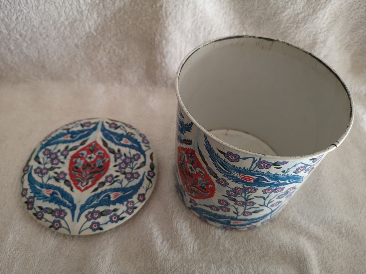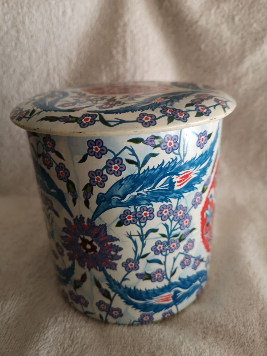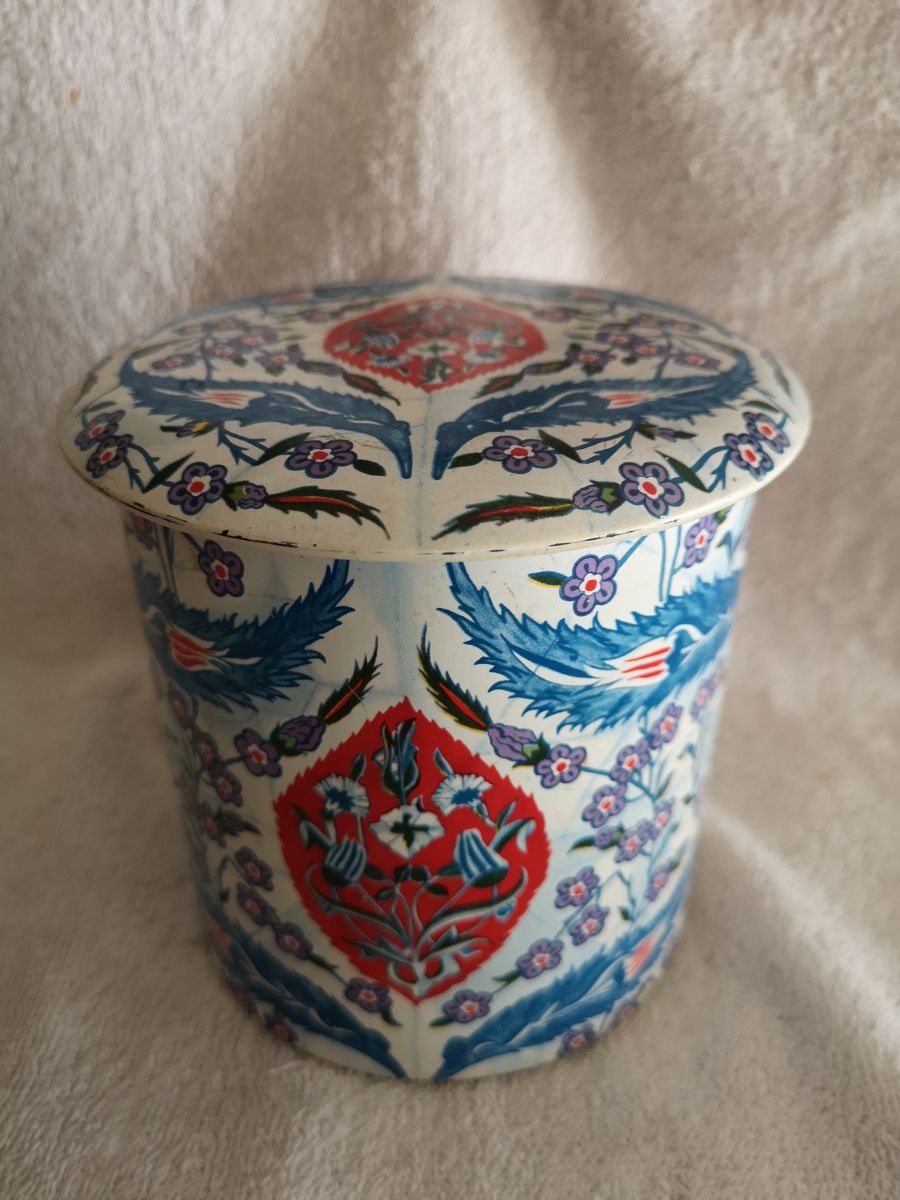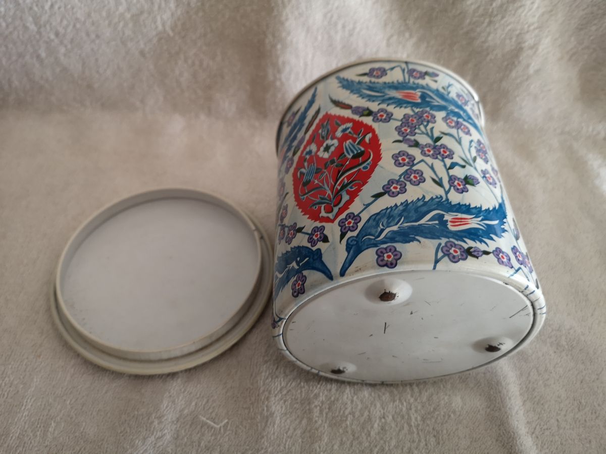 boite en métal tole ancienne période 1960 à décor de fleurs et d'occasion en très bon état