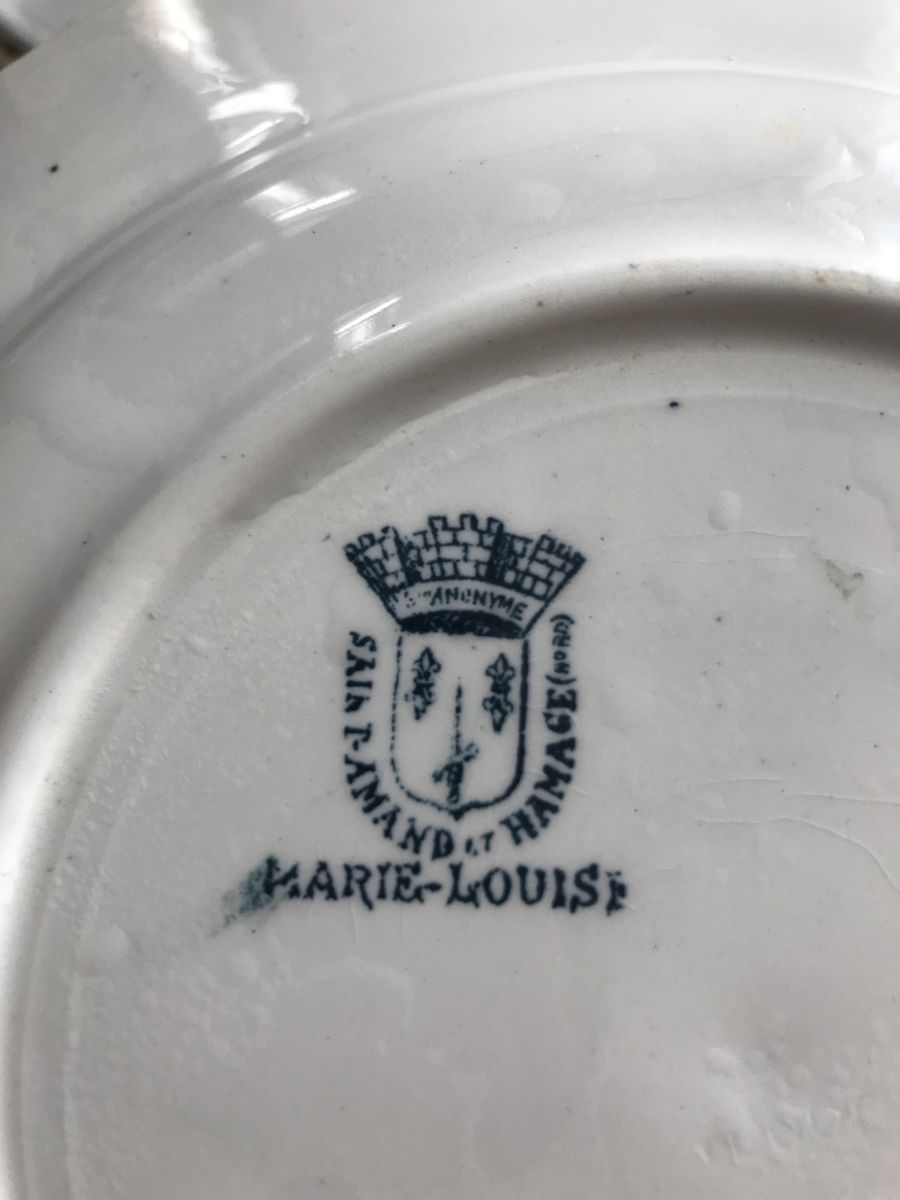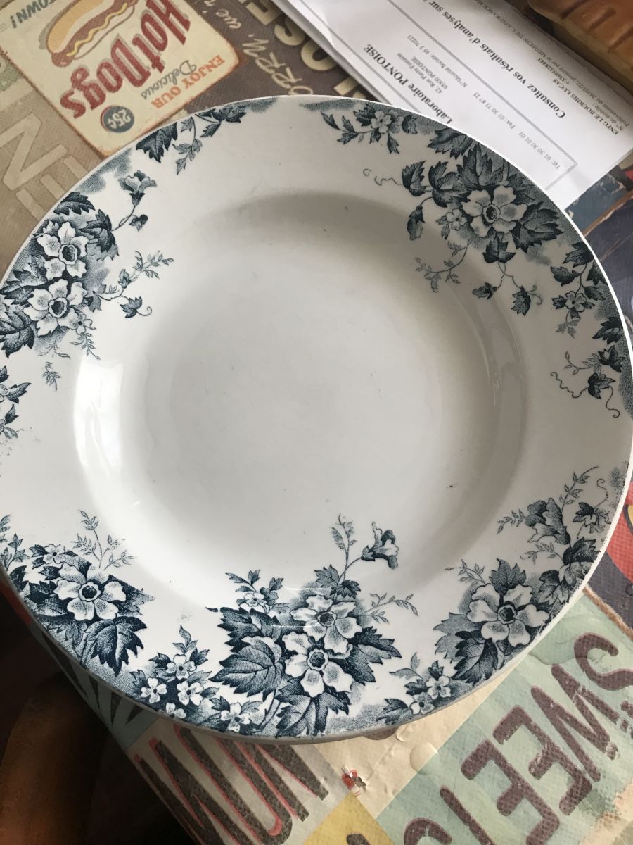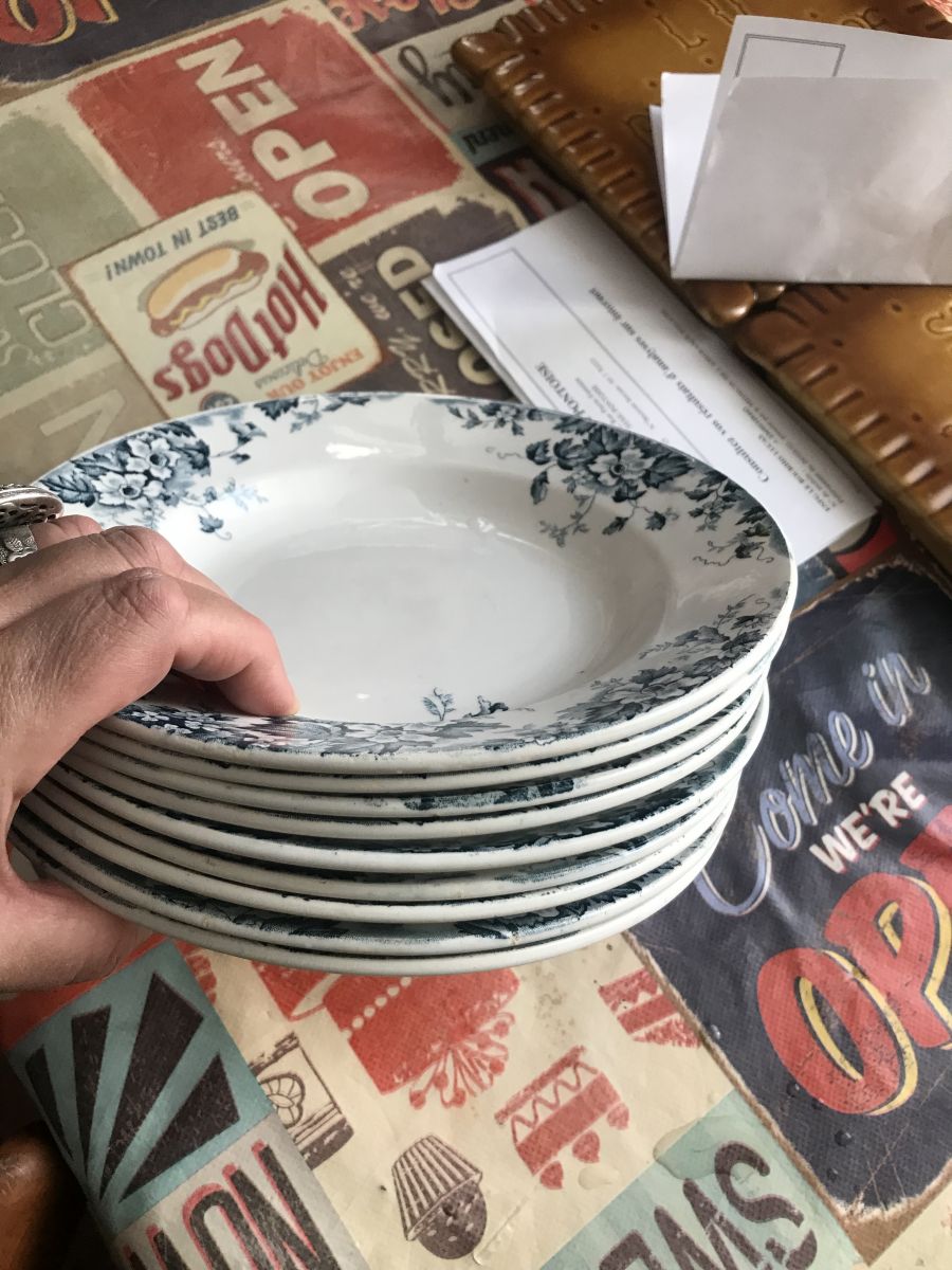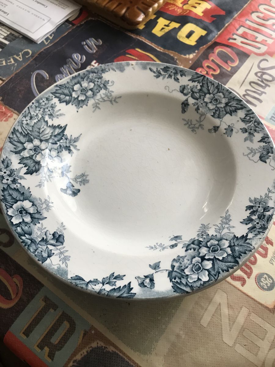Neuf assiettes creuses Marie Louise en bon état général (une avec une légère fente) motifs floraux bleu marine