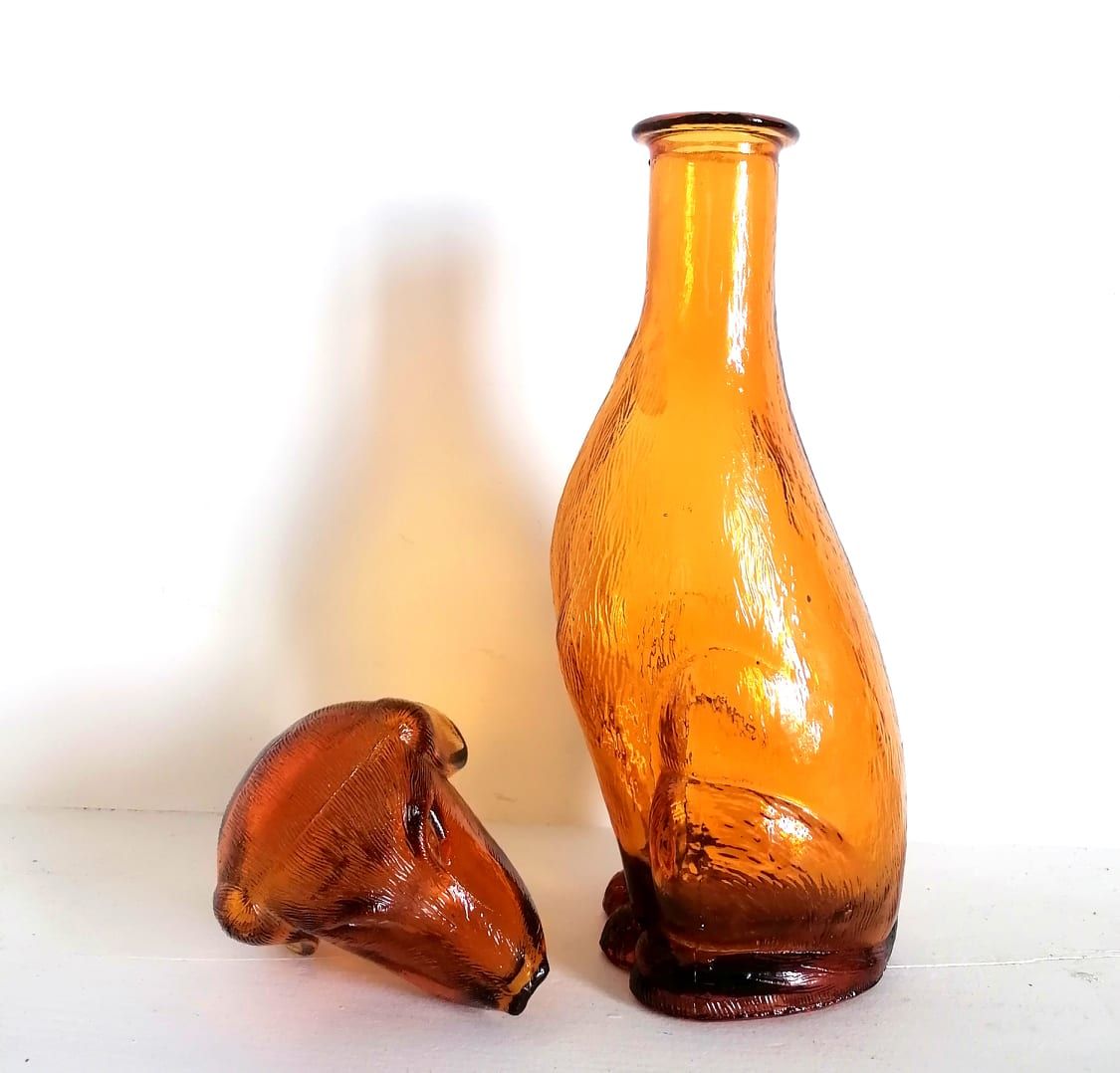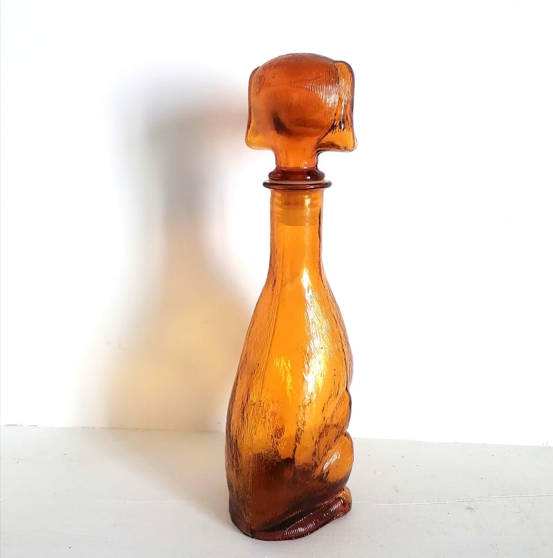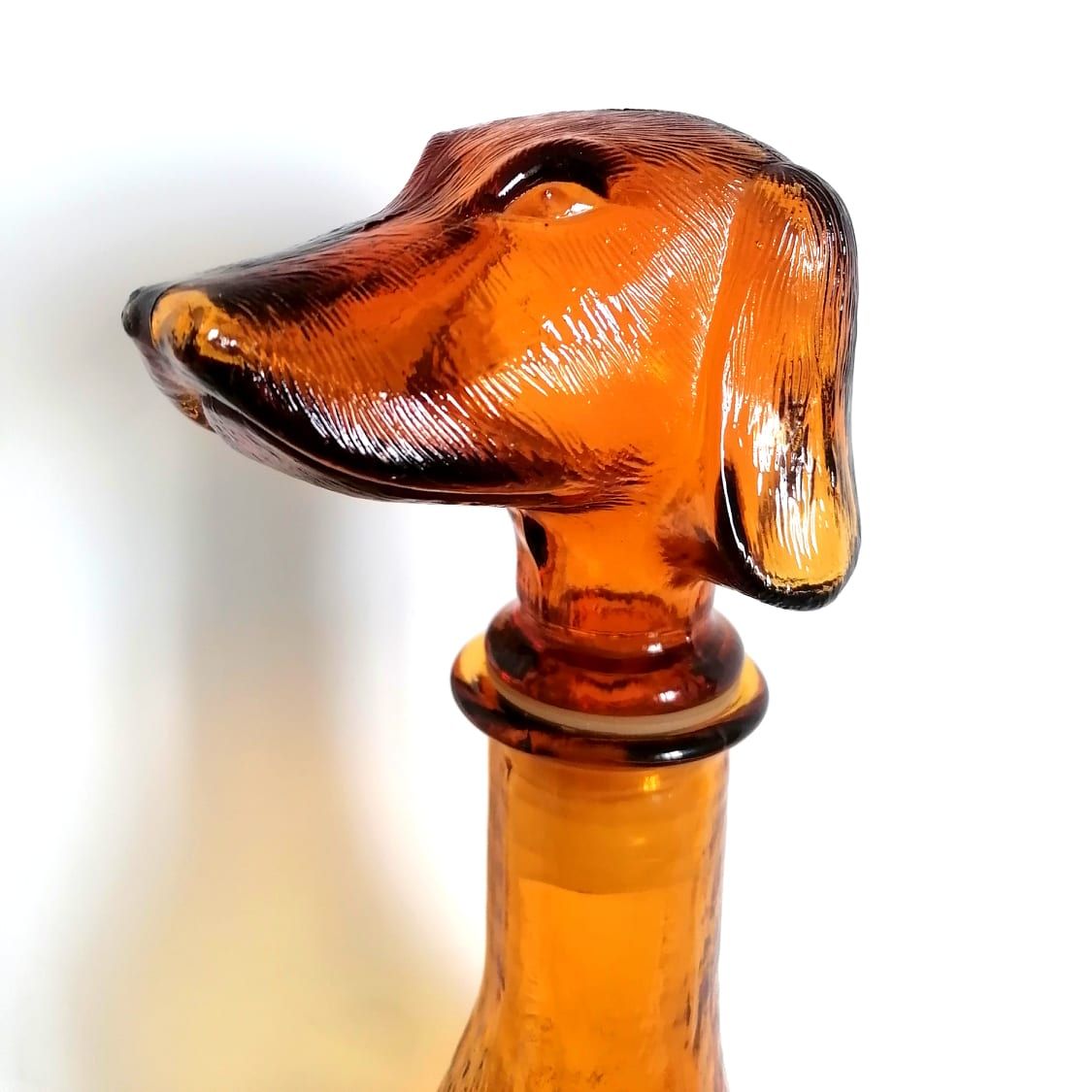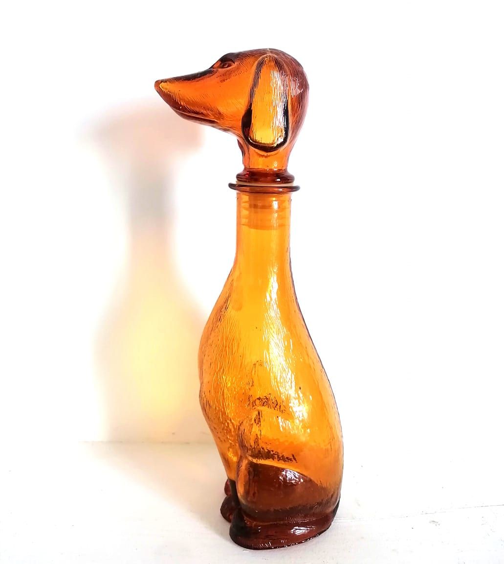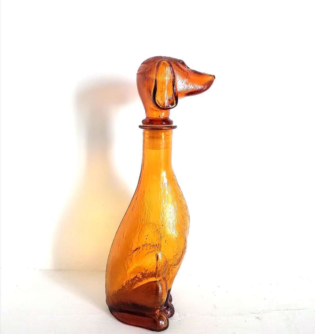 Bouteille / carafe décorative italienne en verre moulé d'Empoli de couleur ambrée, en forme de teckel assis.