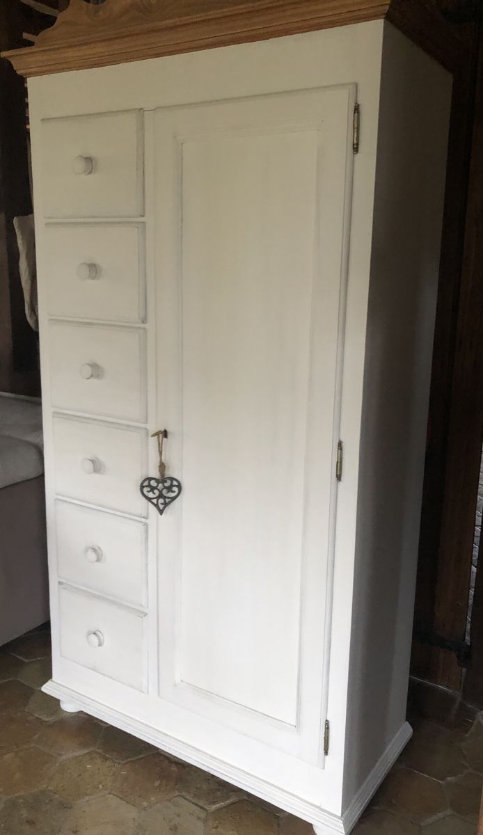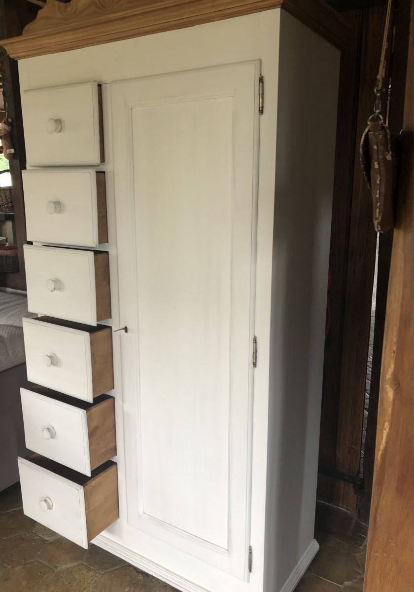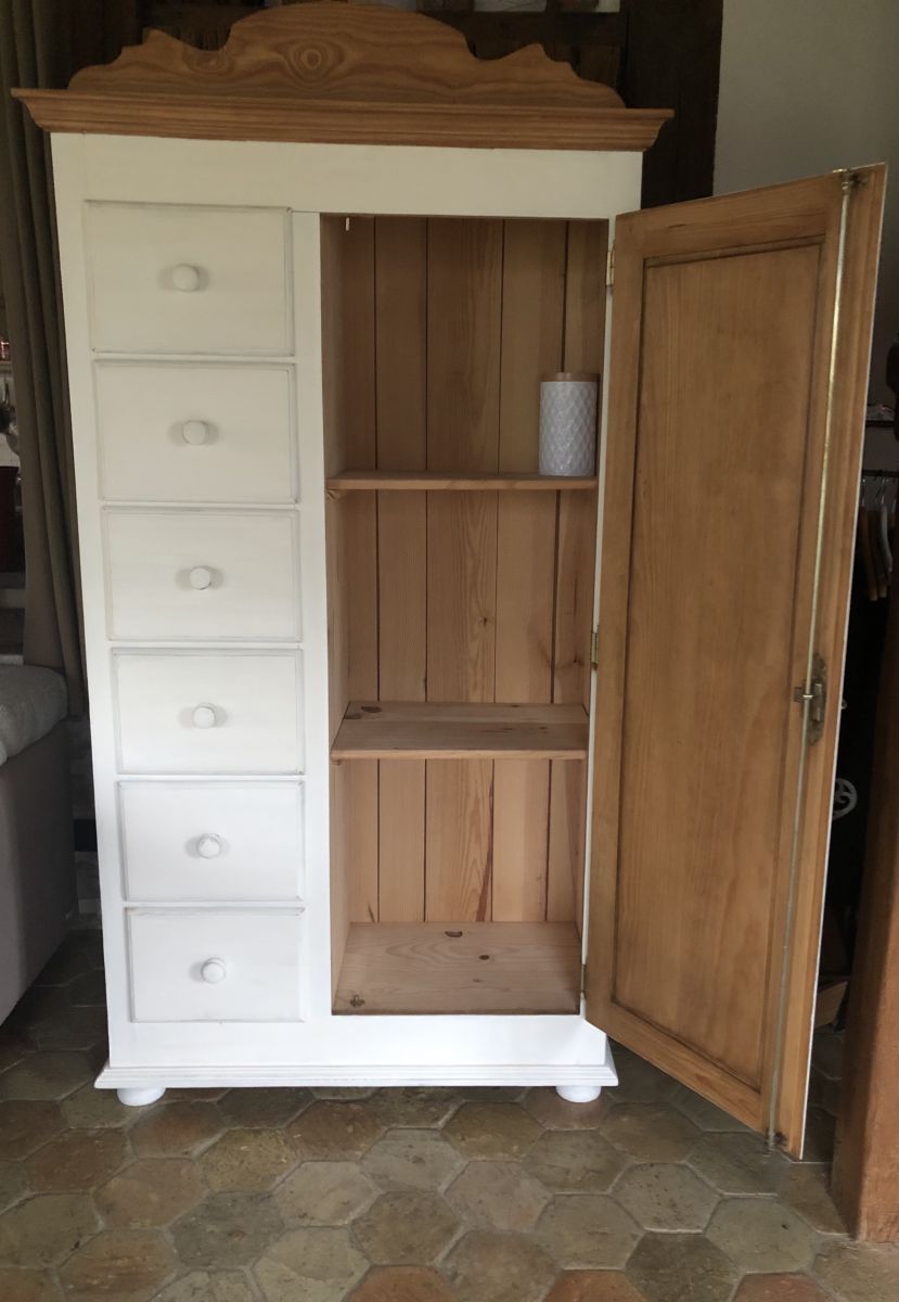 Intérieur aménagé d'un côté penderie avec deux étagères fermeture à clé et d'un côté doté de six tiroirs avec finitions " queue d'aronde ".