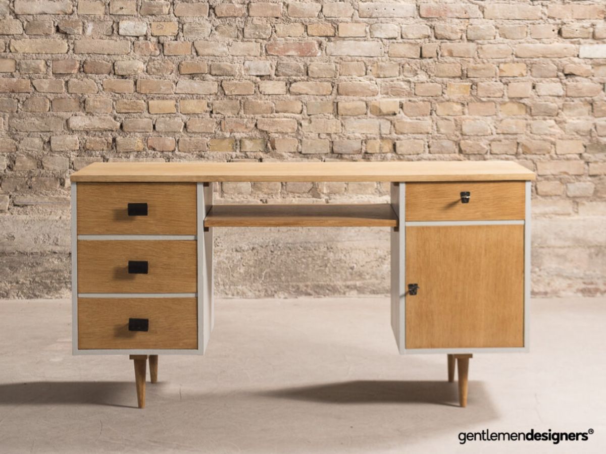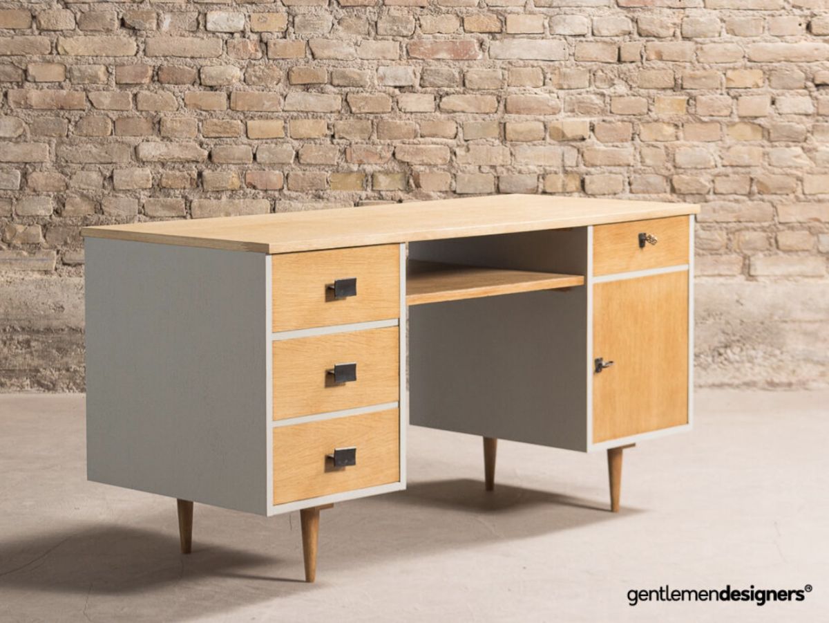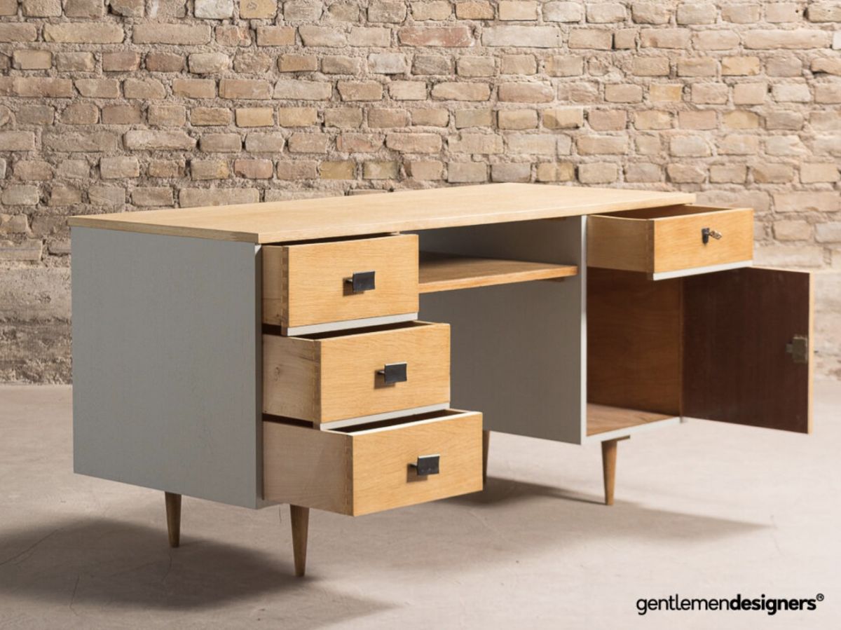 Bureau de ministre disposant de 4 tiroirs et d'un caisson, entièrement restauré dans un gris moyen
