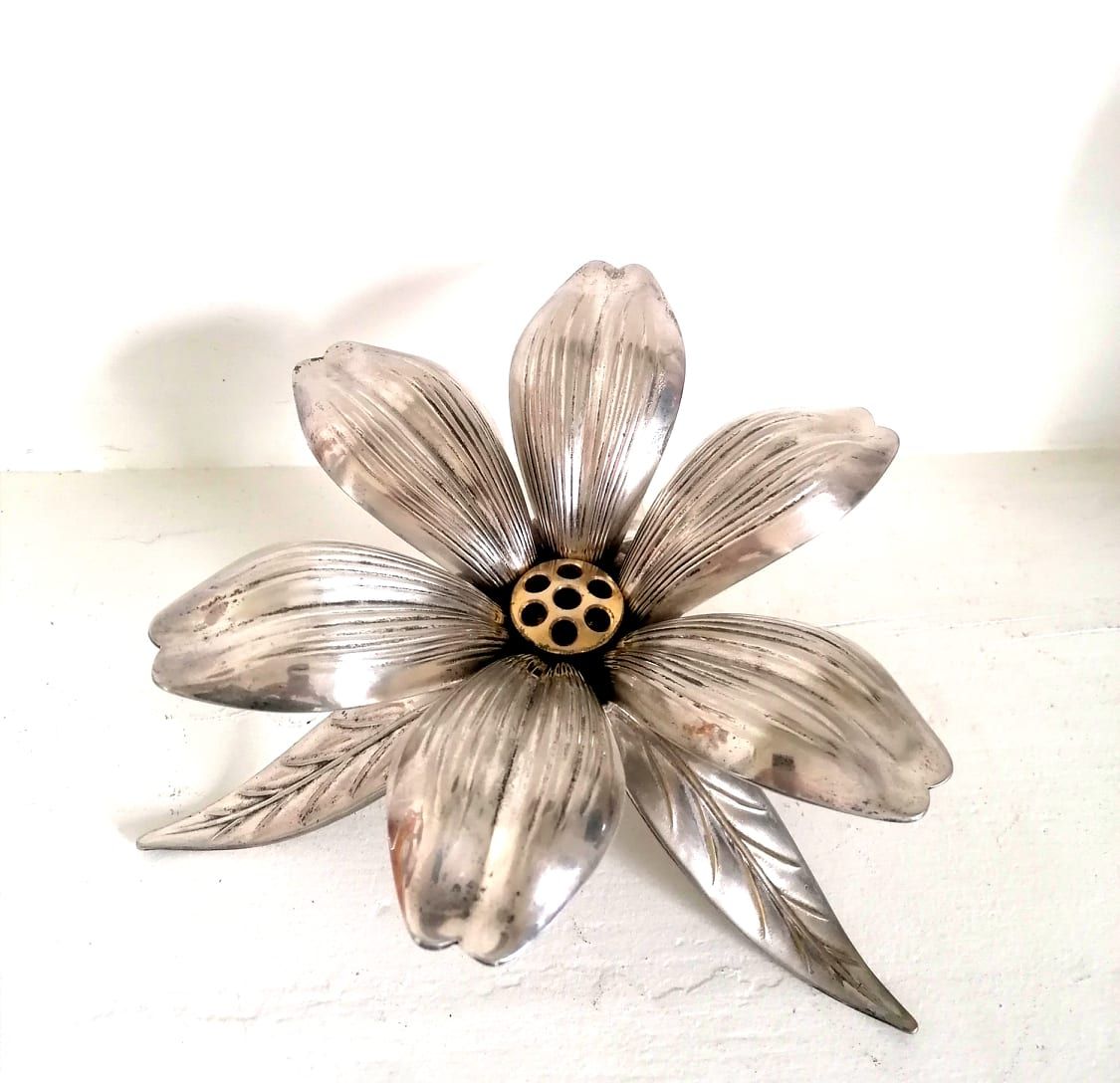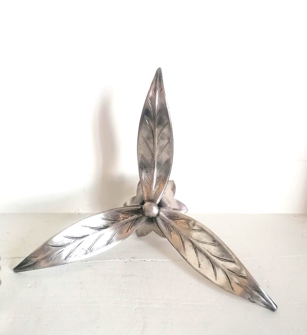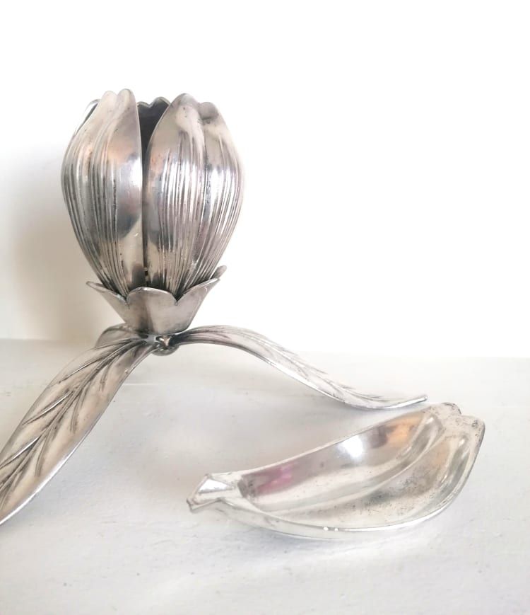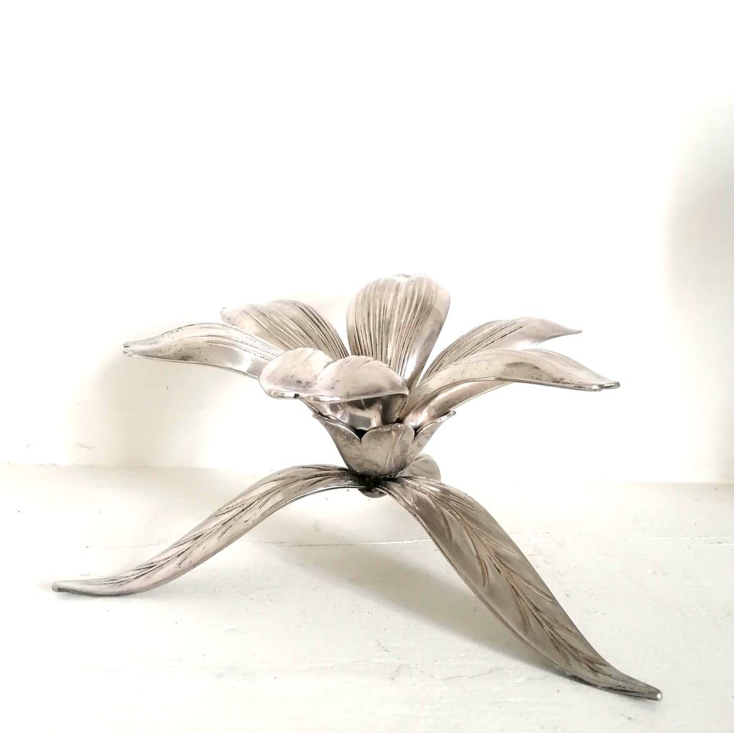 Cendrier en métal argenté en forme de fleur de lys, composée de six pétales amovibles formant de petits cendriers individuels avec rebord afin de poser la cigarette. Au centre, le bouton de la fleur est en laiton doré. Le tout repose sur trois pieds représentant les feuillages de la fleur. Superbe travail des arts décoratifs des années 1950 : précision des détails, subtilités et harmonies des formes.