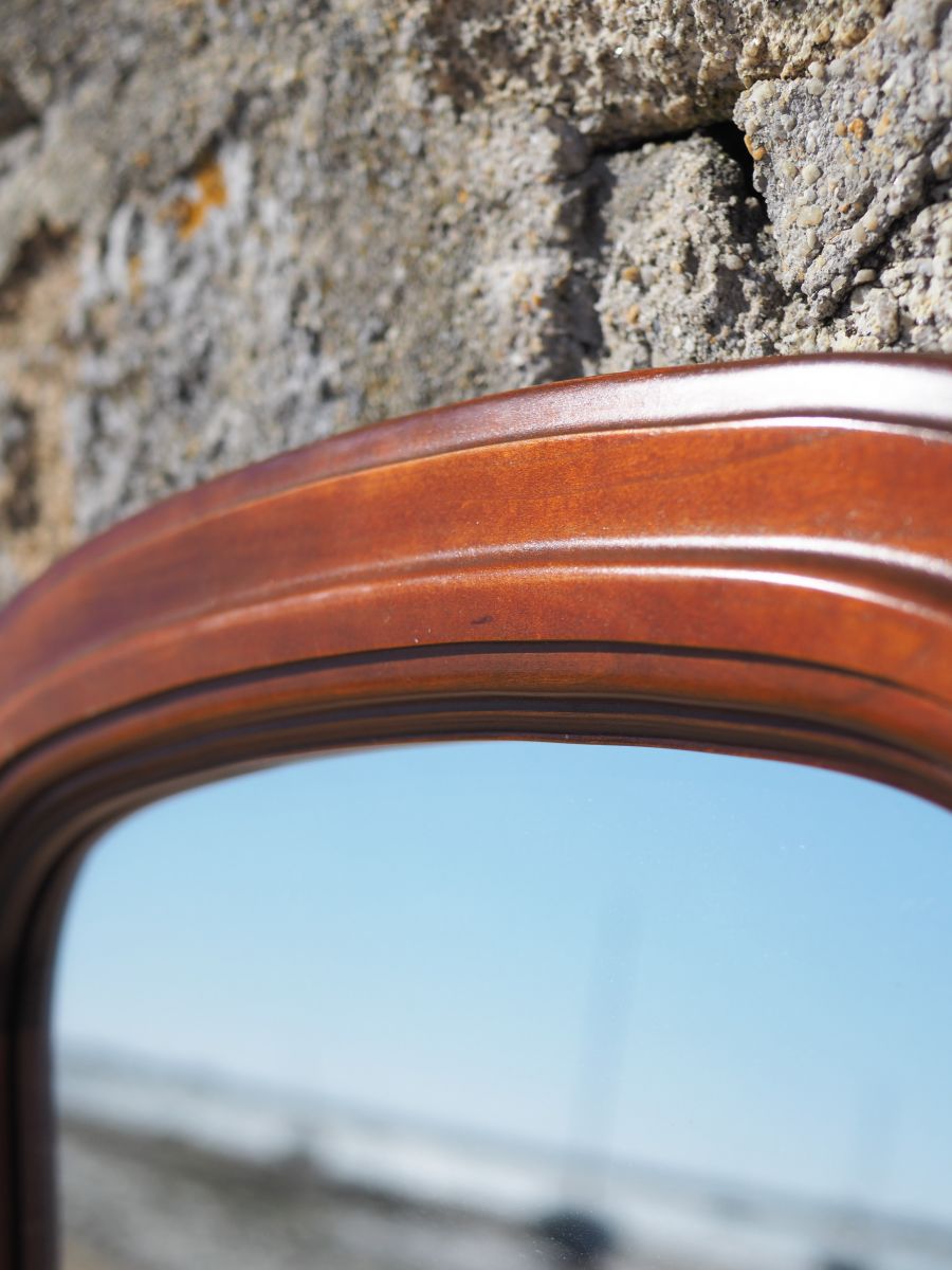 Miroir mural arrondi en cerisier, arrière plaqué bois. Très belle facture, bois ouvragé, travail d'ébénisterie.