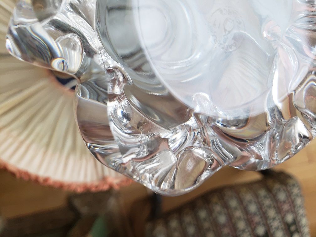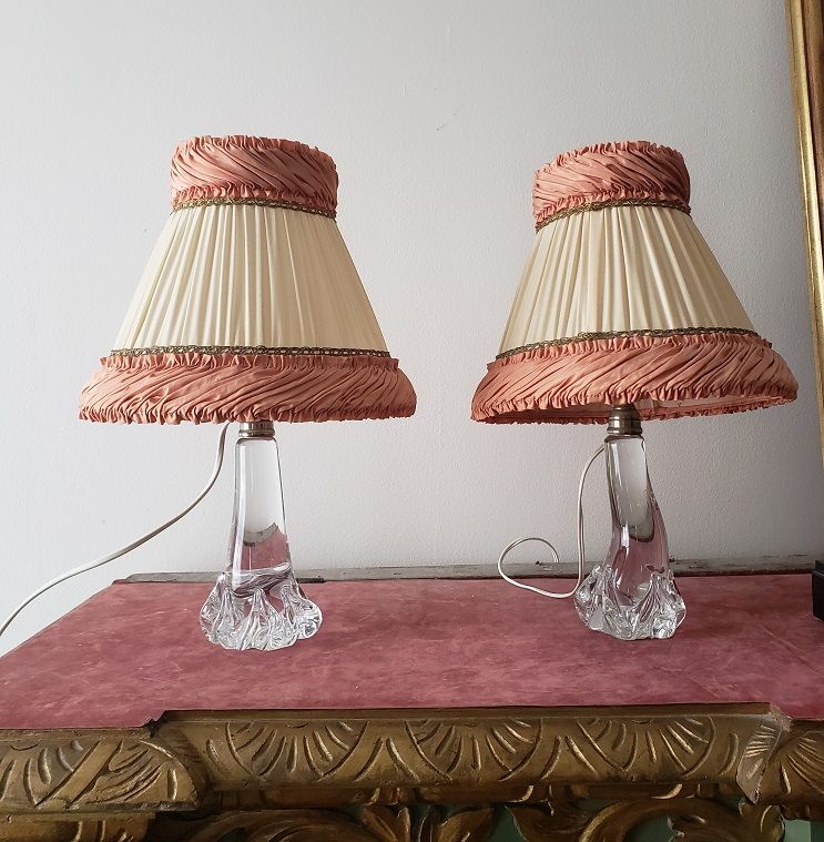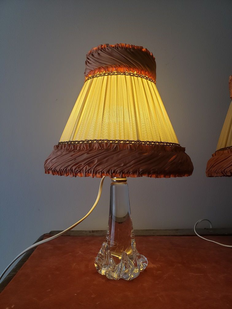 Paire de lampes en cristal moulé, les abat-jours en tissu. Baccarat (marque visible au socle,)Electrifiées. H 40 (avec abat-jour).