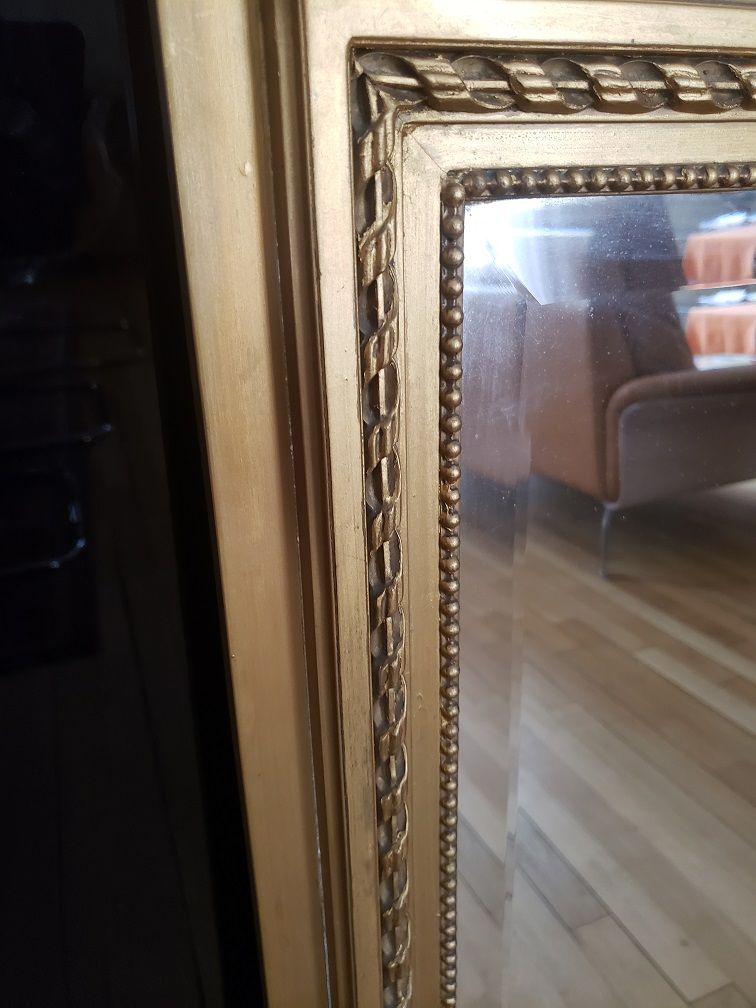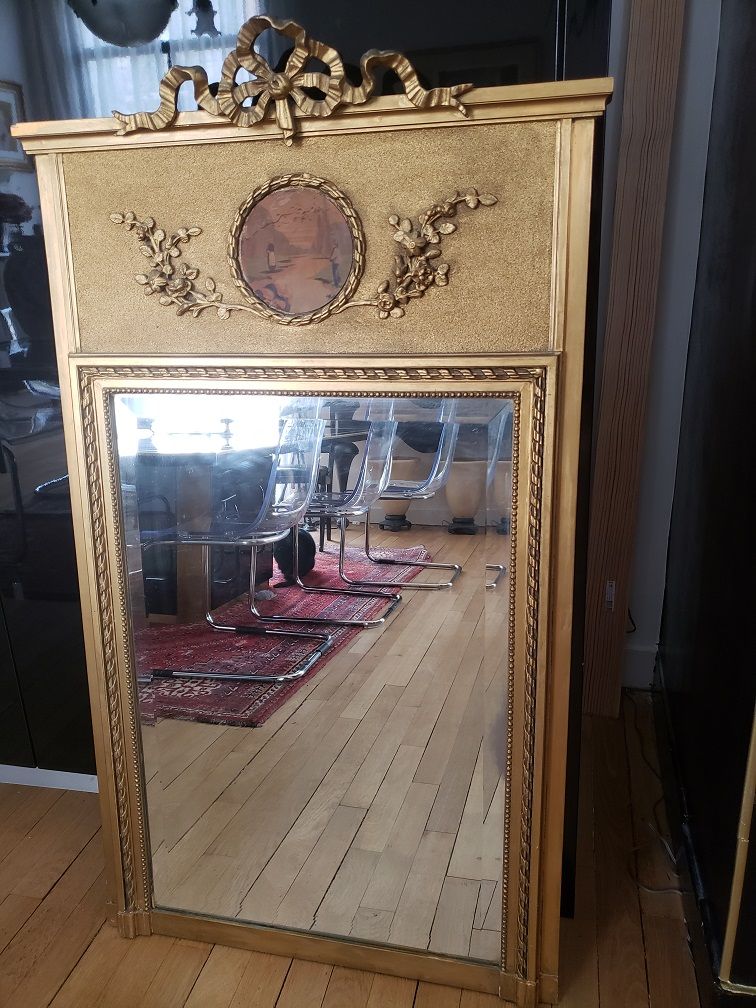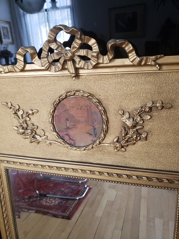 Miroir Trumeau en bois doré au noeud et motifs feuillagés, à décor d’une scène animée. H 130 largeur 75