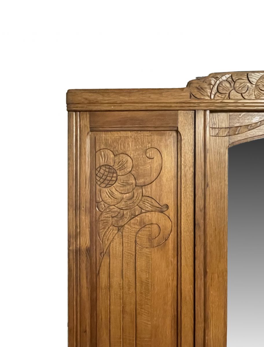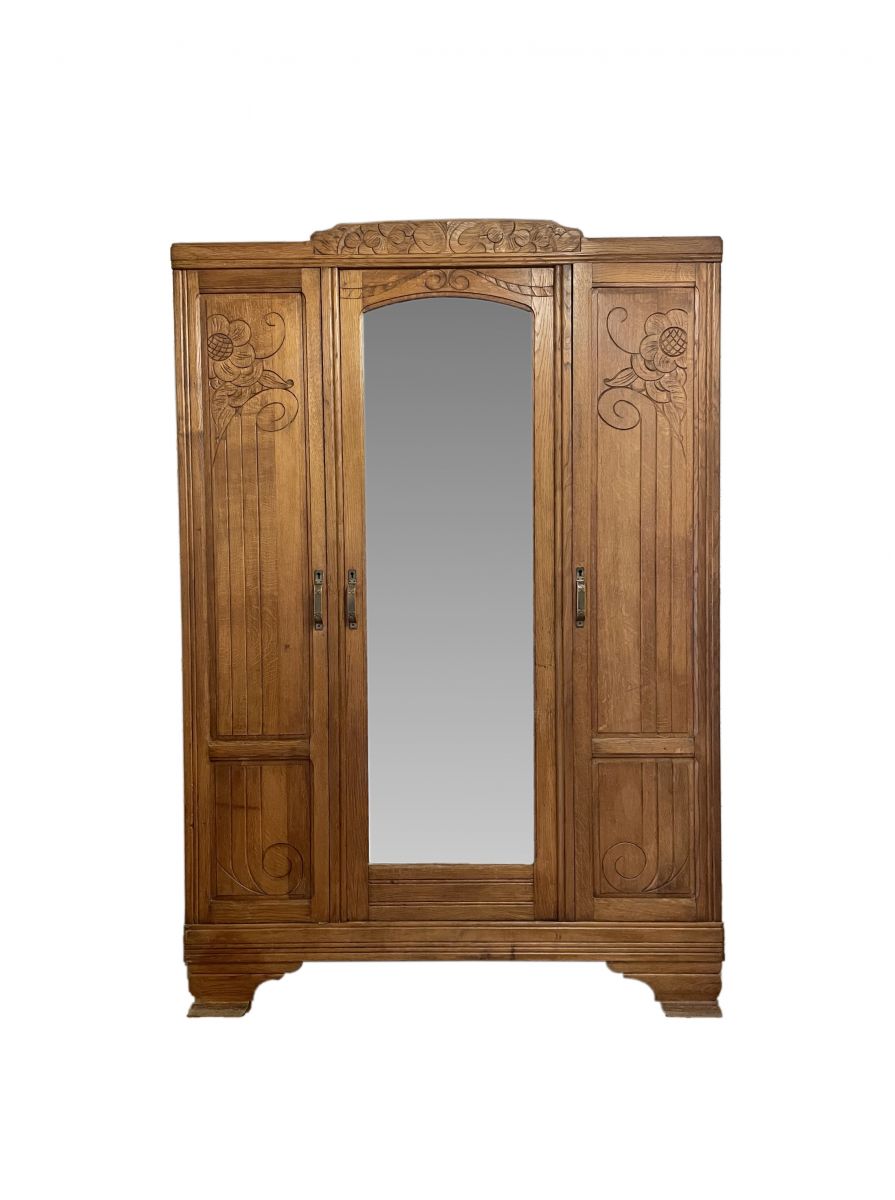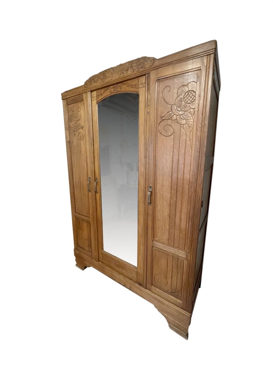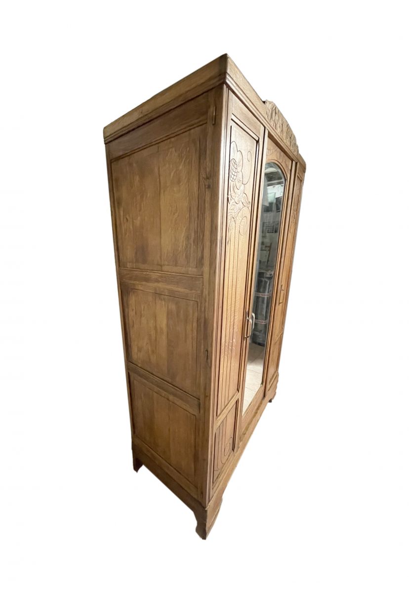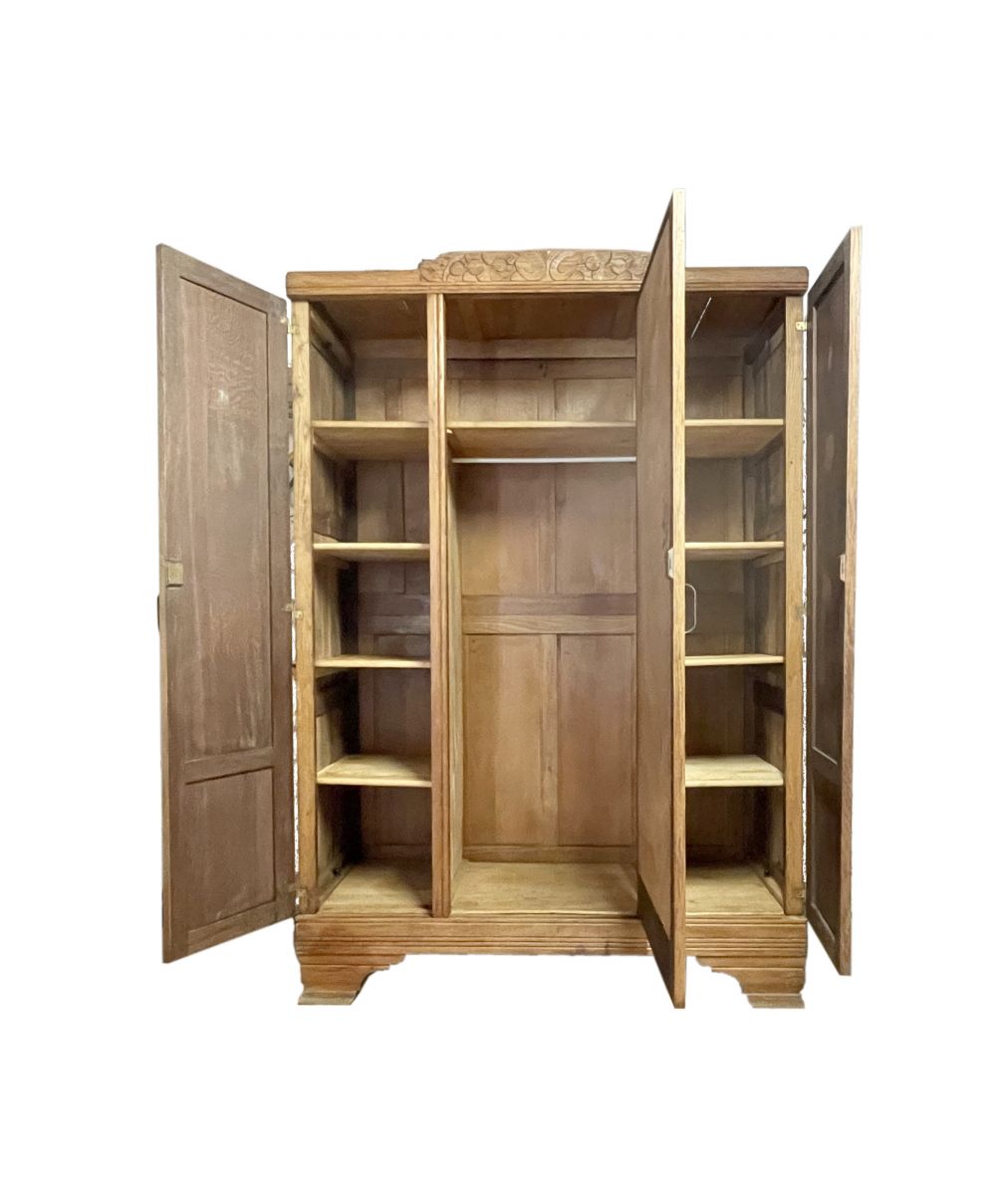 Tiroirs à gauche et à droite avec espace pour suspendre les vêtements au centre. Il a été traité, décapé et ciré et est entièrement démontable.