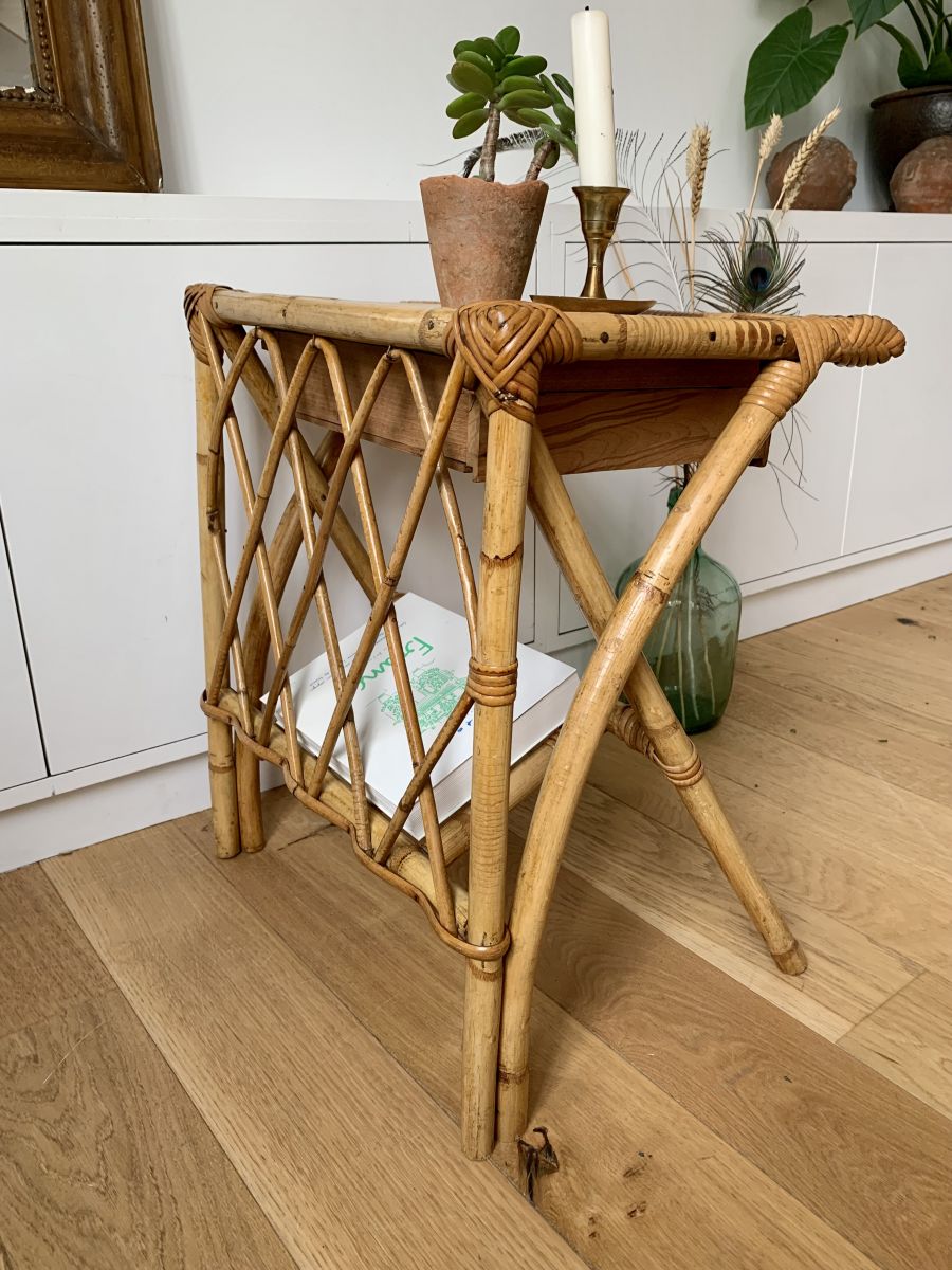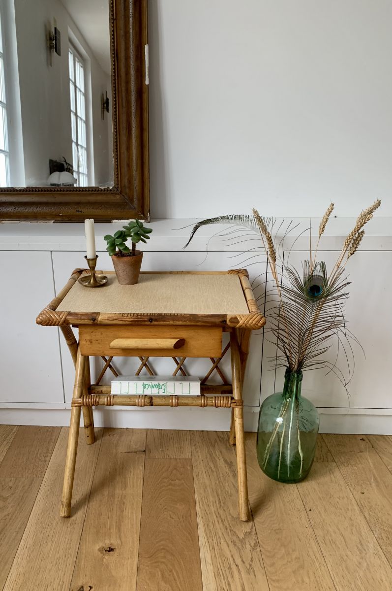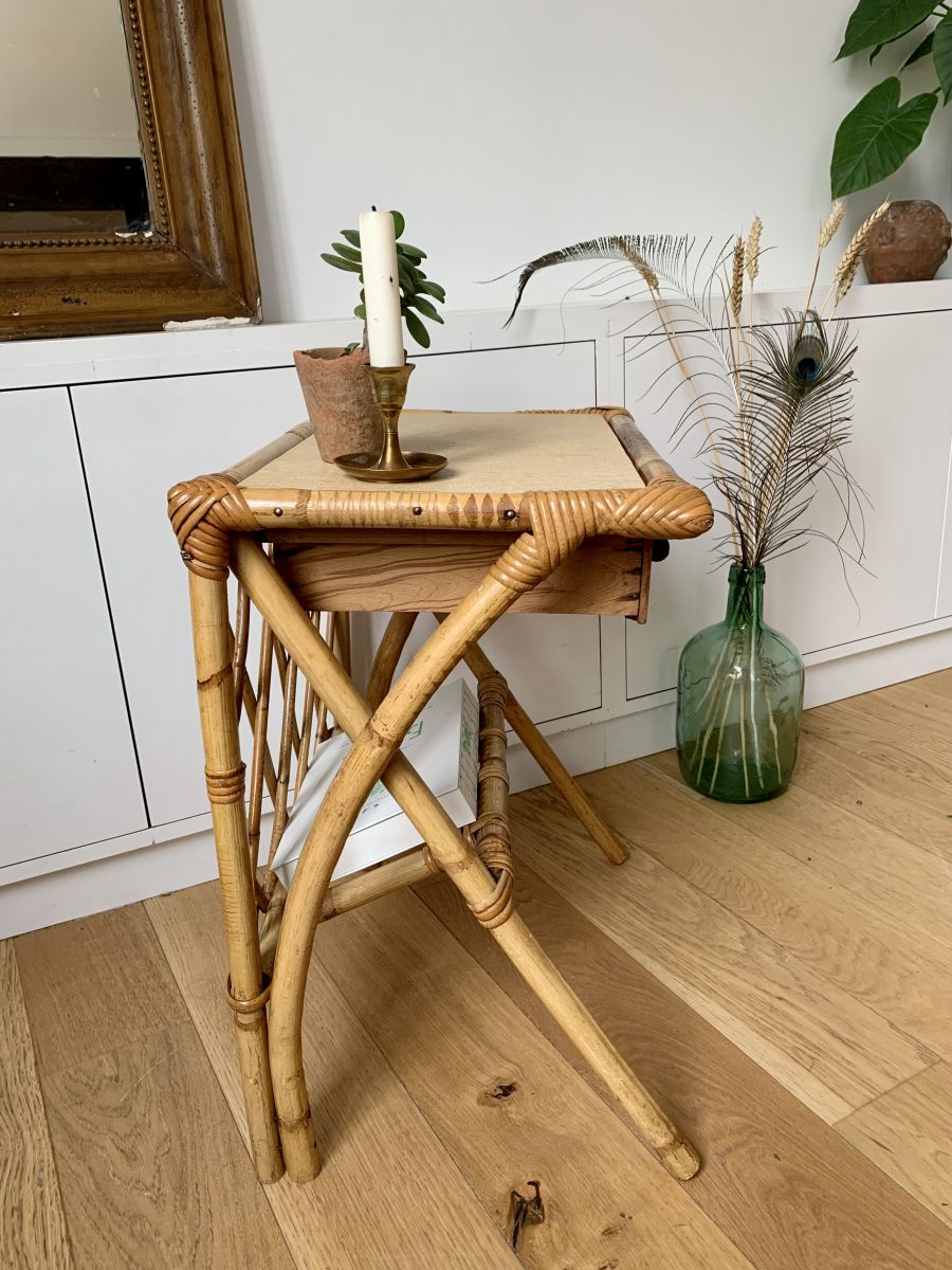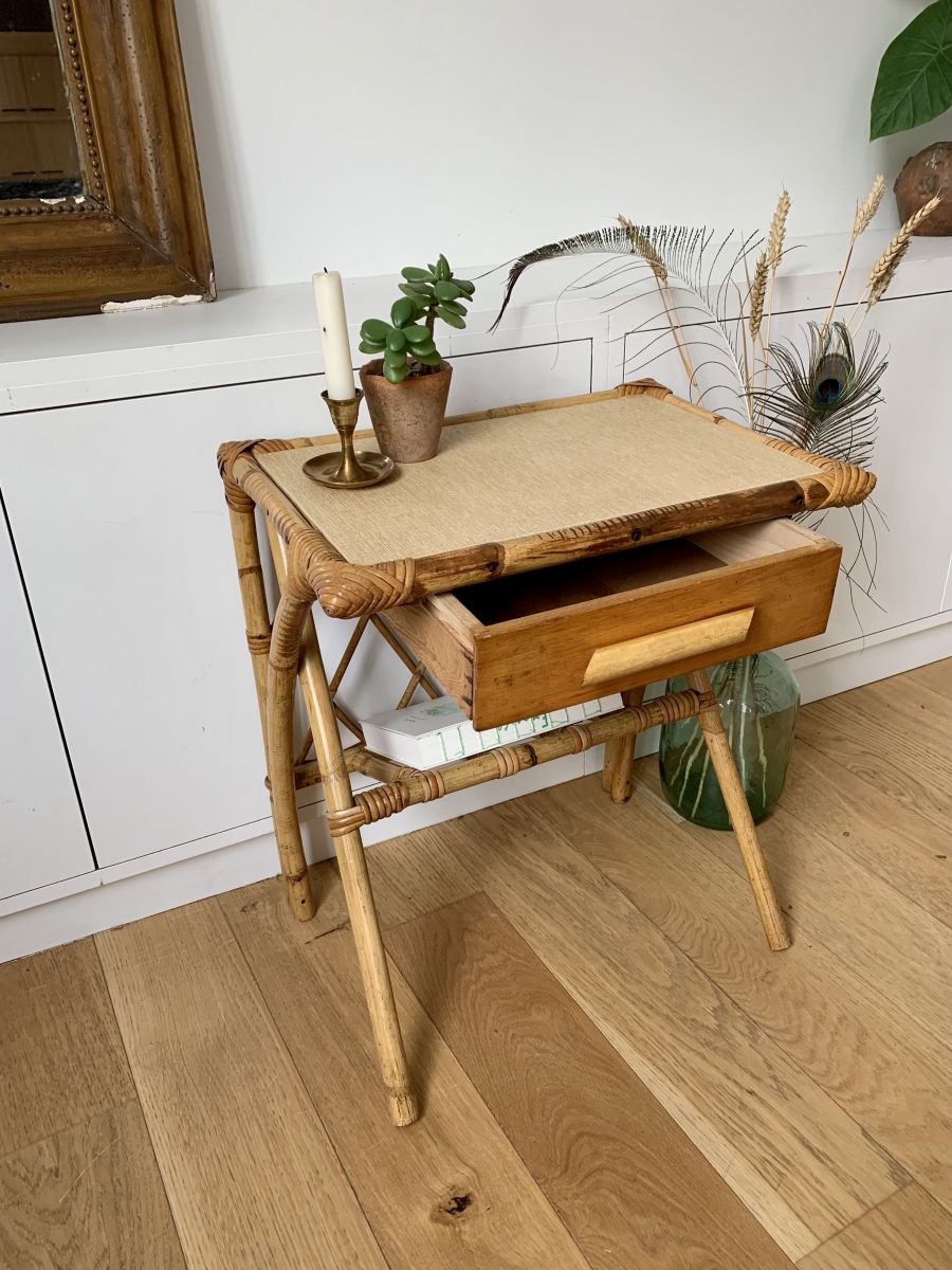 Jolie table de chevet, meuble d'appoint en rotin typique des années 60 pour une touche bohème à votre décoration.
