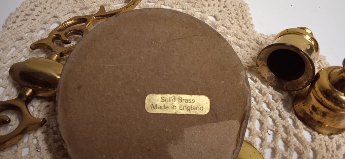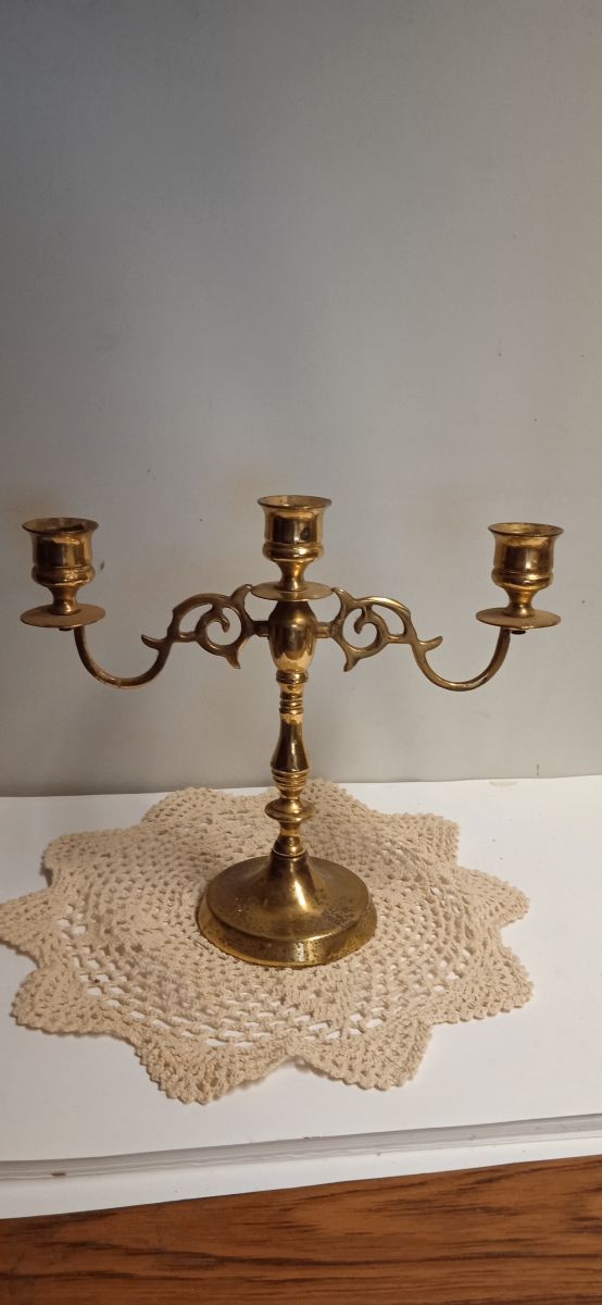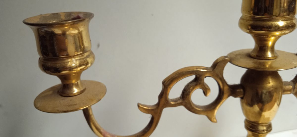 Candélabre en laiton à trois bras avec une étiquette sur la base indiquant