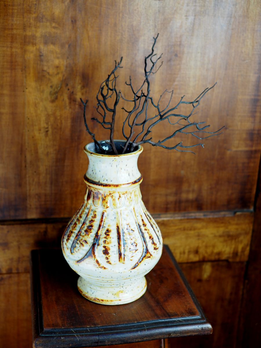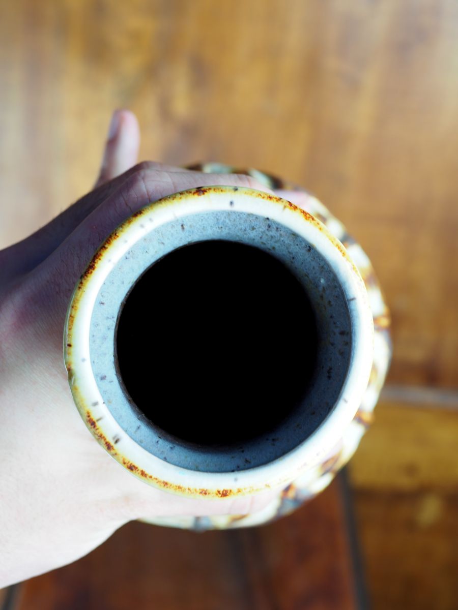 Vase côtelé à glaçure blanche constellée et arrêtes caramélisées.