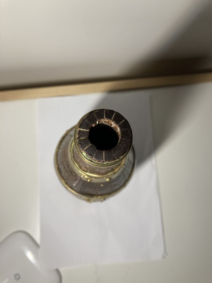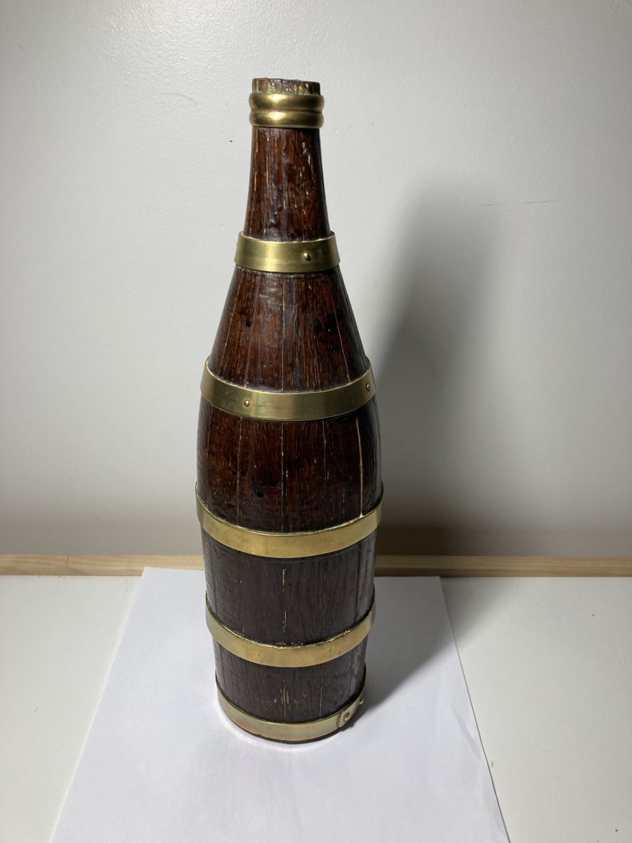 Ancienne bouteille en bois, pour le cidre. Cerclage en cuivre