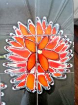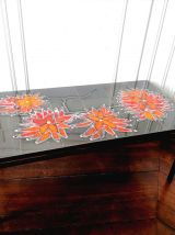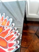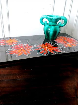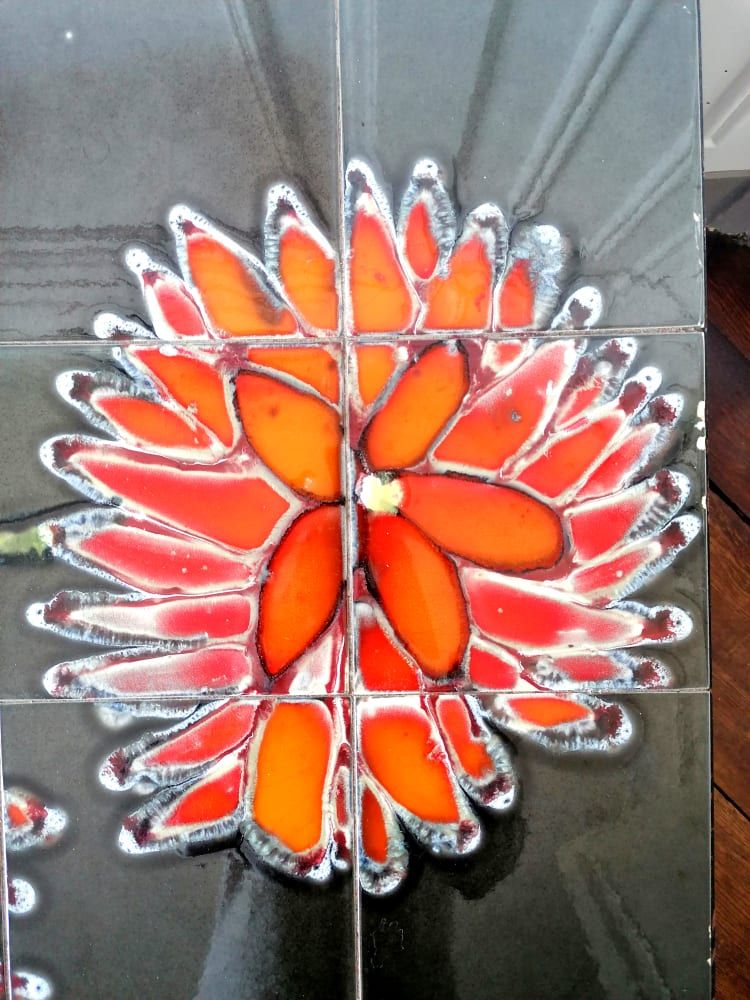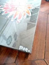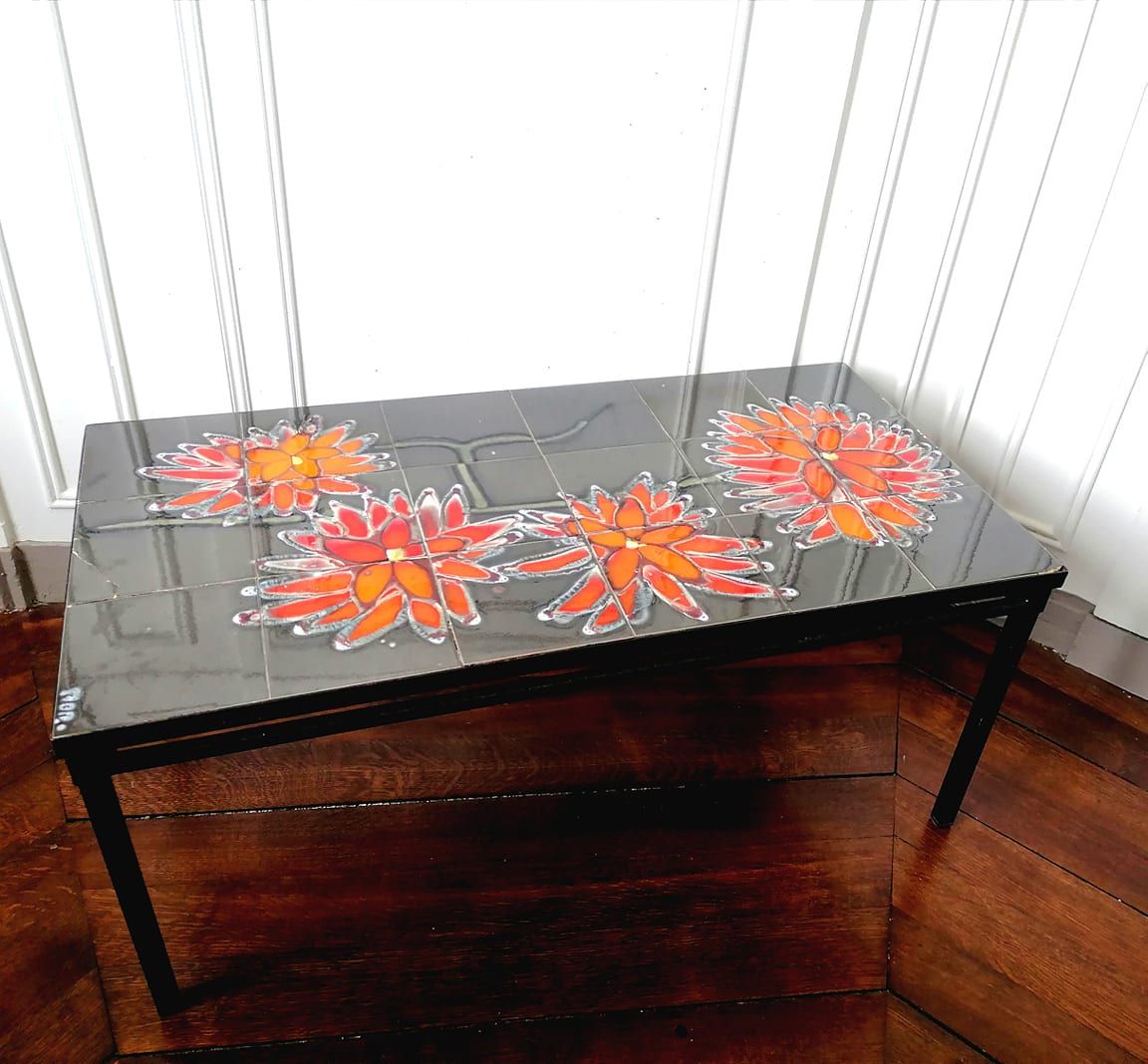 Table basse rectangulaire dont le plateau est composé de carreaux de céramique gris à décor de fleurs orange. Signé Adri en blanc.