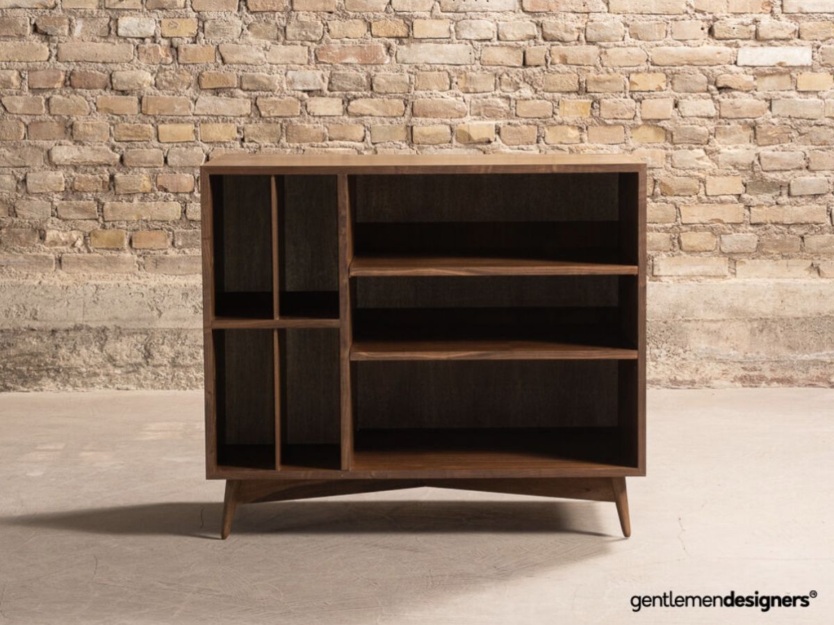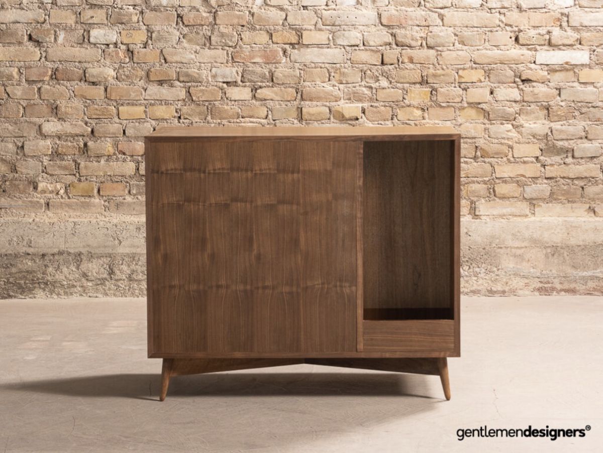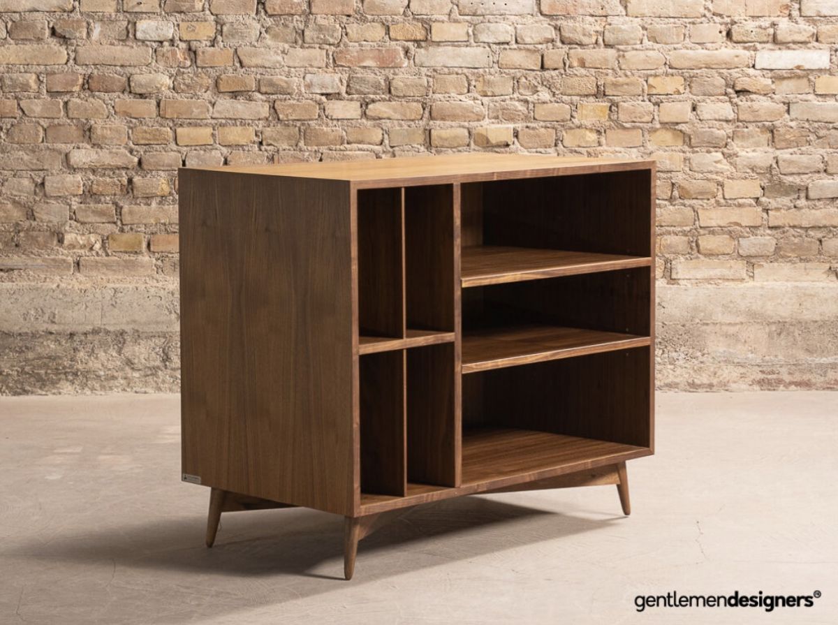 Buffet bas sur-mesure, en noyer, équipé de rangements vinyle