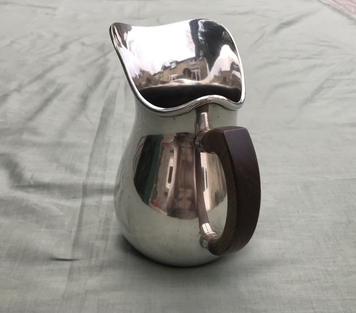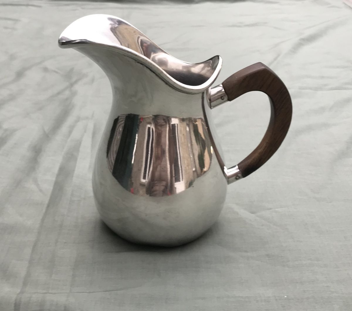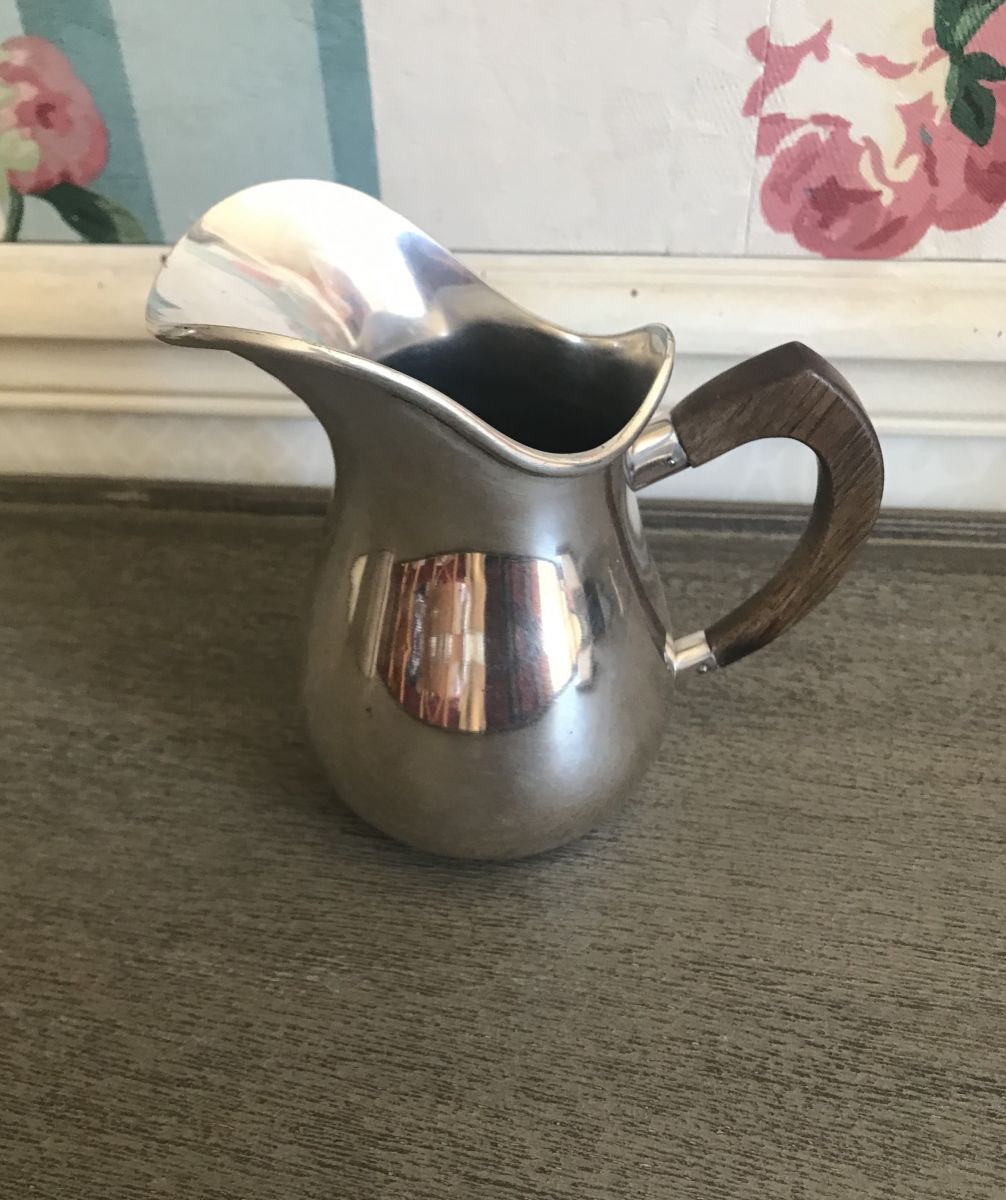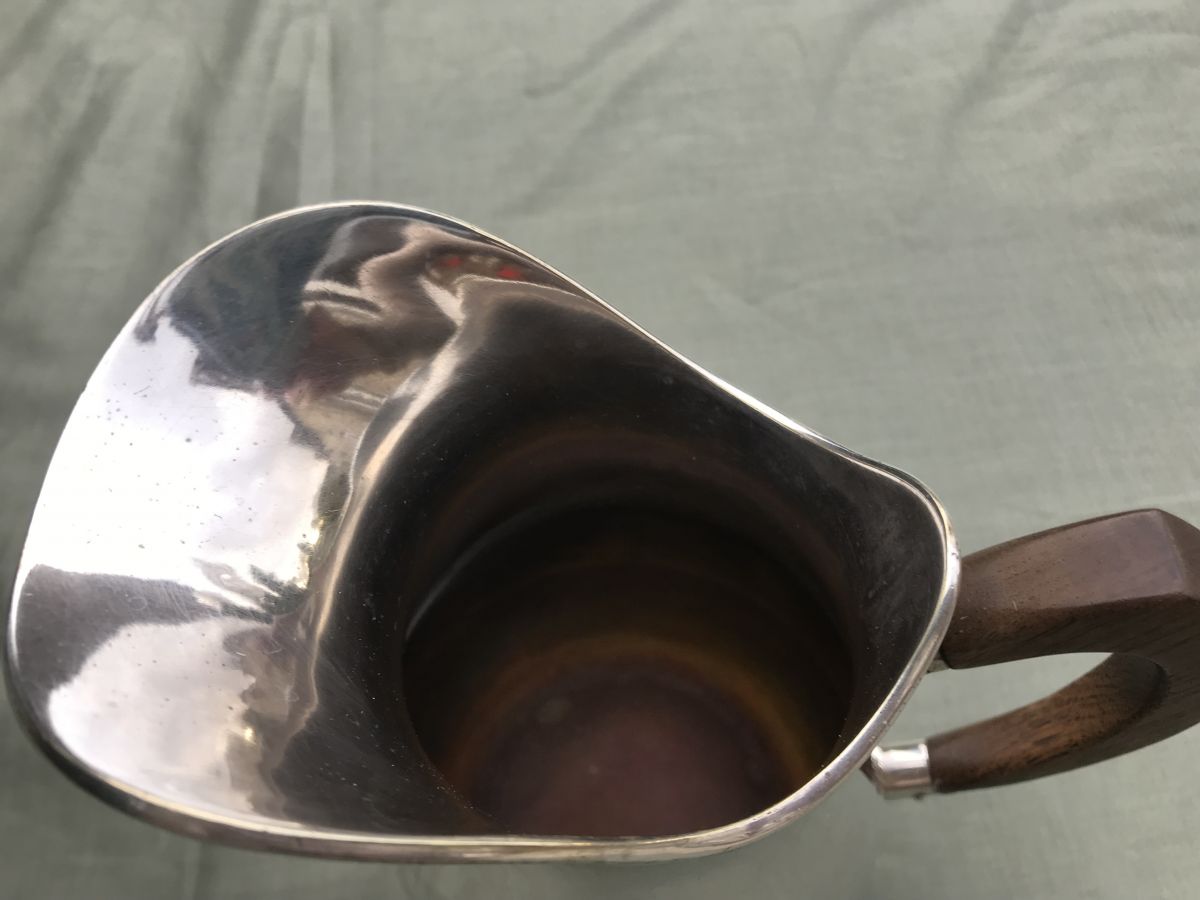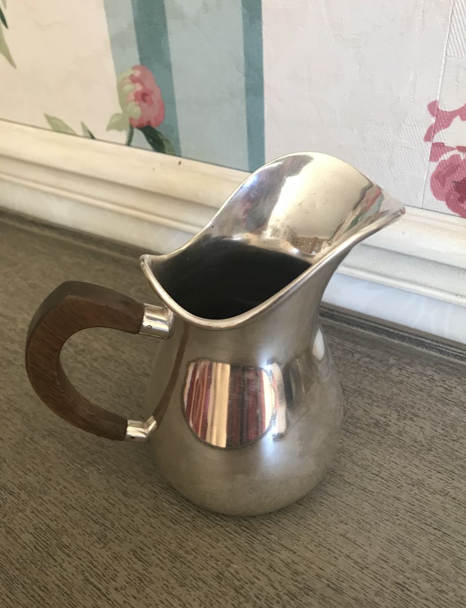 Crémier ou pot à eau en métal argenté français avec anse en bois. Uni, l'espèce de médaillon est un reflet.