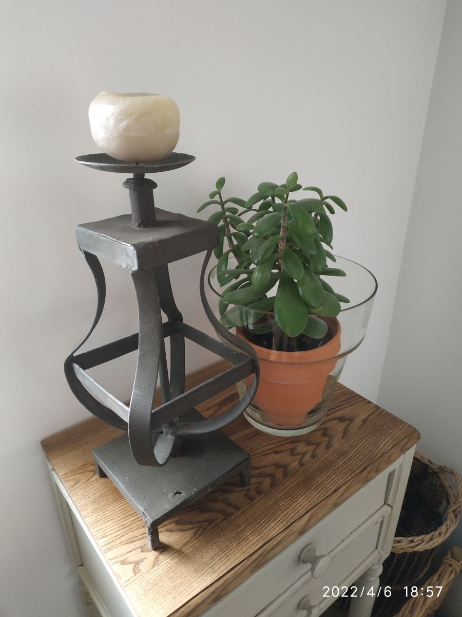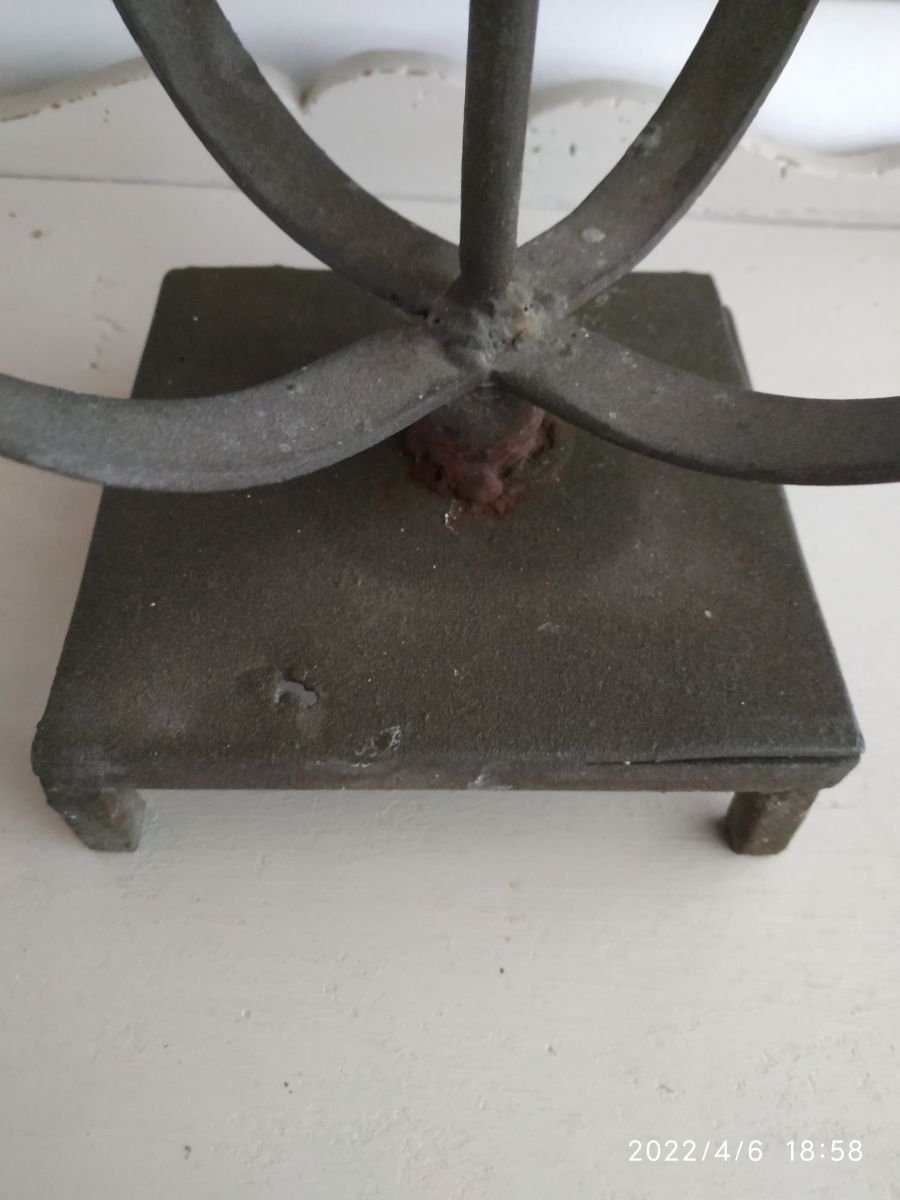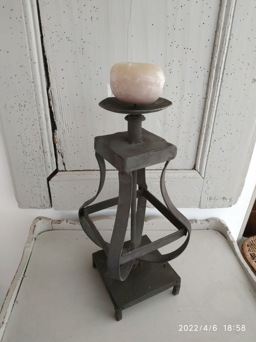 En métal noir mat , porte bougie avec support pour la bougie , sur 4 petits pieds , bon état général , à noter toutefois un petit trou sur la base (voir dernière photo) et quelques traces du temps...