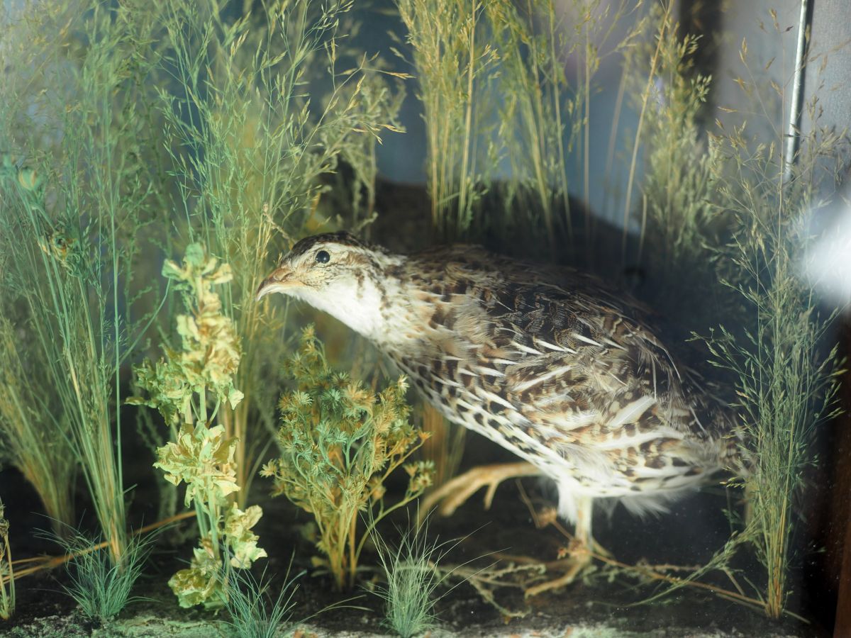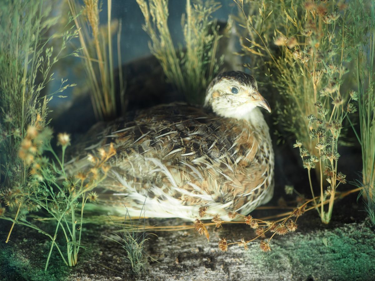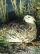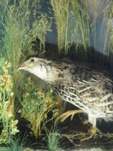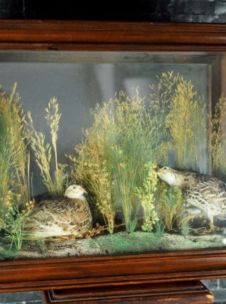 Diorama de deux cailles naturalisées cachées dans les herbes hautes. Travail d'un soin magnifique et d'un naturel percutant, idéal dans tout intérieur de goût : tant pour interpeller dans les intérieurs modernes ou les cabinets de curiosité que pour apporter une touche d'authenticité dans une maison de campagne.