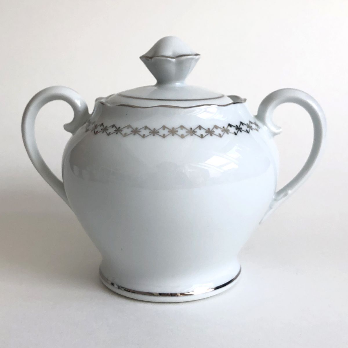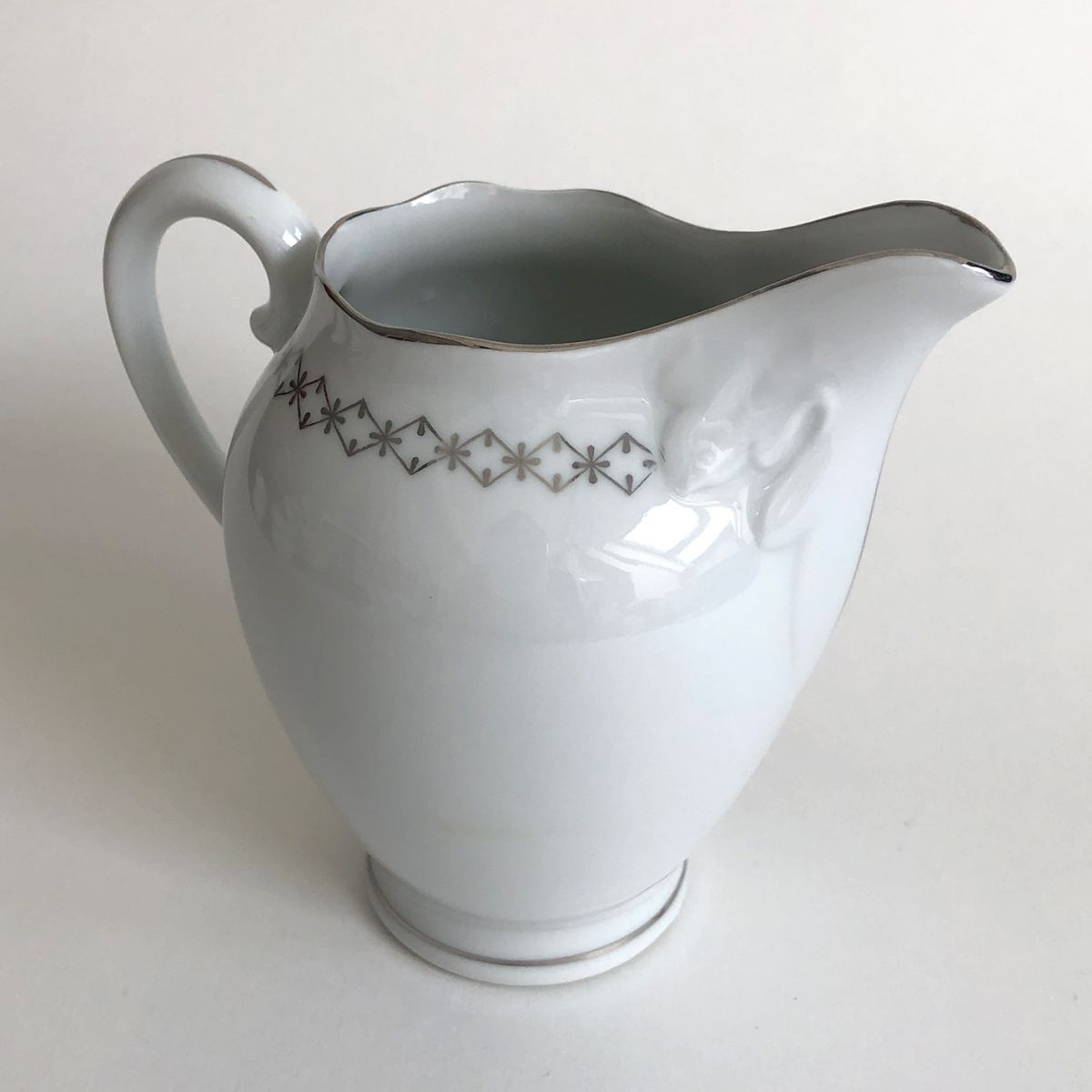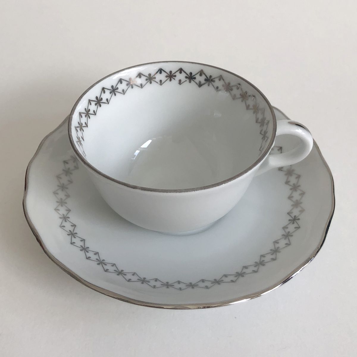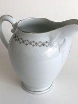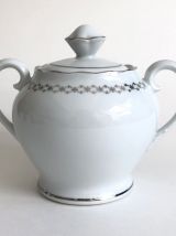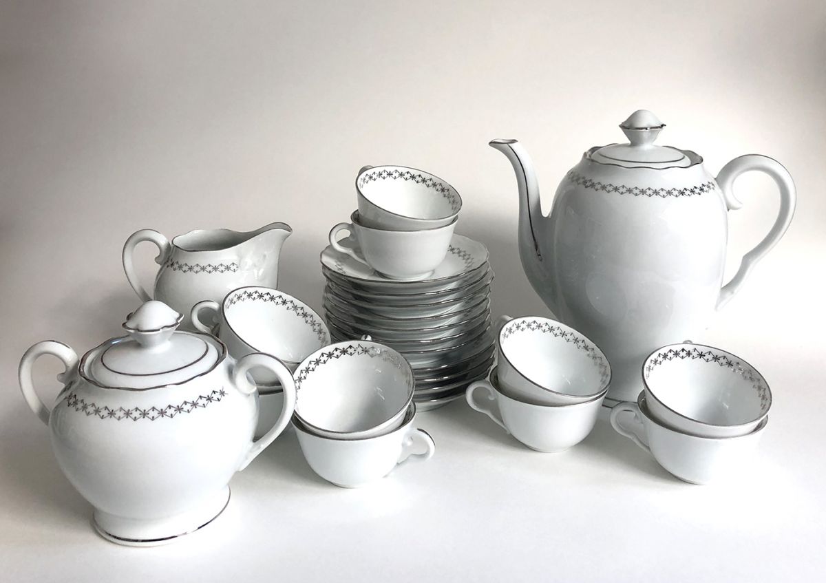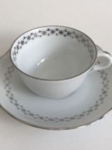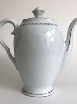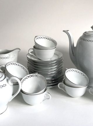 Service à café. Haute porcelaine du Berry. Lourioux. 25 pièces : 11 soucoupes, 11 tasses, 1 cafetière, 1 pot à lait, 1 sucrier. Très bon état. Couleur blanche avec un décor argenté.