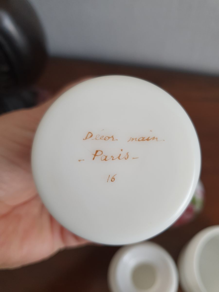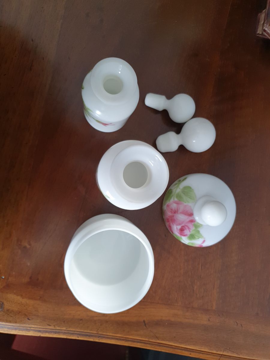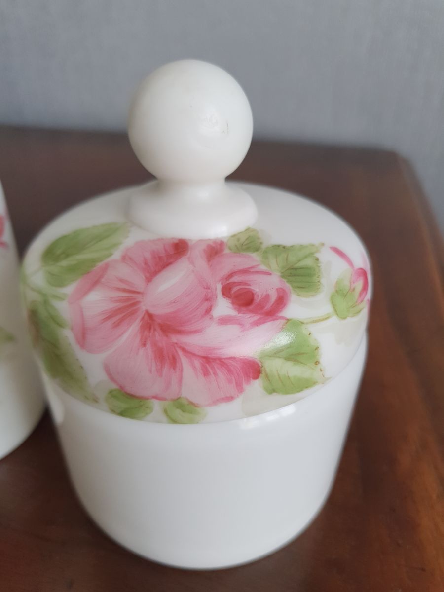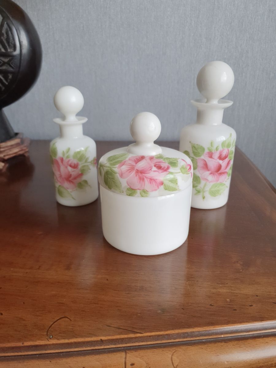 2 Flacons et un pot à poudre De Toilette En opaline de Paris décor de rose vintage.