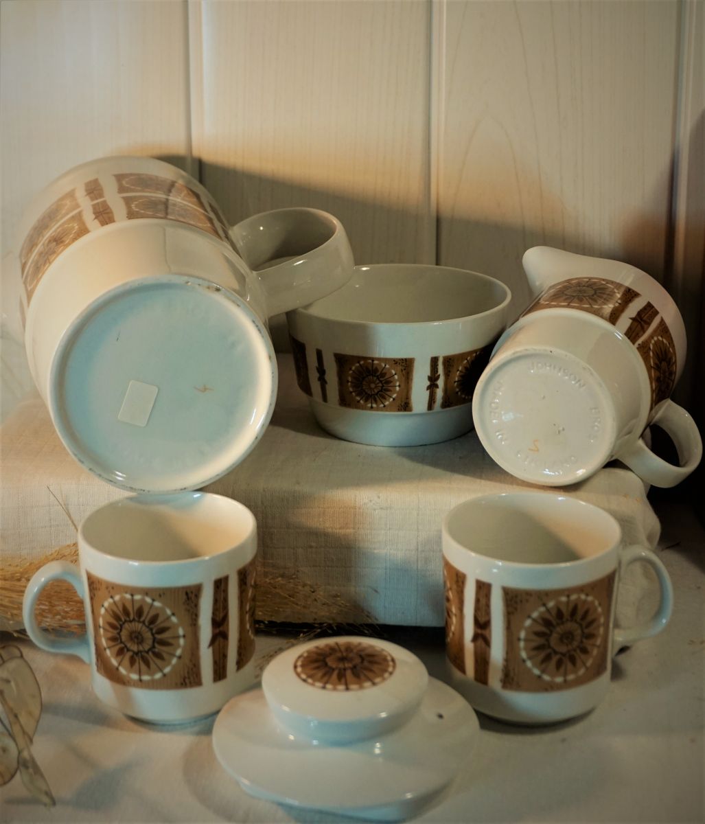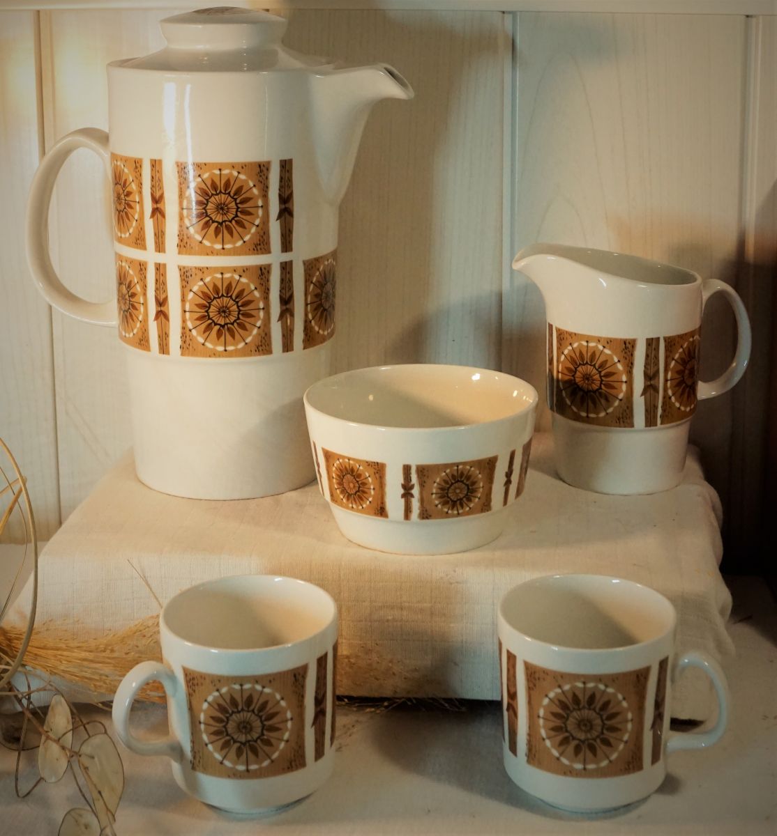 Composé de 5 pièces ce service à café en porcelaine vintage contient 2 tasses, 1 pot à lait 1 grande cafetière, et 1 sucrier. Fabriquer en Angleterre avec de la porcelaine anglaise ce service date des années 1970.