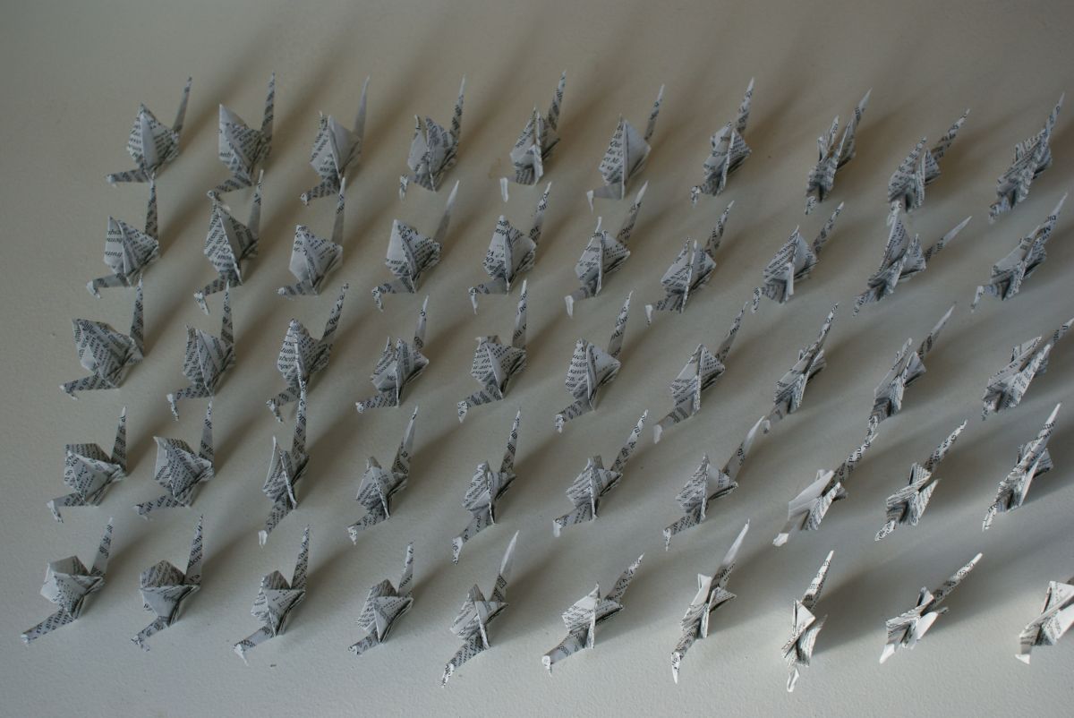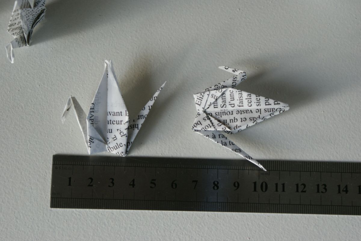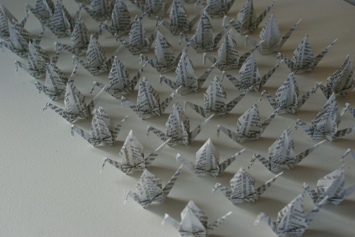 Elles sont réalisées (coupées et pliées) en origami dans du papier issu de vieux livres et les motifs sont donc des mots aléatoires