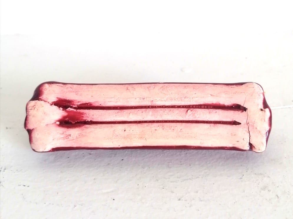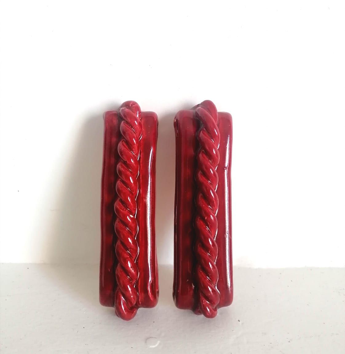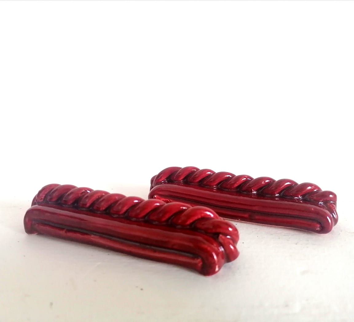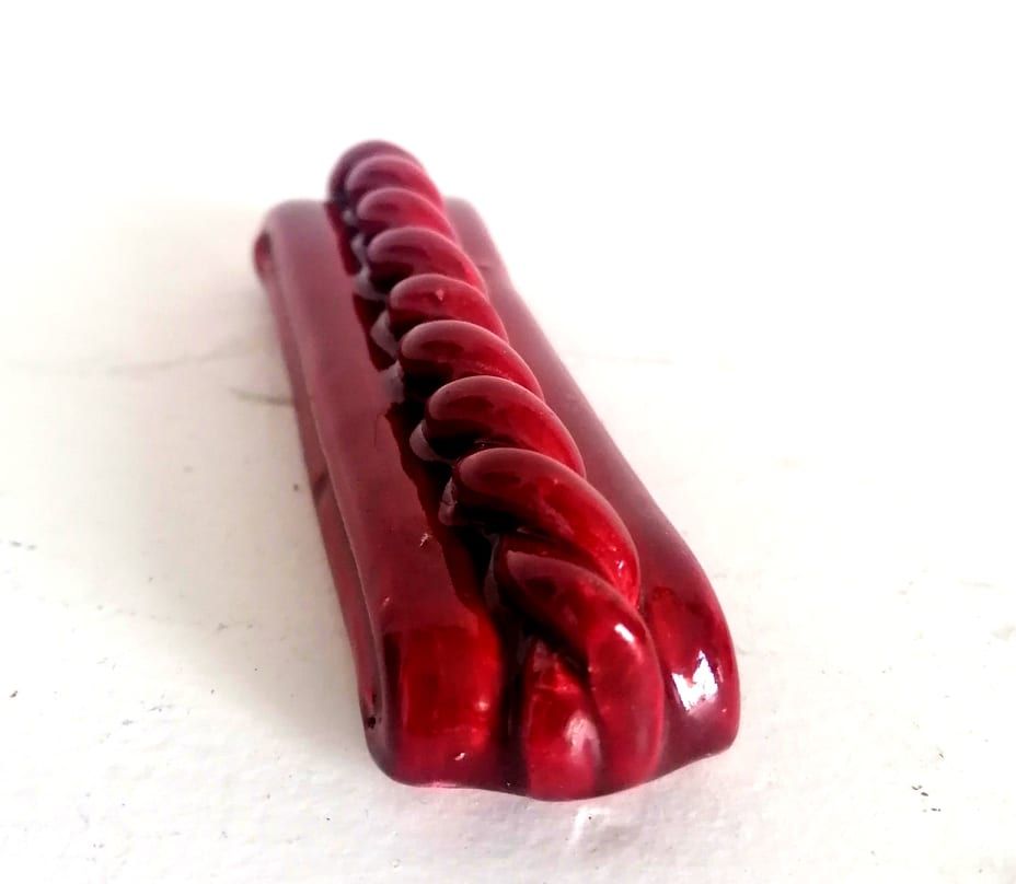 Céramique émaillée rouge , motif de torsades sur le dessus.