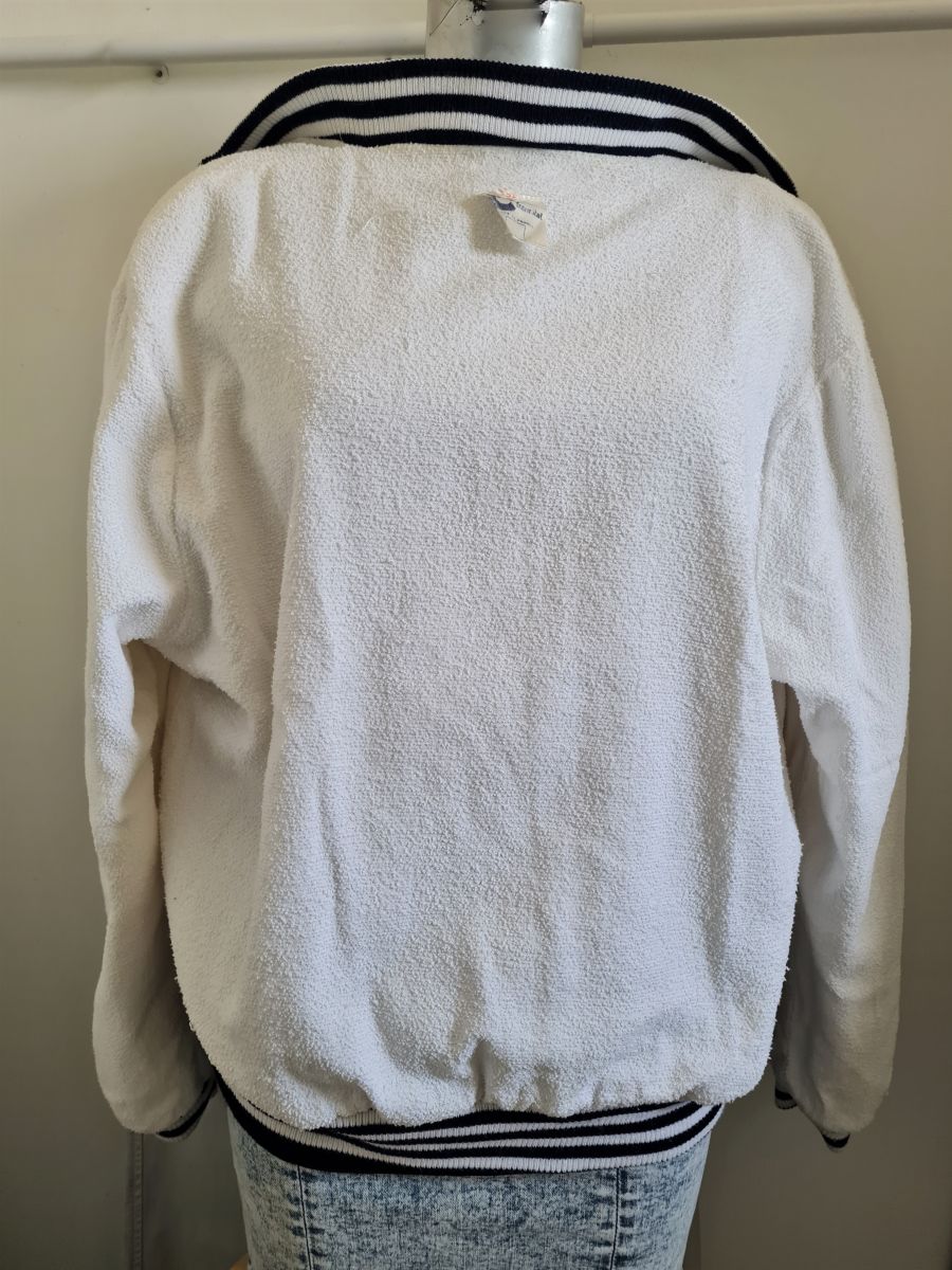 ✔ finition côtelé rayé bleu / blanc au col, poignets et bas