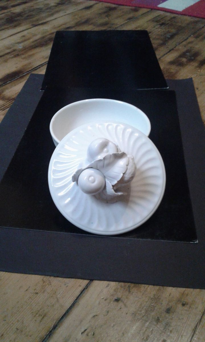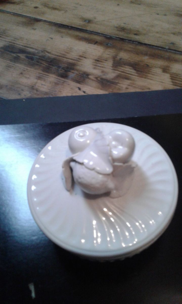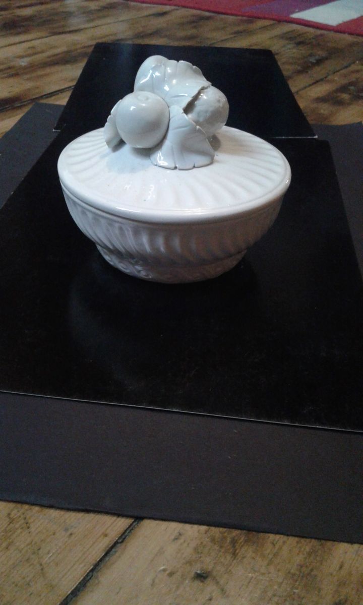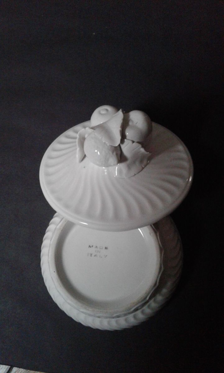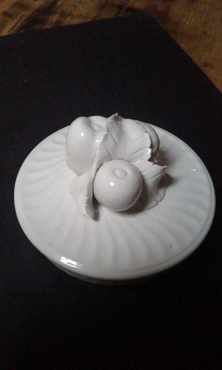 Bonboniere en ceramique provenance avec jolie décor fruitiers à noté petit éclat email à l intérieur du couvercle et le tour de la coupelle elle mesure 23 cm de diamètre
