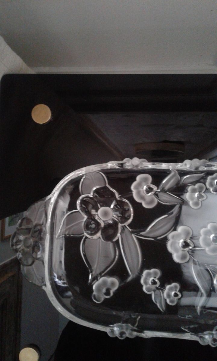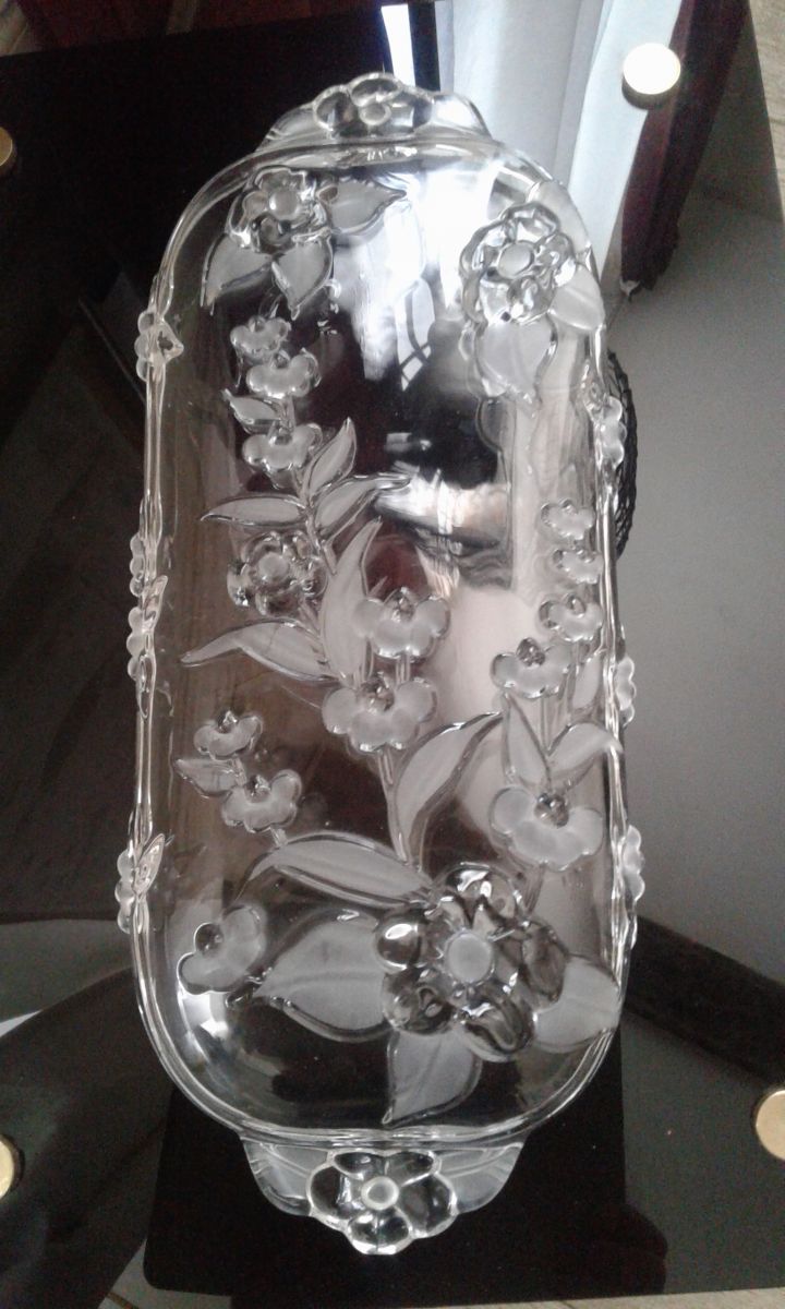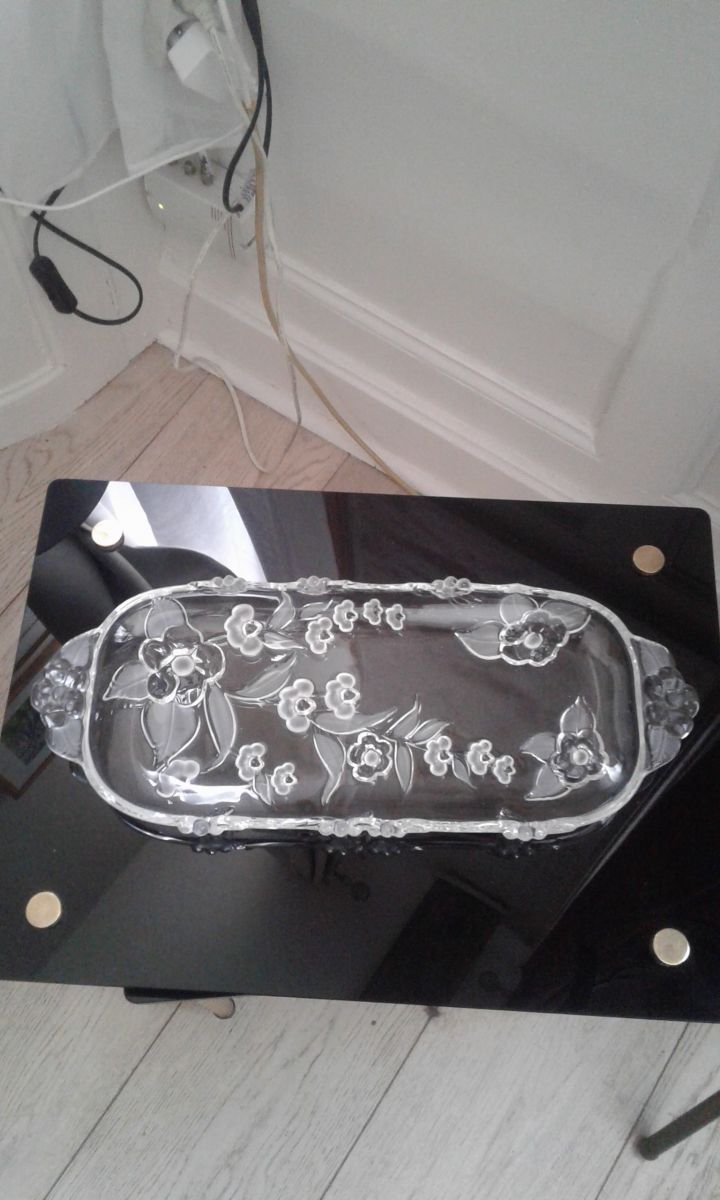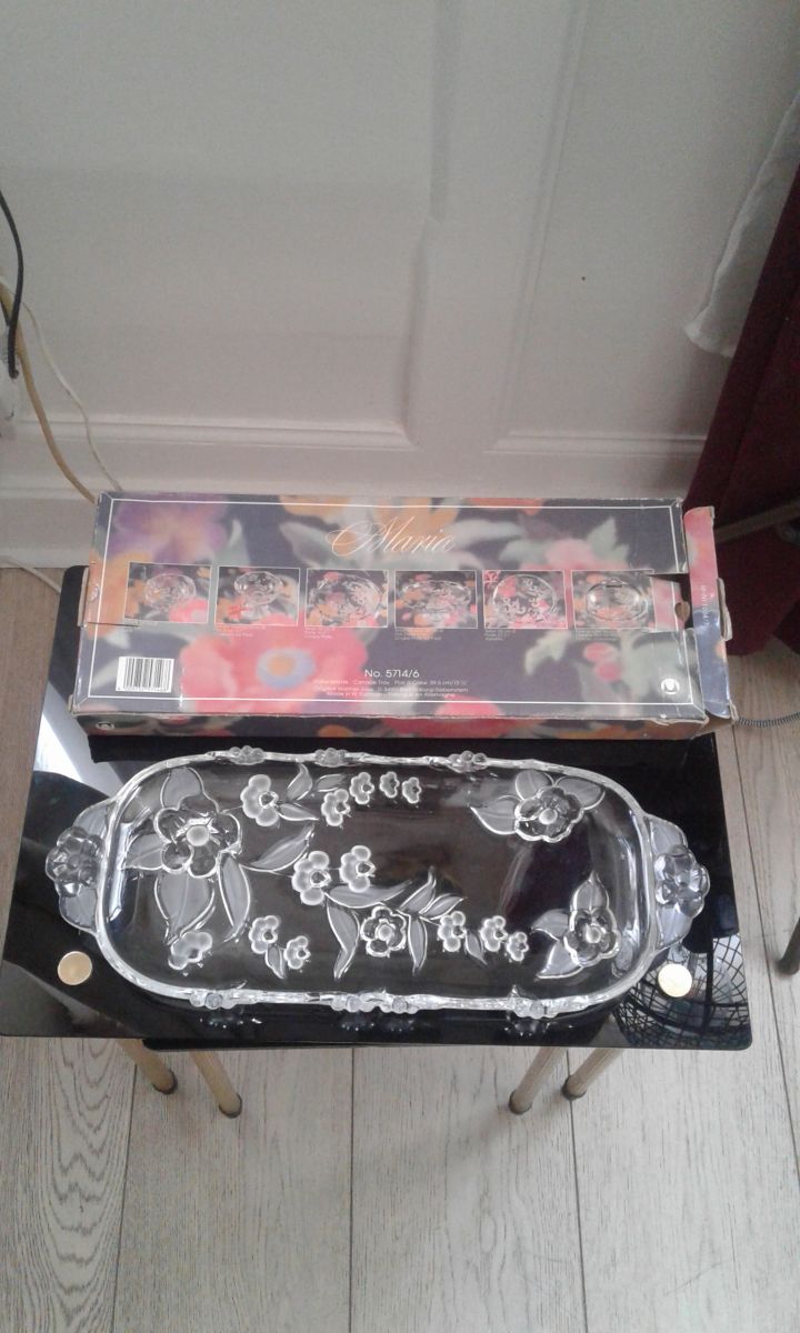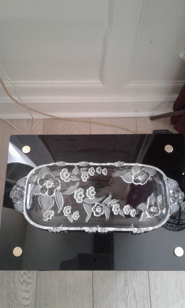 Plat a cake en verre crytal allemand année 80 dans sa boite d origine le decort floral du plat est en relief il mesure 39 cm de longueur est 16 de hauteur pois 600 grammes.