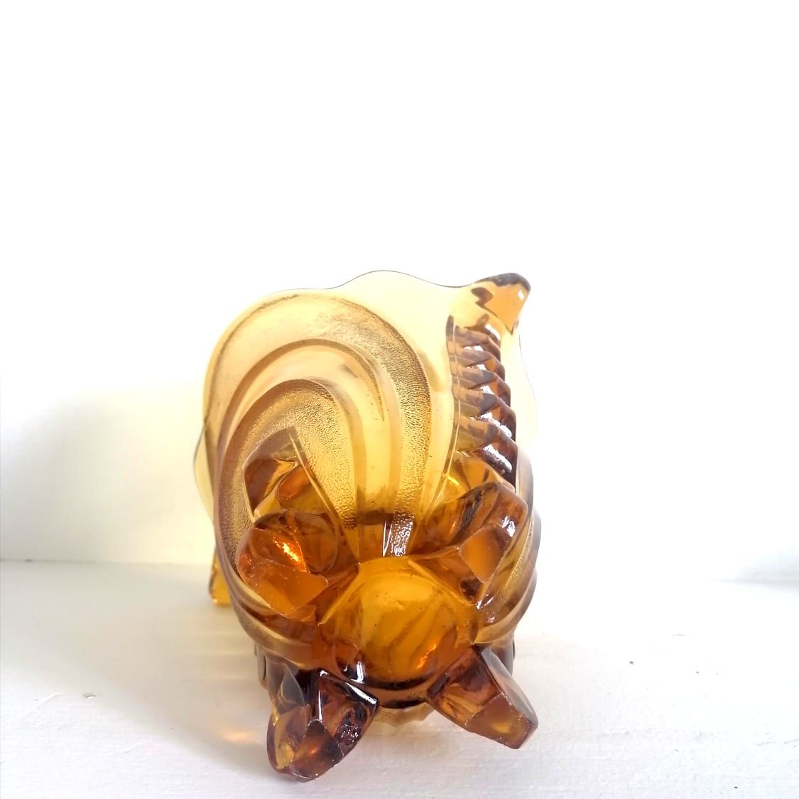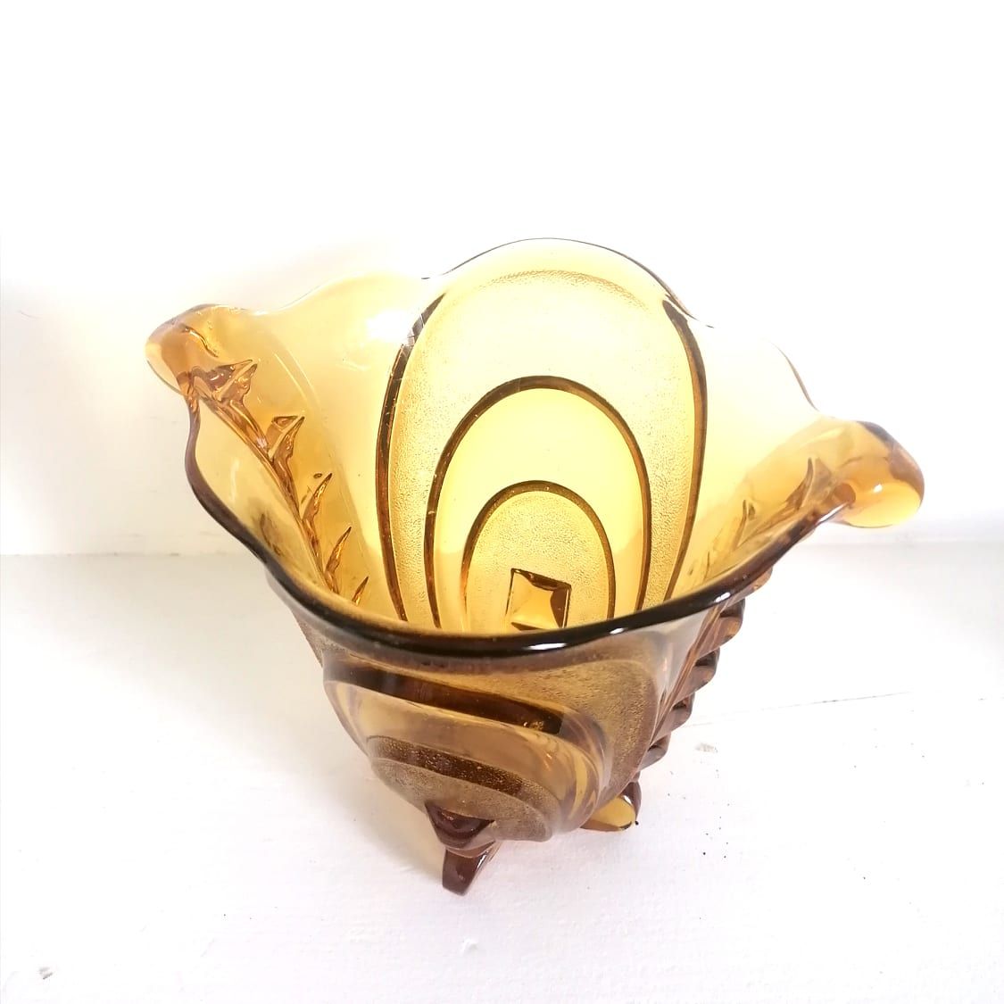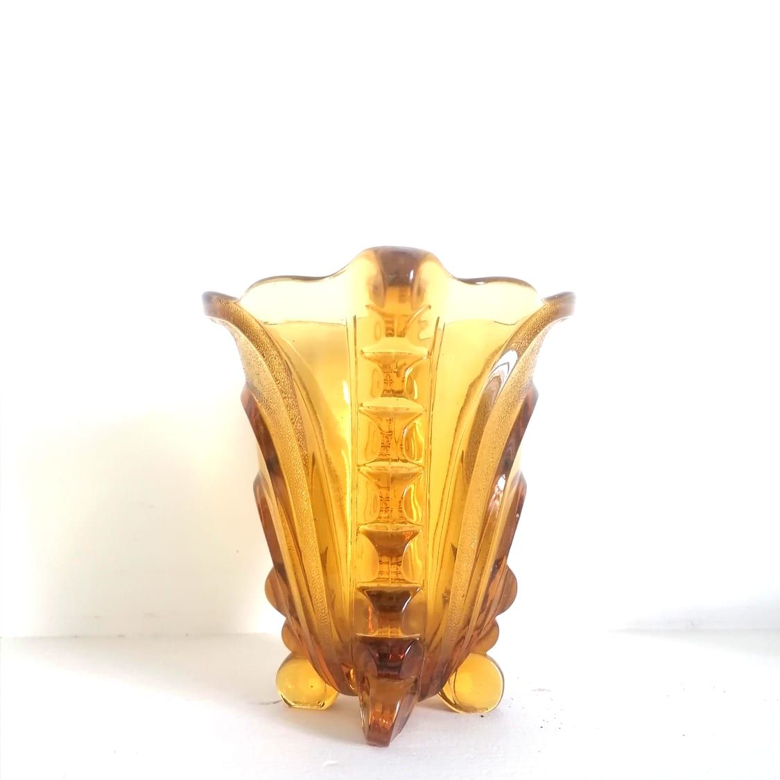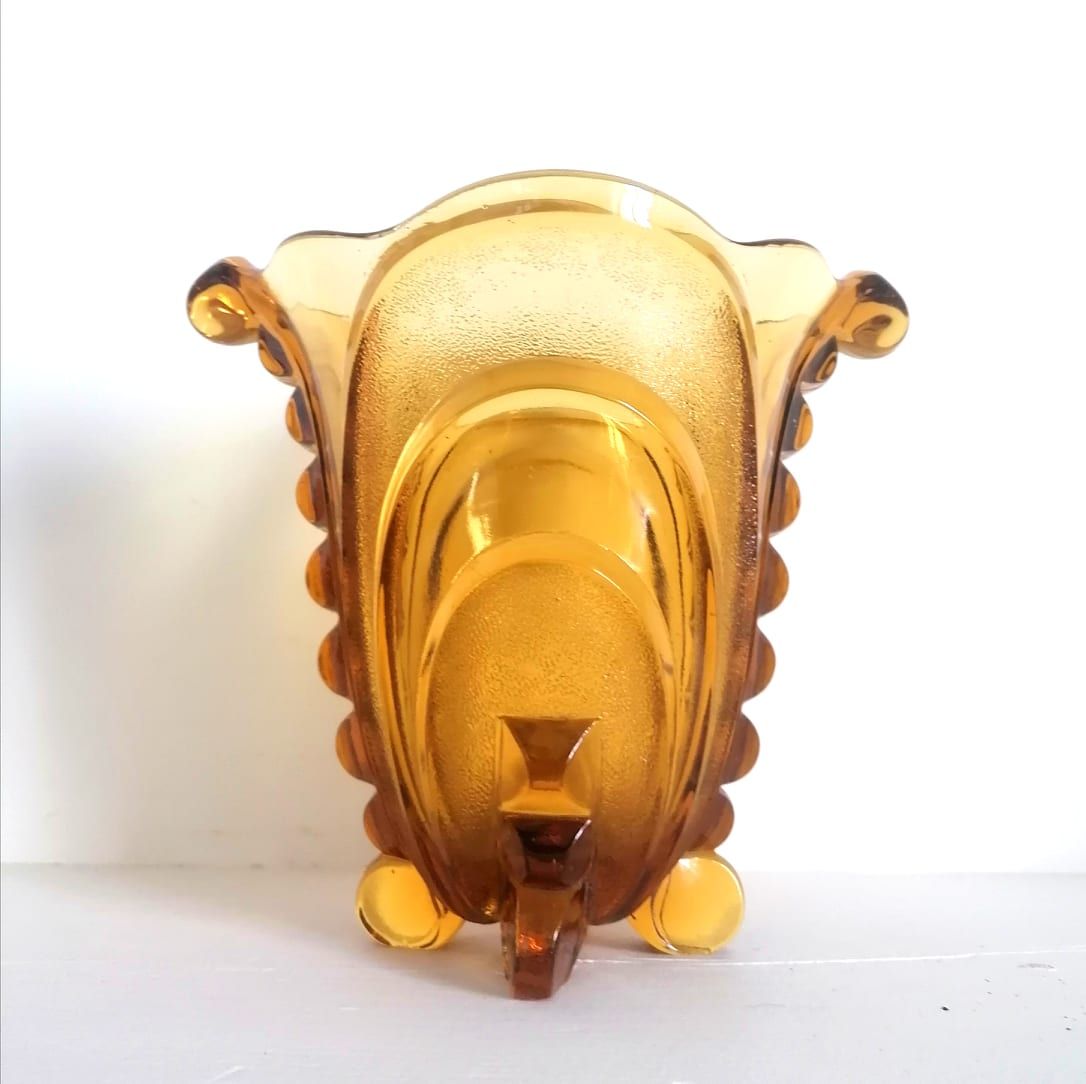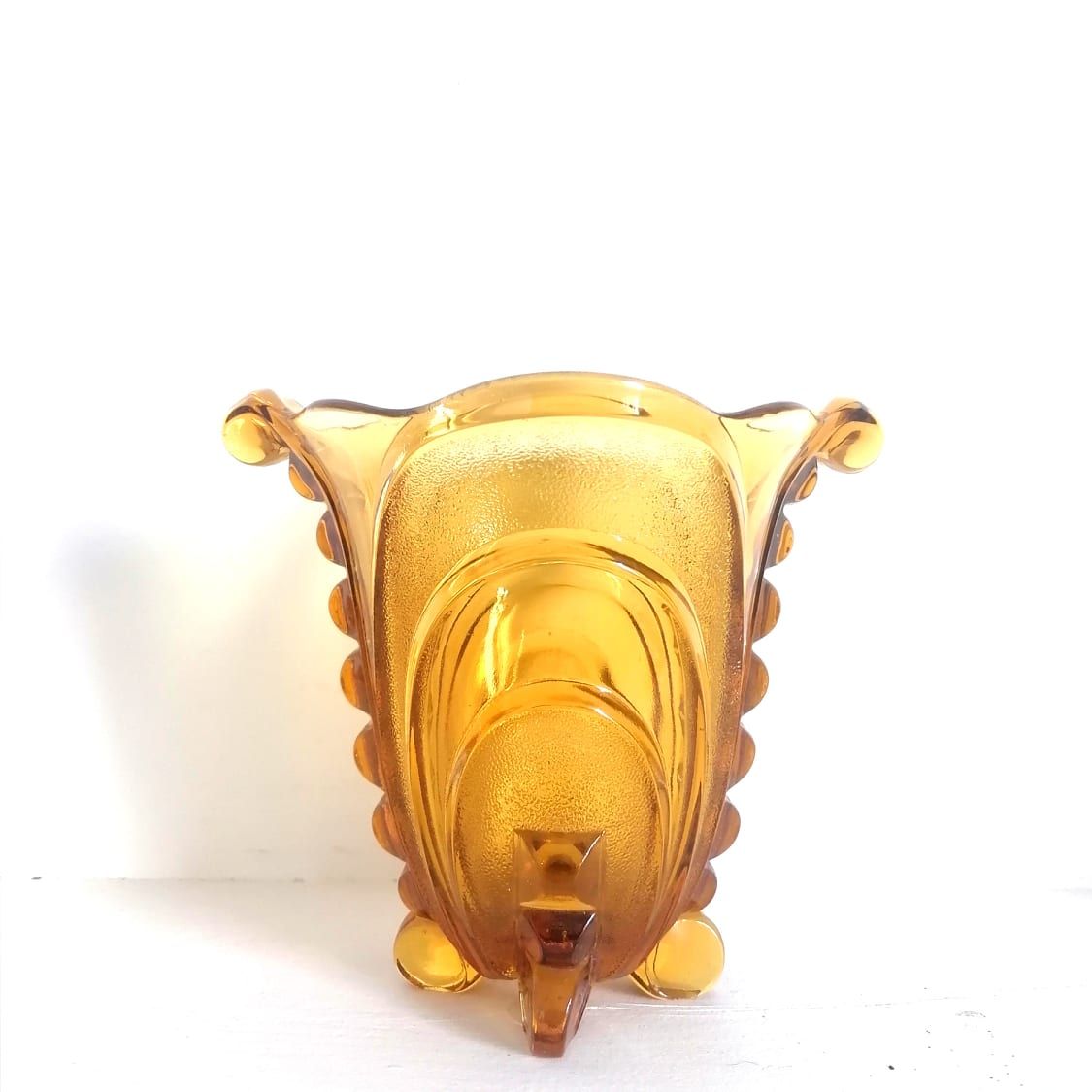 Vase à grand col évasé, reposant sur quatre pieds arrondis, en verre moulé de couleur ambré.