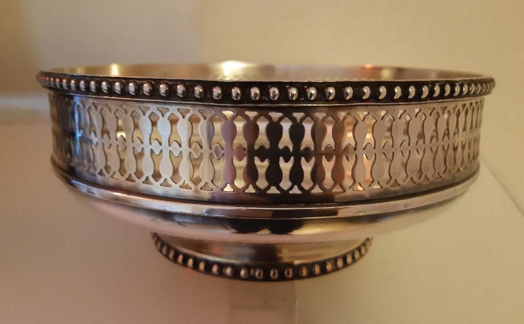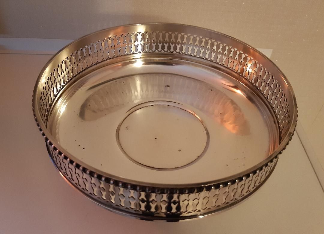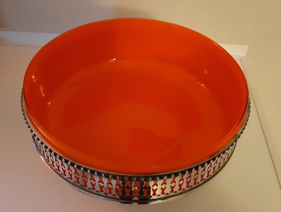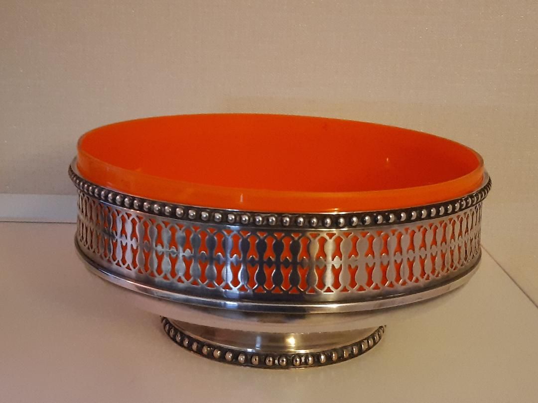 Très jolie coupe, année 1920-30, stylée, sur pied, en métal argenté ajouré et motif « perle" (poinçons « RM – 12 »), avec coupelle verre orange. Diamètre 21.5 cm, hauteur 10 cm. Très bon état sans aucune trace de choc.