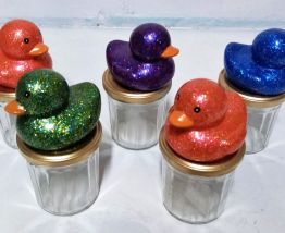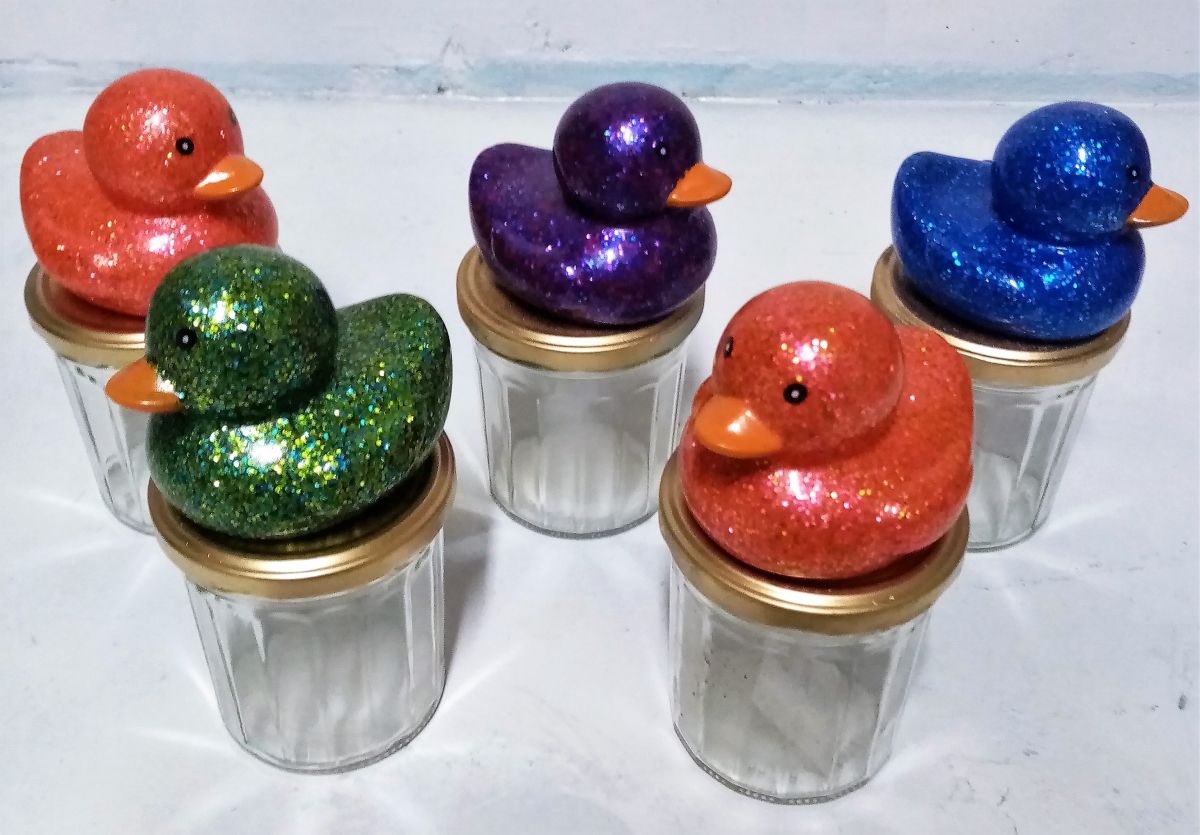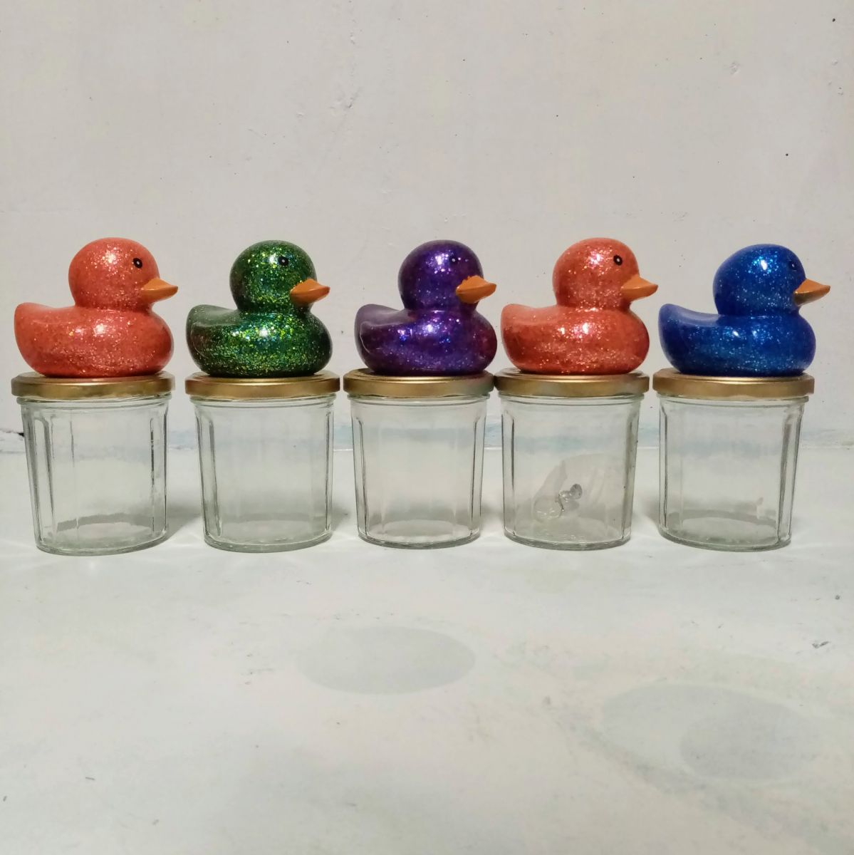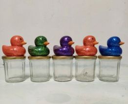Sur les couvercles des bocaux, on a fixé des canards à paillettes multicolores après les avoir peint de plusieurs couches de doré et vernis. Ils seraient jolis dans l'intérieur d'une adepte des canards tout autant qu'utiles!