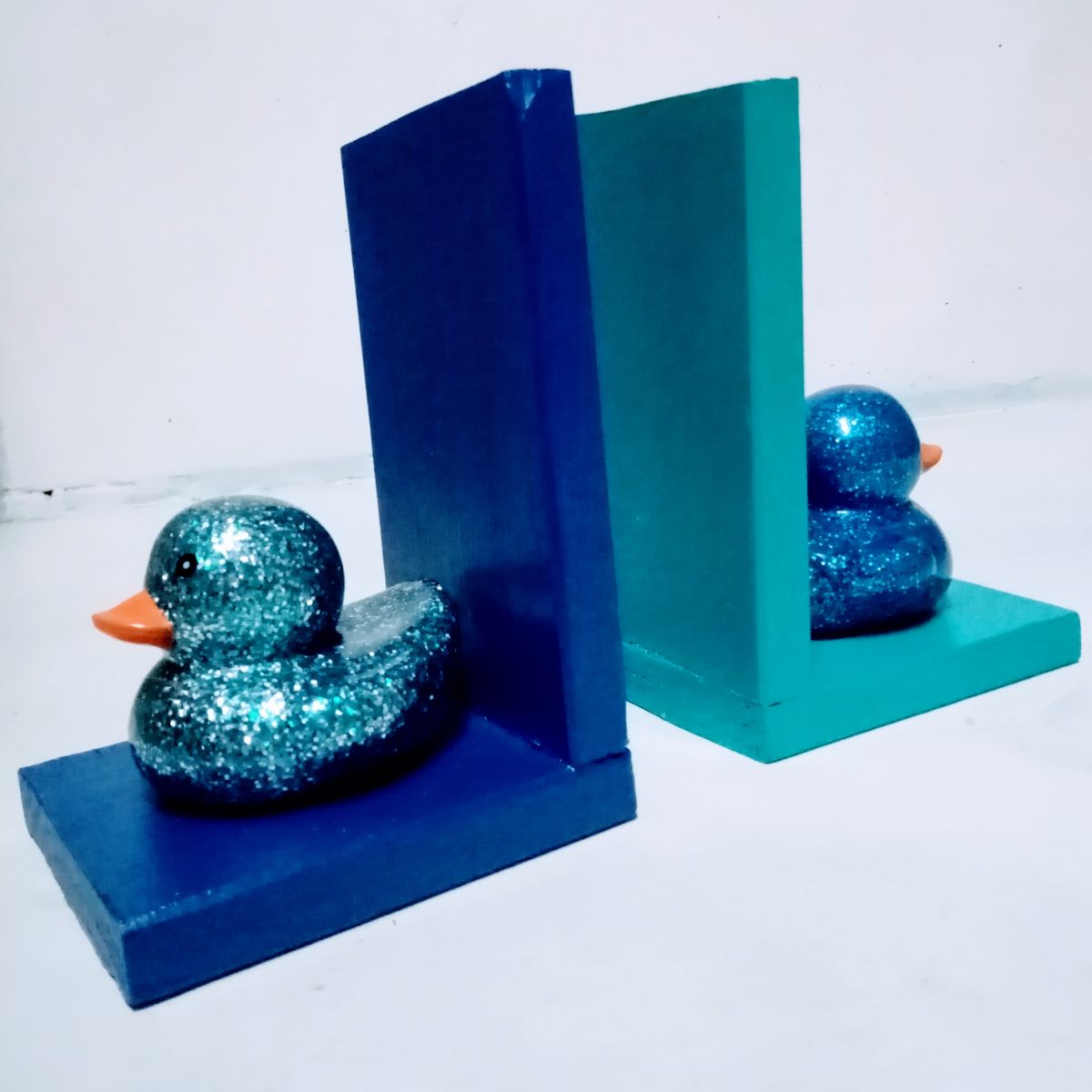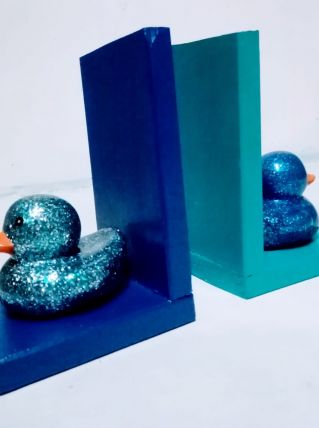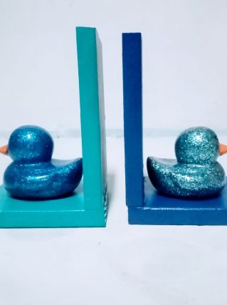 Voici un ensemble de 2 serre livres en bois peint et vernis, à la fois utiles et amusants. Cette paire de serre-livres aux figurines de canards bleus scintillants sont complémentaires. A la fois pratiques et décoratifs, ces serre-livres mettront de la couleur sur les étagères des enfants ou des adultes et de l'ordre dans les livres de chacun.