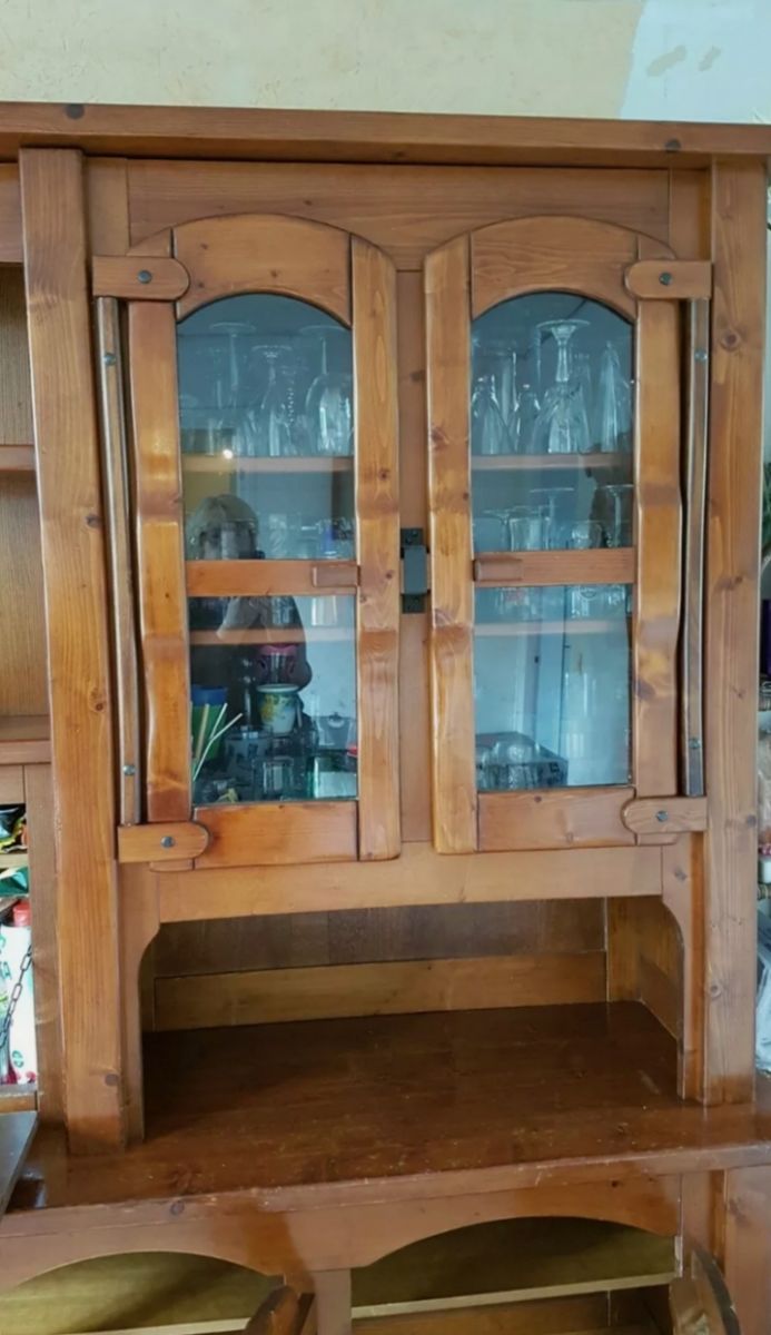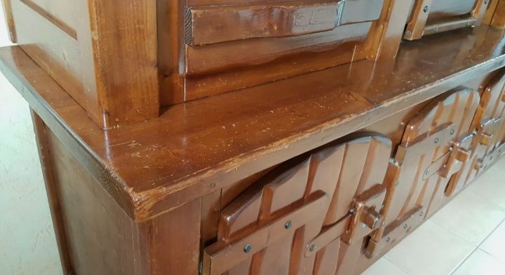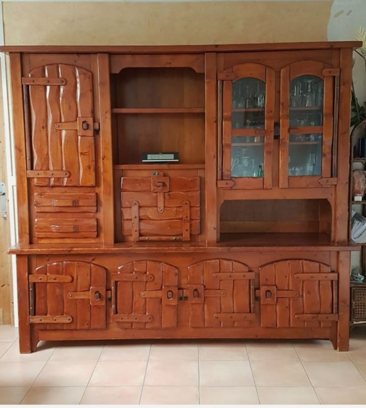 La partie haute hors plateau se sépare du bas: la partie droite avec la vitrine d'un côté et la partie gauche avec du rangement de l'autre . Au centre, ce sont des étagères et un caisson avec porte à mécanisme vertical et chaînes comme un pont- levis.
