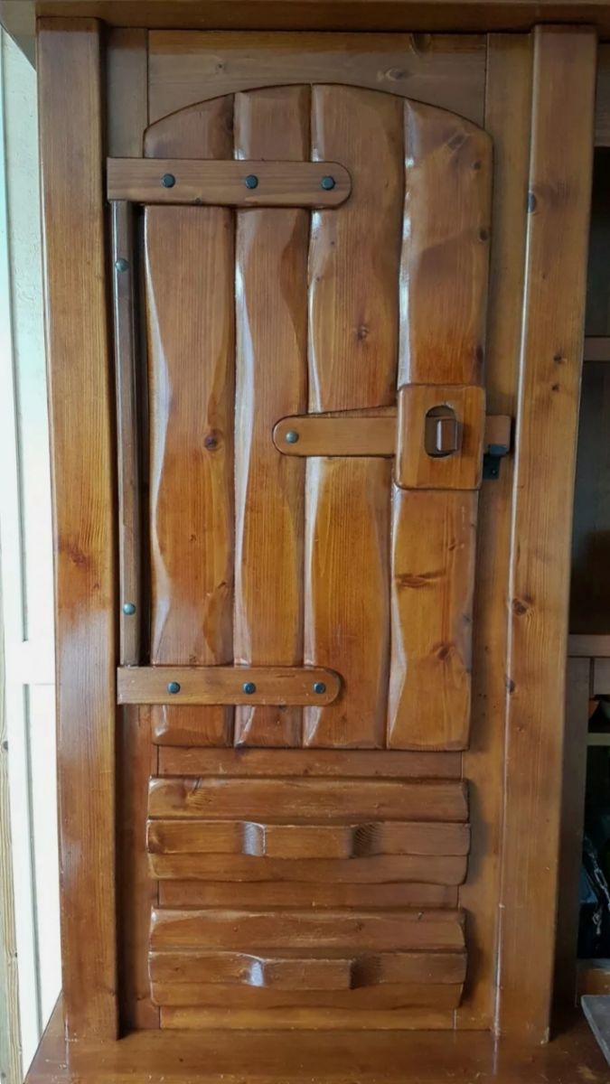Meuble living original en bois massif avec design façon tonneau et loquets (système d'ouvertures /fermetures) en bois et fer forgé.