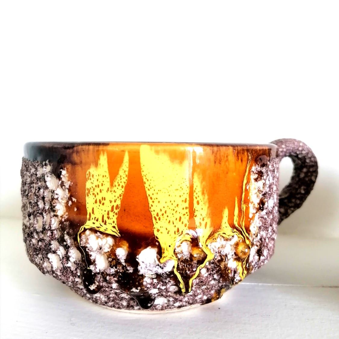 Paire de tasses à déjeuner en céramique façon "fat lava" ou "écume de mer". Décor marron et blanc, et émaillage par coulures sur le devant de couleur jaune pour l'une, rouge pour la seconde.